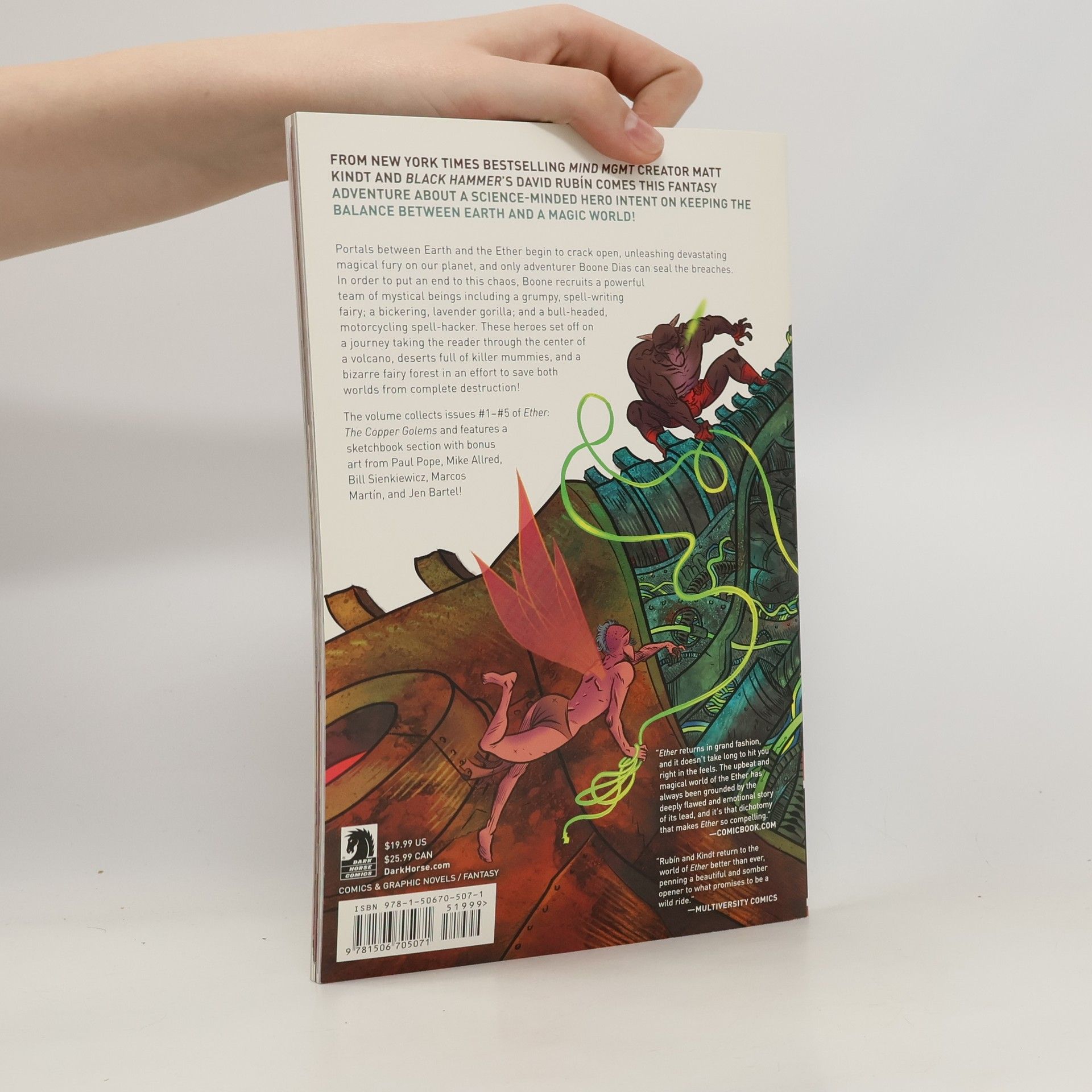 From New York Times bestselling Mind MGMT creator MATT KINDT and Black Hammer's DAVID RUBÍN comes this fantasy adventure about a science-minded hero intent on keeping the balance between Earth and a magic world! Portals between Earth and the Ether begin to crack open unleashing devastating magical fury on our planet and only adventurer Boone Dias can seal the breaches. In order to put an end to this chaos, Boone recruits a powerful team of mystical beings including a grumpy, spell-writing fairy; a bickering, lavender gorilla; and a bull-headed, motorcycling, spell-hacker. These heroes set off on a journey taking the reader through the center of volcanoes, deserts full of living mummies and sphinxes, and a bizarre fairy forest in an effort to save both worlds from complete destruction! Collecting issues #1-5 of Ether series II and featuring a sketchbook section with bonus art from PAUL POPE, MIKE ALLRED, BILL SIENKIEWICZ, MARCOS MARTÍN and JEN BARTEL!