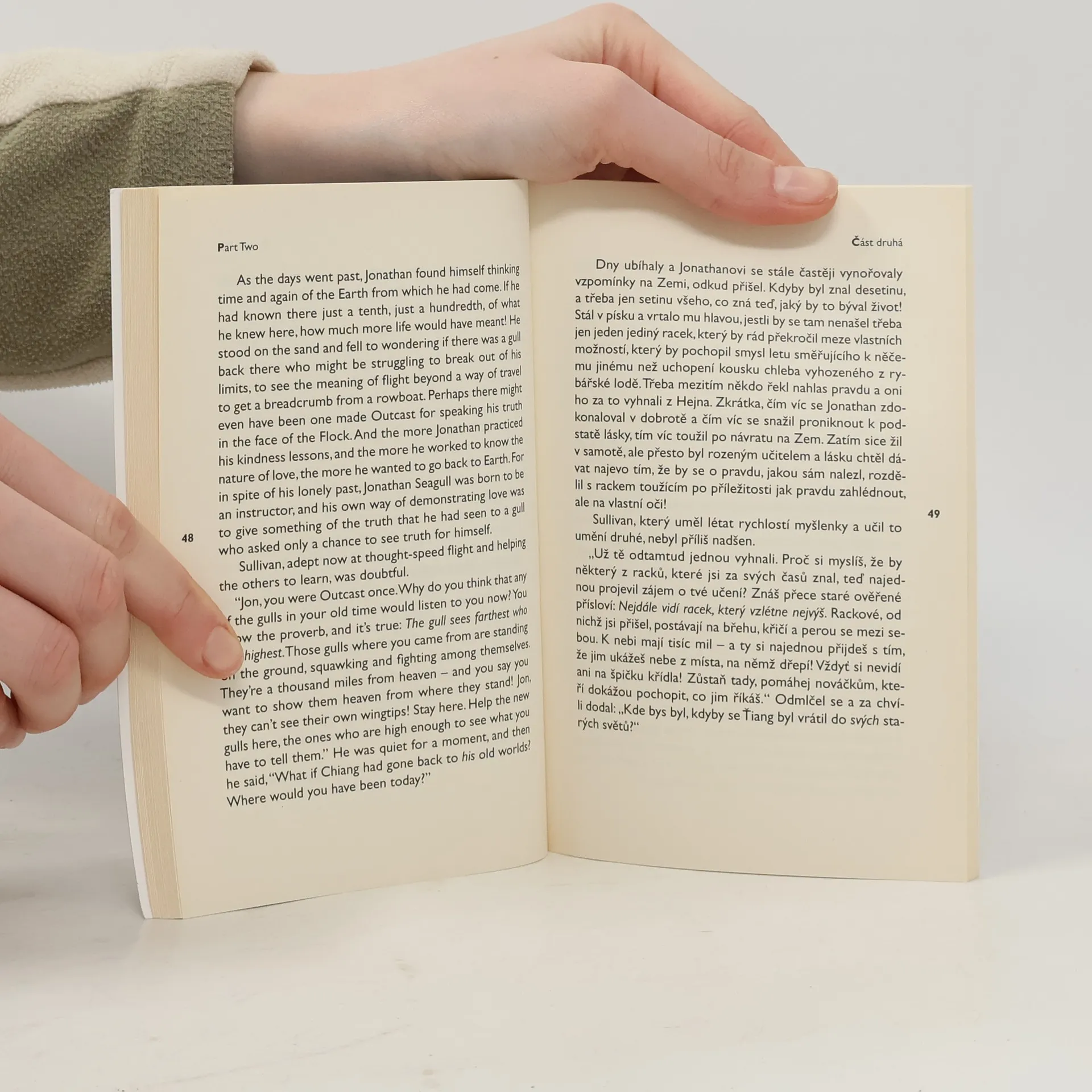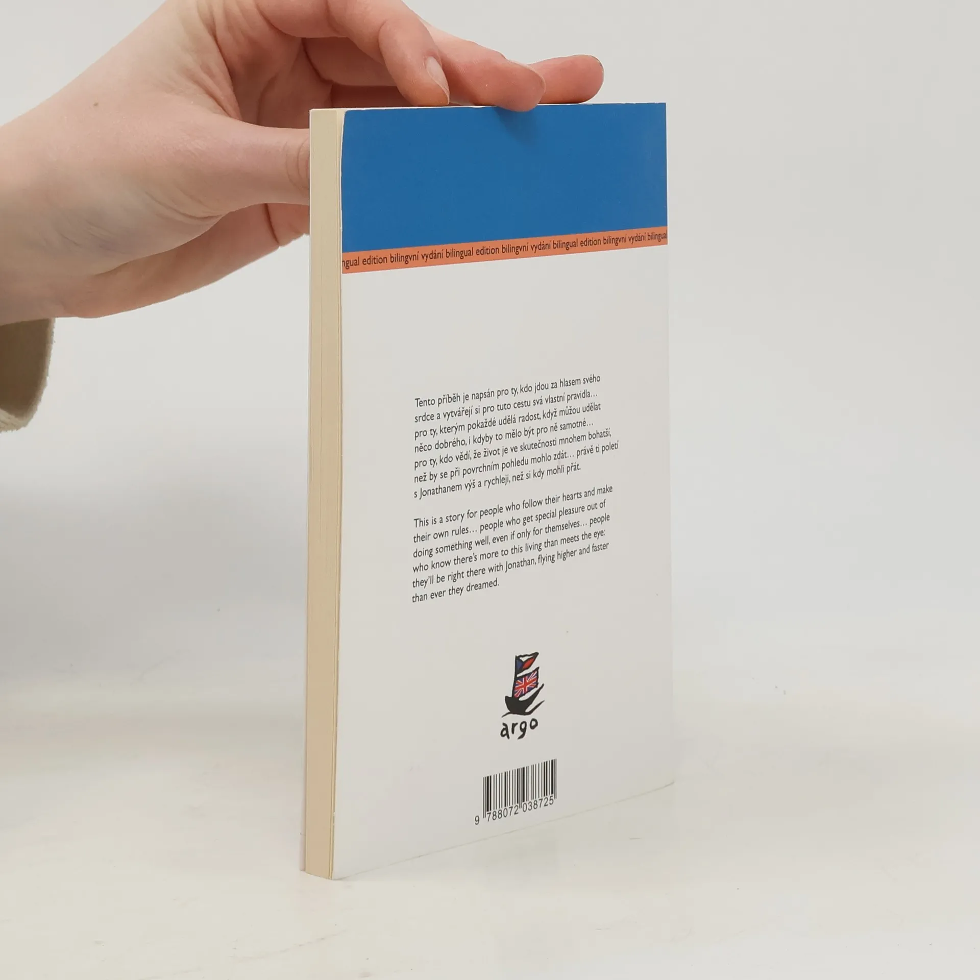 Dvojjazyčné vydání novely současného amerického spisovatele o racku Jonathanovi je podobenstvím o lidech-ptácích toužících po poznání a naplnění života, po lásce, svobodě a volnosti. Ani po téměř čtyřiceti letech od svého vzniku neztratila nic na síle a kráse. Tento příběh je napsán pro ty, kdo jdou za hlasem svého srdce a vytvářejí si svá vlastní pravidla... pro ty, které pokaždé potěší, když můžou udělat něco dobrého, i kdyby to mělo být pro ně samotné... pro ty, kdo vědí, že život je ve skutečnosti mnohem bohatší, než by se při povrchním pohledu mohlo zdát... právě ti poletí s Jonathanem výš a rychleji, než si kdy mohli přát.
