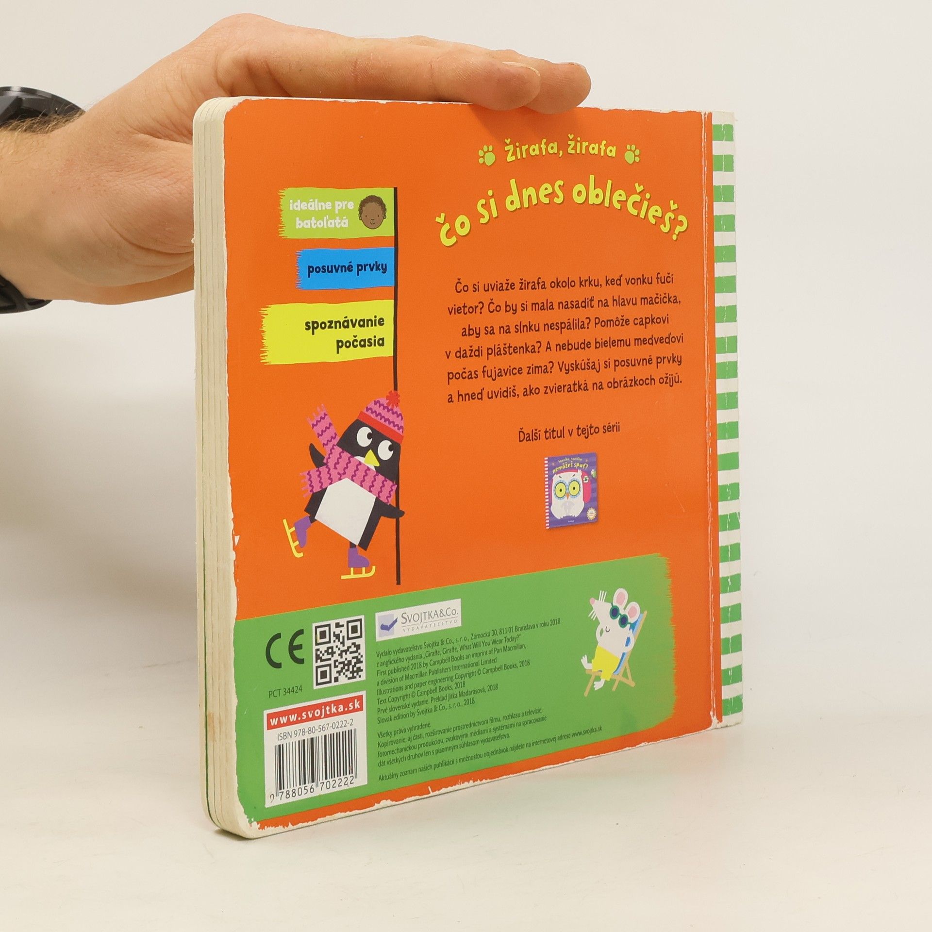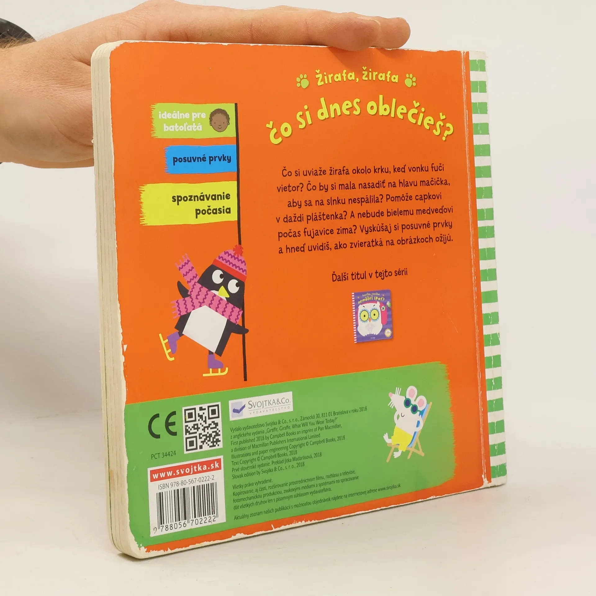 Ako sa zvieratká oblečú, keď fúká vietor, prší, svieti slnko alebo sneží? Ideálne prvé čítanie pre batoľatá, obsahuje posuvné prvky a hravé veršíky. Čo si uviaže žirafa okolo krku, keď vonku fučí vietor? Čo by si mala nasadiť na hlavu mačička, aby sa nespálila na slnku? Pomôže capkovi v daždi pláštenka? A nebude bielemu medveďovi počas fujavice zima? Vyskúšaj si posuvné prvky a hneď uvidíš, ako zvieraktá na obrázkoch žijú. Zábavné prvé čítanie – ideálne pre batoľatá, obsahuje posuvné prvky, množstvo vtipných zvierat a hravých veršov. Táto knižka je výborná na prvé chvíle spoločného čítania a smiechu nad veselými pohyblivými obrázkami plnými zábaviek. Navyše nenásilnou formou učí deti o striedaní štyroch ročných období, zmenách počasia a správnom obliekaní.