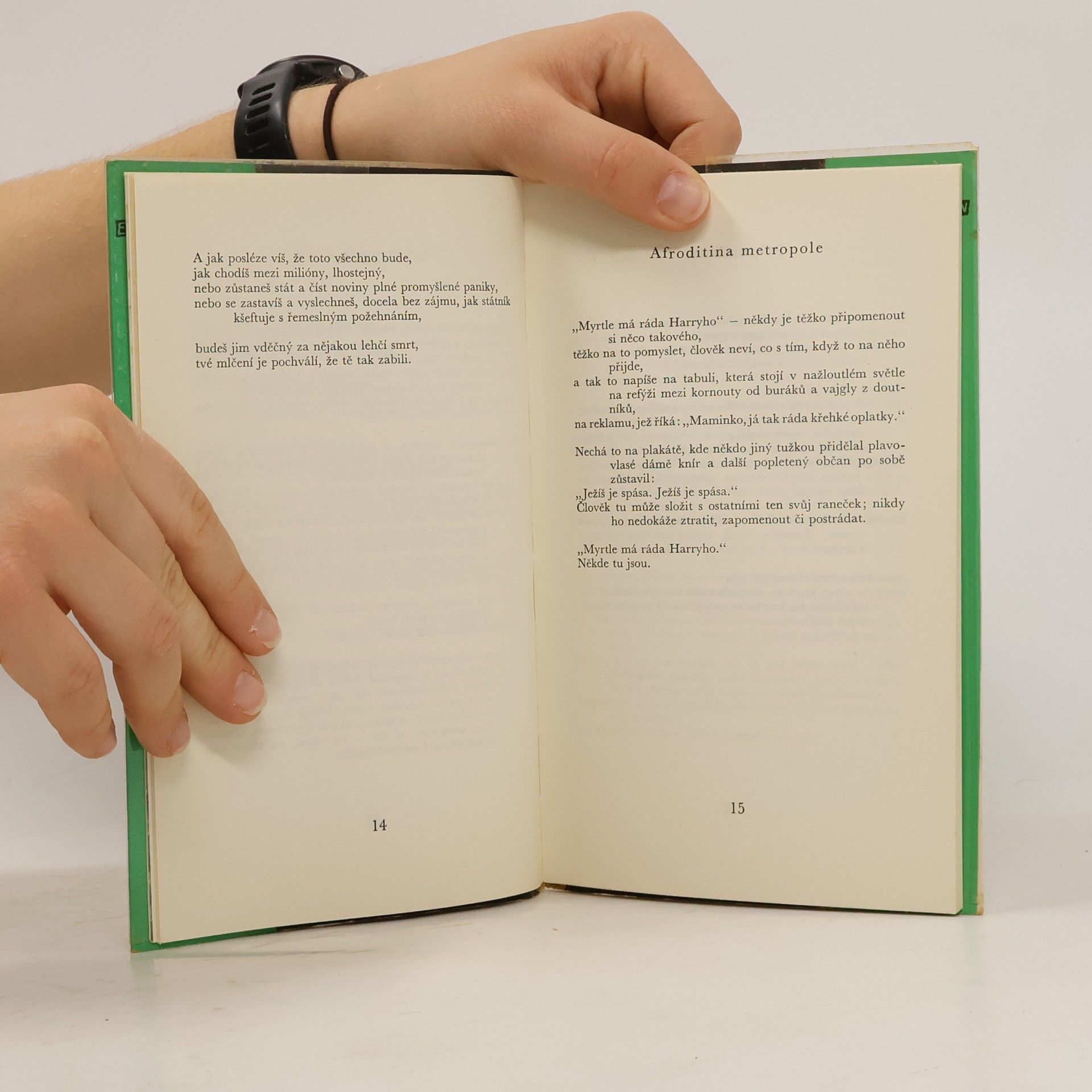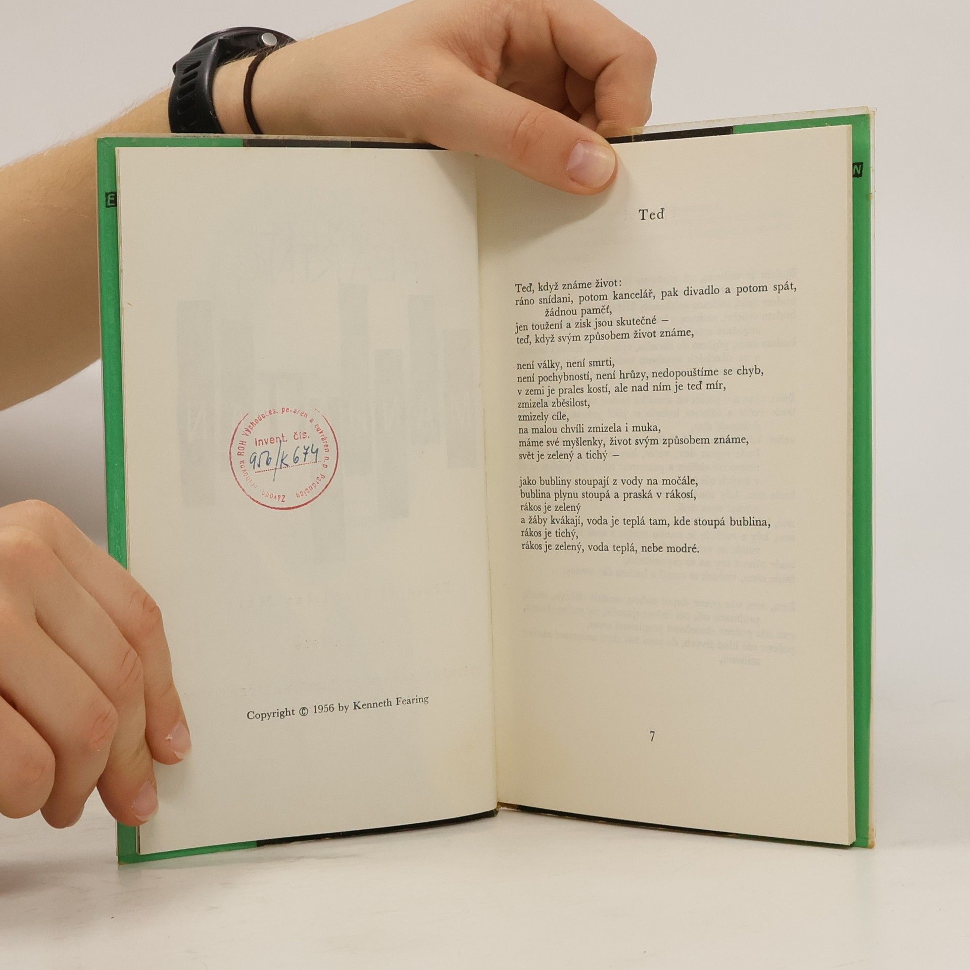 TEĎ Teď, když známe život: ráno snídani, potom kancelář, pak divadlo a potom spát, žádnou paměť, jen toužení a zisk jsou skutečné – teď, když svým způsobem život známe, není války, není smrti, není pochybnosti, není hrůzy, nedopouštíme se chyb, v zemi je prales kostí,ale nad ním je teď mír, zmizela zběsilost, zmizely cíle, na malou chvíli zmizela i muka, máme své myšlenky, život svým způsobem známe, svět je zelený a tichý – jako bubliny stoupají z vody na močále, bublina plynu stoupá a praská v rákosí, rákos je zelený a žáby kvákají, voda je teplá tam, kde stoupá bublina, rákos je tichý, rákos je zelený, voda teplá, nebe modré.