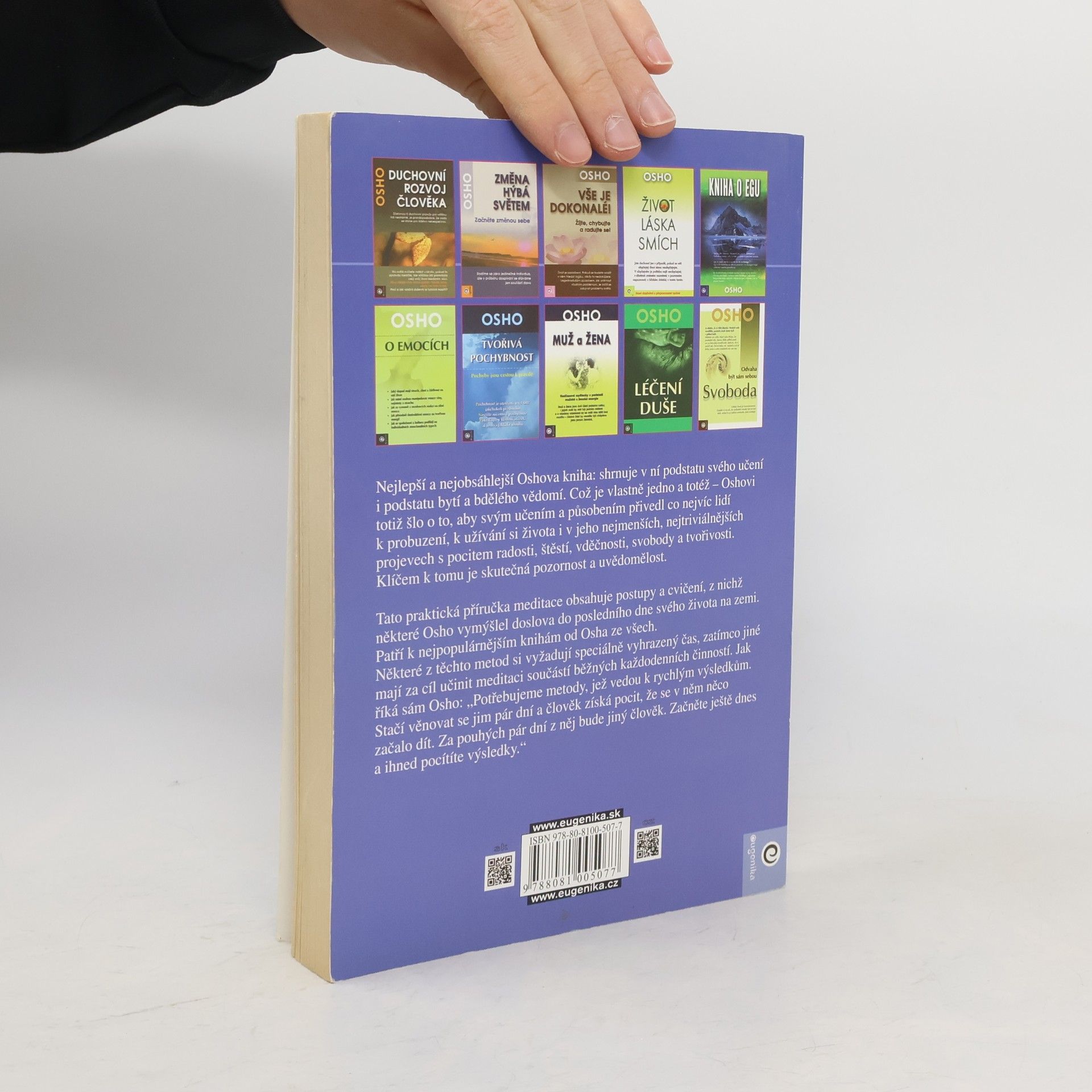 Nejlepší a nejobsáhlejší Oshova kniha shrnuje v ní podstatu svého učení i podstatu lidského bytí a bdělého vědomí. Což je vlastně jedno a totéž – Oshovi totiž šlo o to, aby svým učením a působením přivedl co nejvíc lidí k probuzení, k užívání si života i v jeho nejmenších, nejtriviálnějších projevech s pocitem radosti, štěstí, vděčnosti, svobody a tvořivosti. Klíčem k tomu je skutečná pozornost a uvědomělost. Tato praktická příručka meditace obsahuje postupy a cvičení, z nichž některé Osho vymýšlel doslova do posledního dne svého života na zemi. Patří k nejpopulárnějším knihám od Osha ze všech. Některé z těchto metod si vyžadují speciálně vyhrazený čas, zatímco jiné mají za cíl učinit meditaci součástí běžných každodenních činností. Jak říká sám Osho: „Potřebujeme metody, jež vedou k rychlým výsledkům. Stačí věnovat se jim pár dní a člověk získá pocit, že se v něm něco začalo dít. Za pouhých pár dní z něj bude jiný člověk. Začněte ještě dnes a ihned pocítíte výsledky.“
