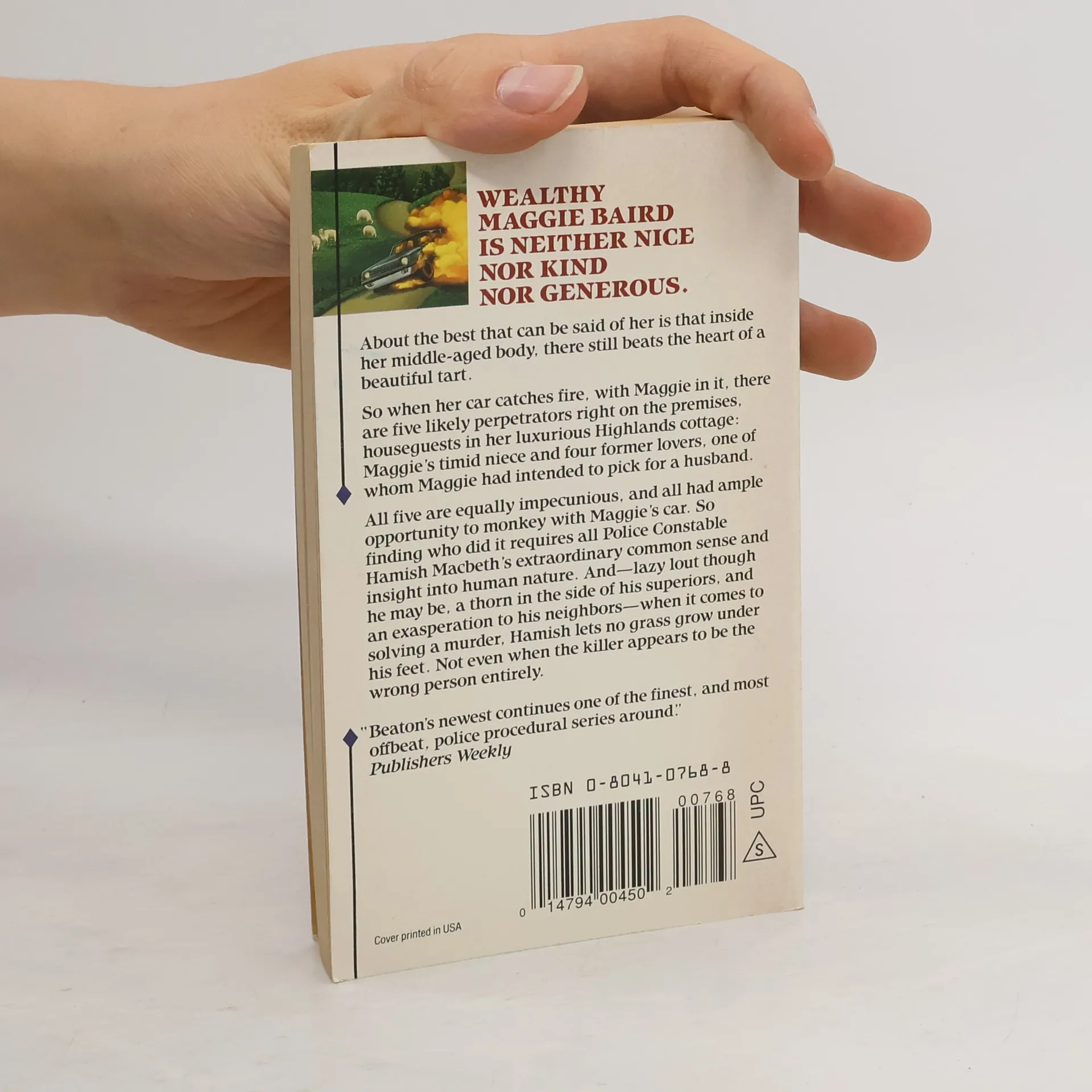 "Splendid fun." The New York Times Book Review A Hamish Macbeth mystery. Wealthy Maggie Baird is neither nice nor kind nor generous. Once she was beautiful, but now, although middle-aged, she retains the appetites of a beautiful woman. When Maggie's car catches fire with her inside it, suspicion focuses on the five houseguests staying at Maggie's luxurious Highlands cottage: her timid niece and four former lovers, once of whom Maggie had intended to pick for a husband. All five are impecunious. All five had ample opportunity to monkey with Maggie's car. So finding who did it requires all Police Constable Hamish Macbeth's extraordinary common sense and insight into human nature. And lazy lout though he may be, Hamish lets no grass grow under his feet when it comes to solving a murder. Especially when he may be the next target.