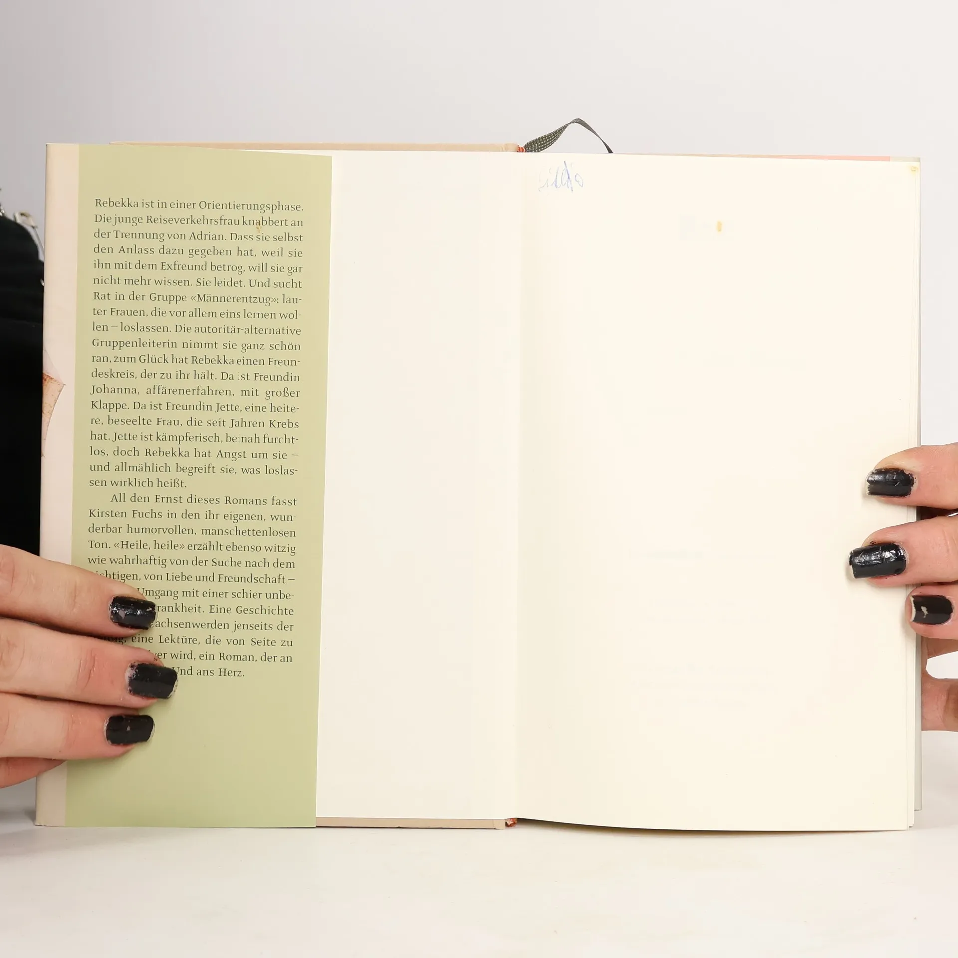 Rebekka ist in einer Orientierungsphase. Die junge Reiseverkehrsfrau knabbert an der Trennung von Adrian. Dass sie selbst den Anlass dazu gegeben hat, weil sie ihn mit dem Exfreund betrog, will sie gar nicht mehr wissen. Sie leidet. Und sucht Rat in der Gruppe „Männerentzug“: lauter Frauen, die vor allem eins lernen wollen - loslassen. Die autoritär-alternative Gruppenleiterin nimmt sie ganz schön ran, zum Glück hat Rebekka einen Freundeskreis, der zu ihr hält. Da ist Freundin Johanna, affärenerfahren, mit großer Klappe. Da ist Freundin Jette, eine heitere, beseelte Frau, die seit Jahren Krebs hat. Jette ist kämpferisch, beinah furchtlos, doch Rebekka hat Angst um sie – und allmählich begreift sie, was Loslassen wirklich heißt. All den Ernst dieses Romans fasst Kirsten Fuchs in den ihr eigenen, wunderbar humorvollen, manschettenlosen Ton. „Heile, heile“ erzählt ebenso witzig wie wahrhaftig von der Suche nach dem Richtigen, von Liebe und Freundschaft – und vom Umgang mit einer schier unbegreiflichen Krankheit. Eine Geschichte über das Erwachsenwerden jenseits der dreißig, eine Lektüre, die von Seite zu Seite intensiver wird, ein Roman, der an die Nieren geht. Und ans Herz.