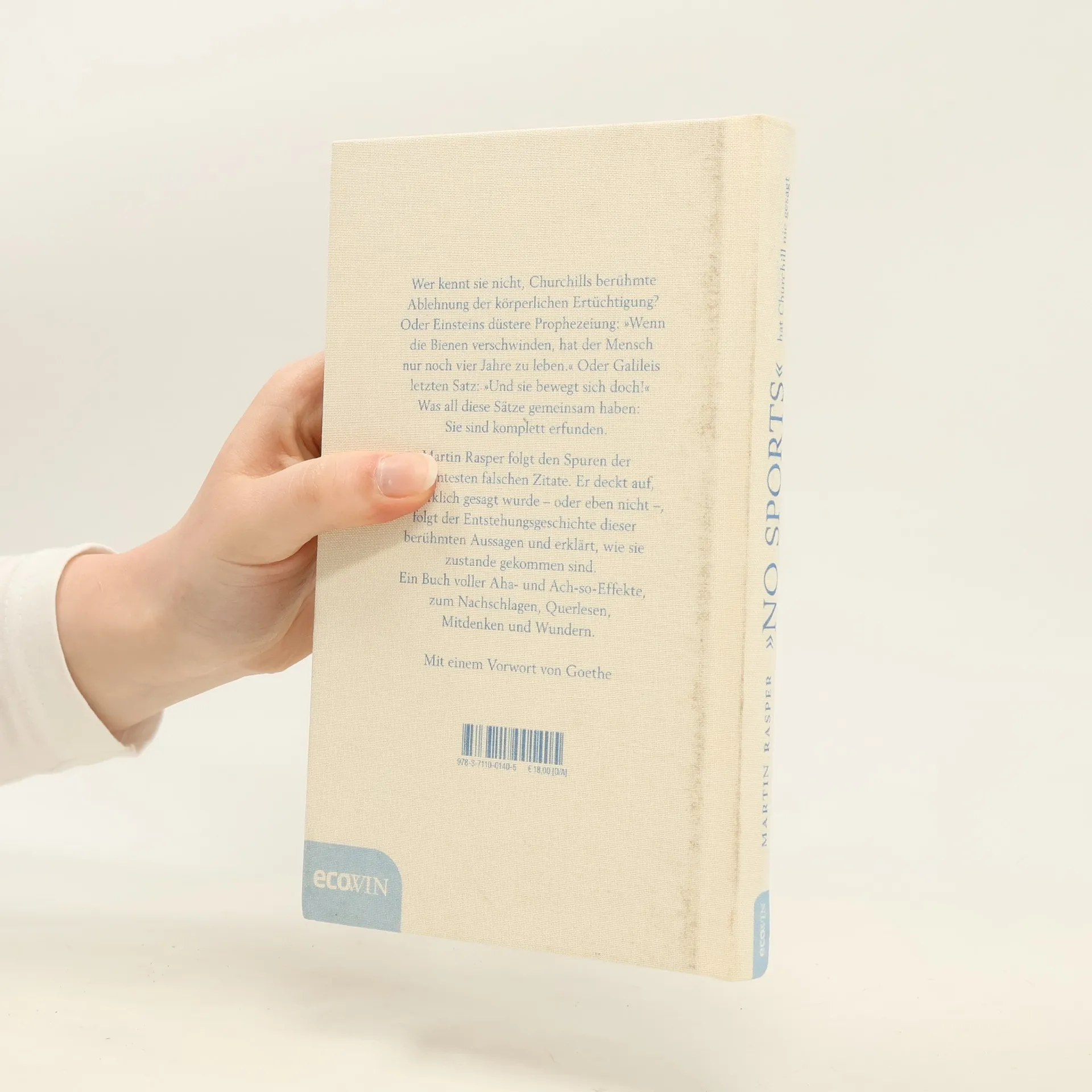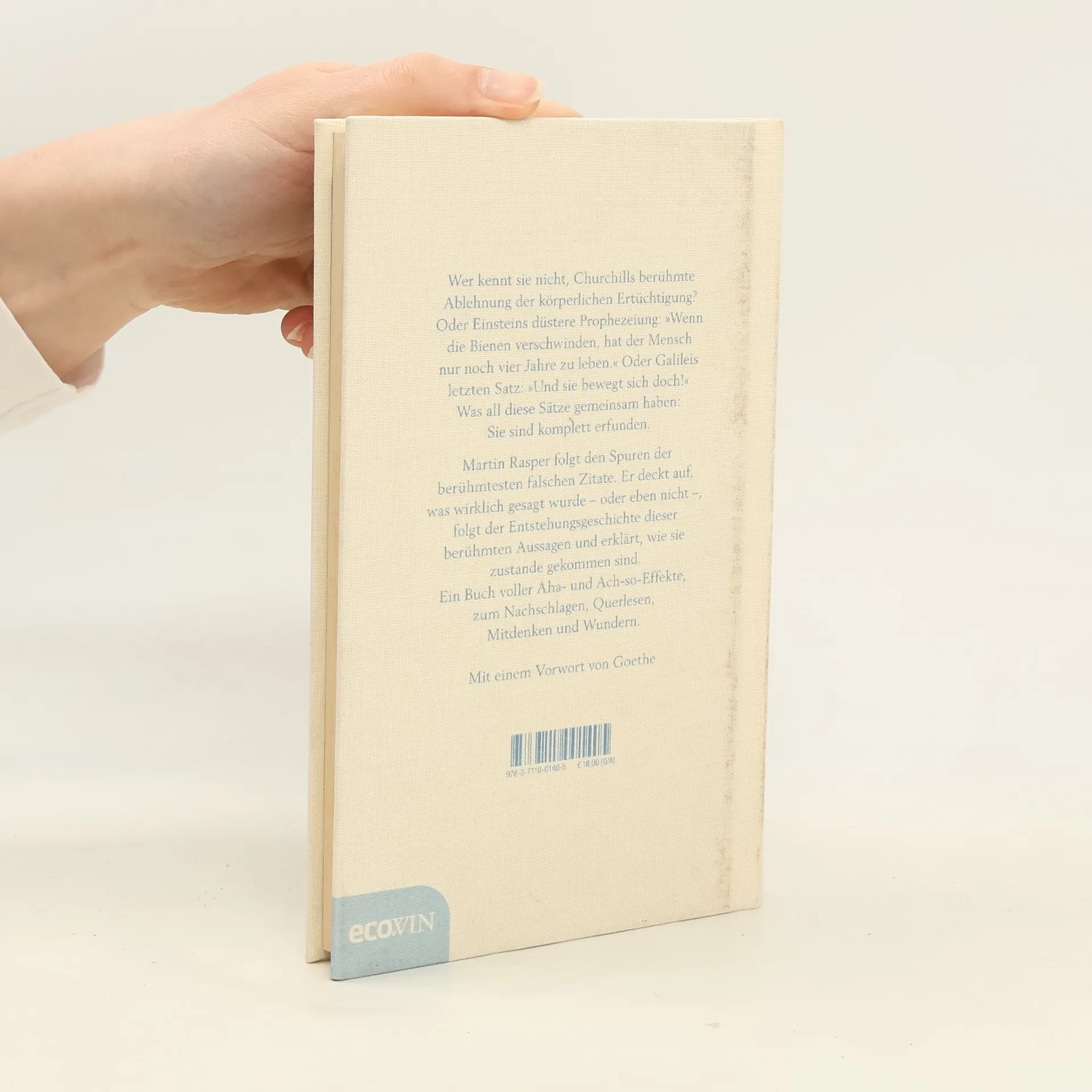 Wer kennt sie nicht, Churchills berühmte Ablehnung der körperlichen Ertüchtigung? Oder Einsteins düstere Prophezeiung: Wenn die Bienen verschwinden, hat der Mensch nur noch vier Jahre zu leben. Oder Galileis letzten Satz: Und sie bewegt sich doch! Was all diese Sätze gemeinsam haben: Sie sind komplett erfunden. Martin Rasper folgt den Spuren der berühmtesten falschen Zitate. Er deckt auf, was wirklich gesagt wurde - oder eben nicht -, folgt der Entstehungsgeschichte dieser berühmten Aussagen und erklärt, wie sie zustande gekommen sind. Ein Buch voller Aha- und Ach-so-Effekte, zum Nachschlagen, Querlesen, Mitdenken und Wundern. Mit einem Vorwort von Goethe