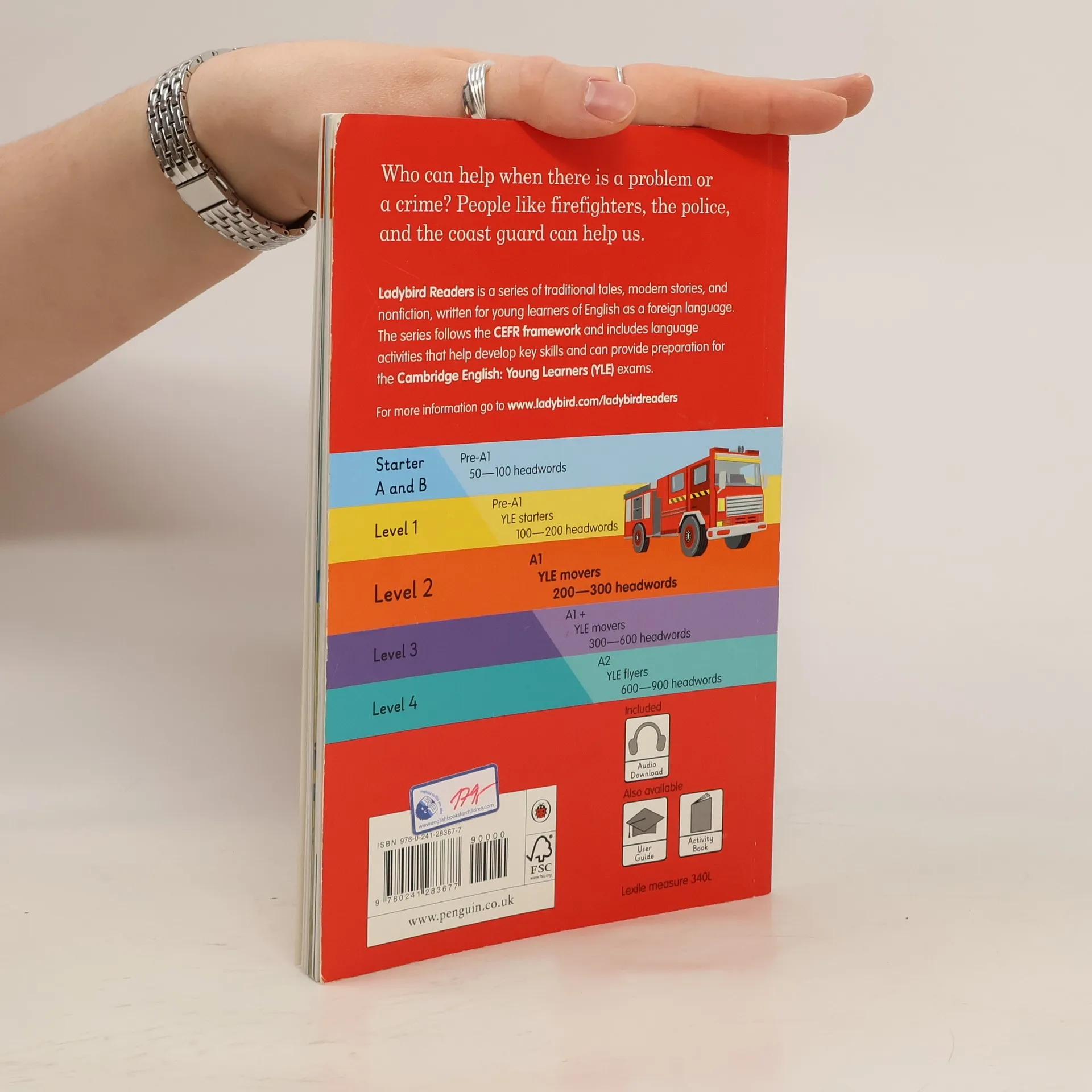 Ladybird Readers is an ELT graded reader series for children aged 3-11 learning English as a foreign or second language. The series includes traditional tales, popular characters, modern stories, and non-fiction. - Beautifully illustrated books, carefully written by language learning experts. - Structured language progression to develop children's reading, writing, speaking, listening and critical thinking skills. - Eight levels follow the Common European Framework of Reference for language learning (CEFR). - Language activities provide preparation for the Cambridge English Pre-A1 to A2 (YLE) tests. - A unique code in each printed book provides access to online audio, extra activities and learning resources. We Can Help!, a Level 2 Reader, is A1 in the CEFR framework and includes practice for the Cambridge English A1 Movers tests. Short sentences contain a maximum of two clauses, introducing the past tense and some simple adverbs. People like firefighters, the police, and the coast guard can help us when we have a problem, or there is a crime or an accident. Visit the Ladybird Education website for more information.
