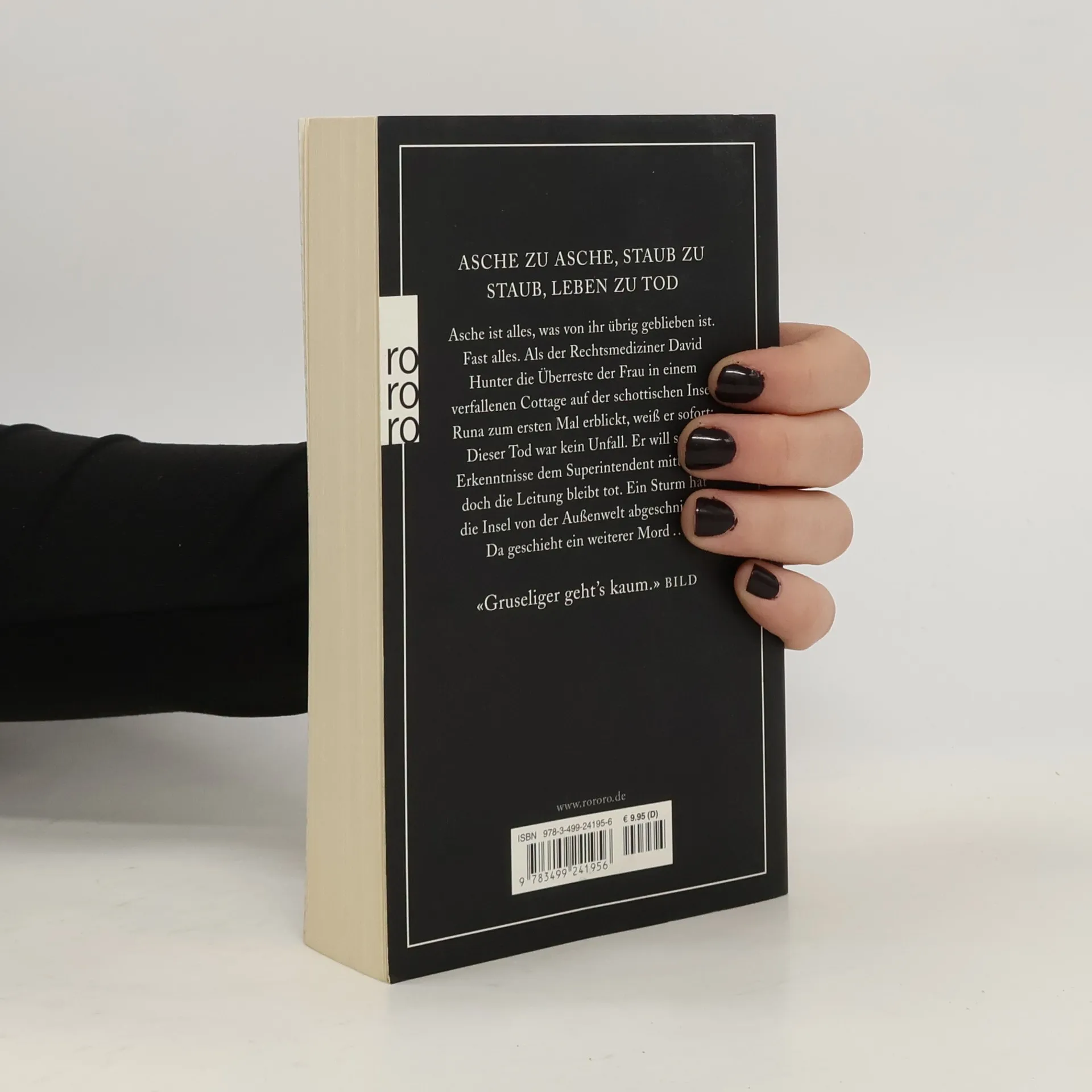 Asche zu Asche, Staub zu Staub, Leben zu Tod. Asche ist alles, was von ihr übrig geblieben ist. Fast alles. Als der Rechtsmediziner David Hunter die Überreste der Frau in einem verfallenen Cottage auf der schottischen Insel Runa zum ersten Mal erblickt, weiß er sofort: Dieser Tod war kein Unfall. Er will seine Erkenntnisse dem Superintendenten mitteilen, doch die Leitung bleibt tot. Ein Sturm hat die Insel von der Außenwelt abgeschnitten. Da geschieht ein weiterer Mord. «Gruseliger geht’s kaum.» (Bild)