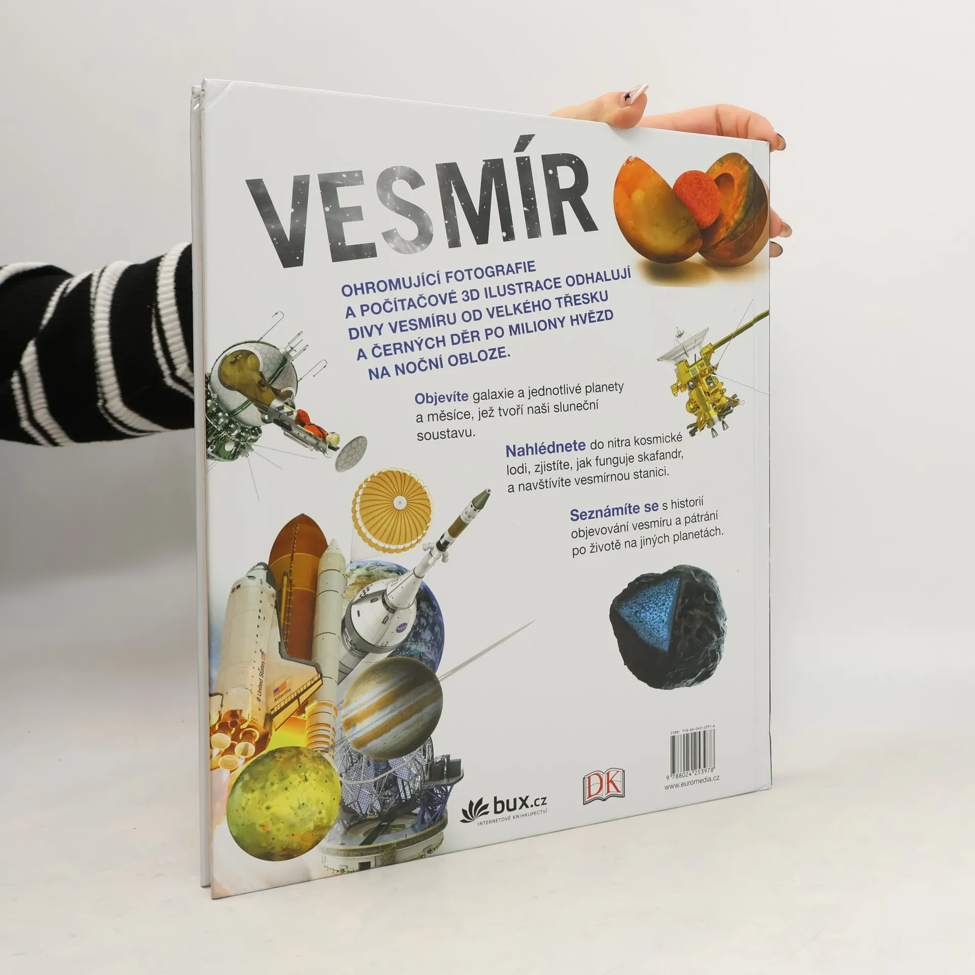 Ohromující fotografie a 3D ilustrace doprovázené přehledným informativním textem umožňují poznat a pochopit mnohá tajemství vesmíru – od velkého třesku a černých děr přes objevování galaxií a jednotlivých planet a měsíců, jež tvoří naši sluneční soustavu, po cestování do vesmíru, návštěvu kosmické lodi a vesmírné stanice či zkoumání milionů hvězd na noční obloze… S touto knihou spatříte vesmír tak, jak jste ho nikdy předtím neviděli.