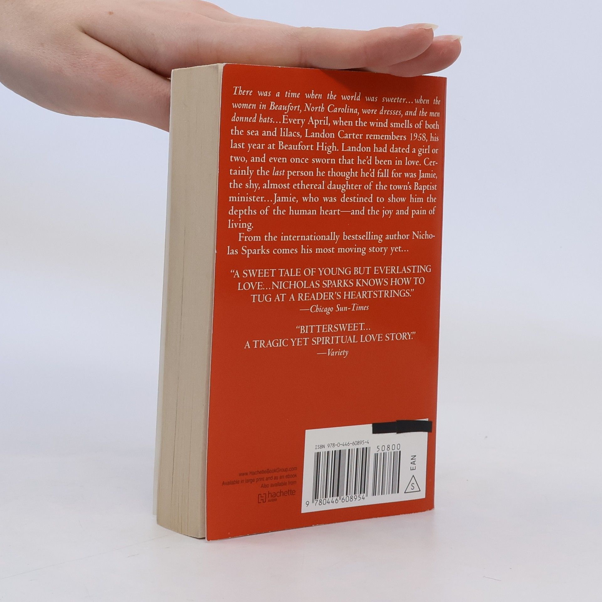 A high school rebel and a minister's daughter find strength in each other in this star-crossed tale of "young but everlasting love" (Chicago Sun-Times). There was a time when the world was sweeter....when the women in Beaufort, North Carolina, wore dresses, and the men donned hats.... Every April, when the wind smells of both the sea and lilacs, Landon Carter remembers 1958, his last year at Beaufort High. Landon had dated a girl or two, and even once sworn that he'd been in love. Certainly the last person he thought he'd fall for was Jamie, the shy, almost ethereal daughter of the town's Baptist minister....Jamie, who was destined to show him the depths of the human heart-and the joy and pain of living. The inspiration for this novel came from Nicholas Sparks's sister: her life and her courage. From the internationally bestselling author Nicholas Sparks, comes his most moving story yet....