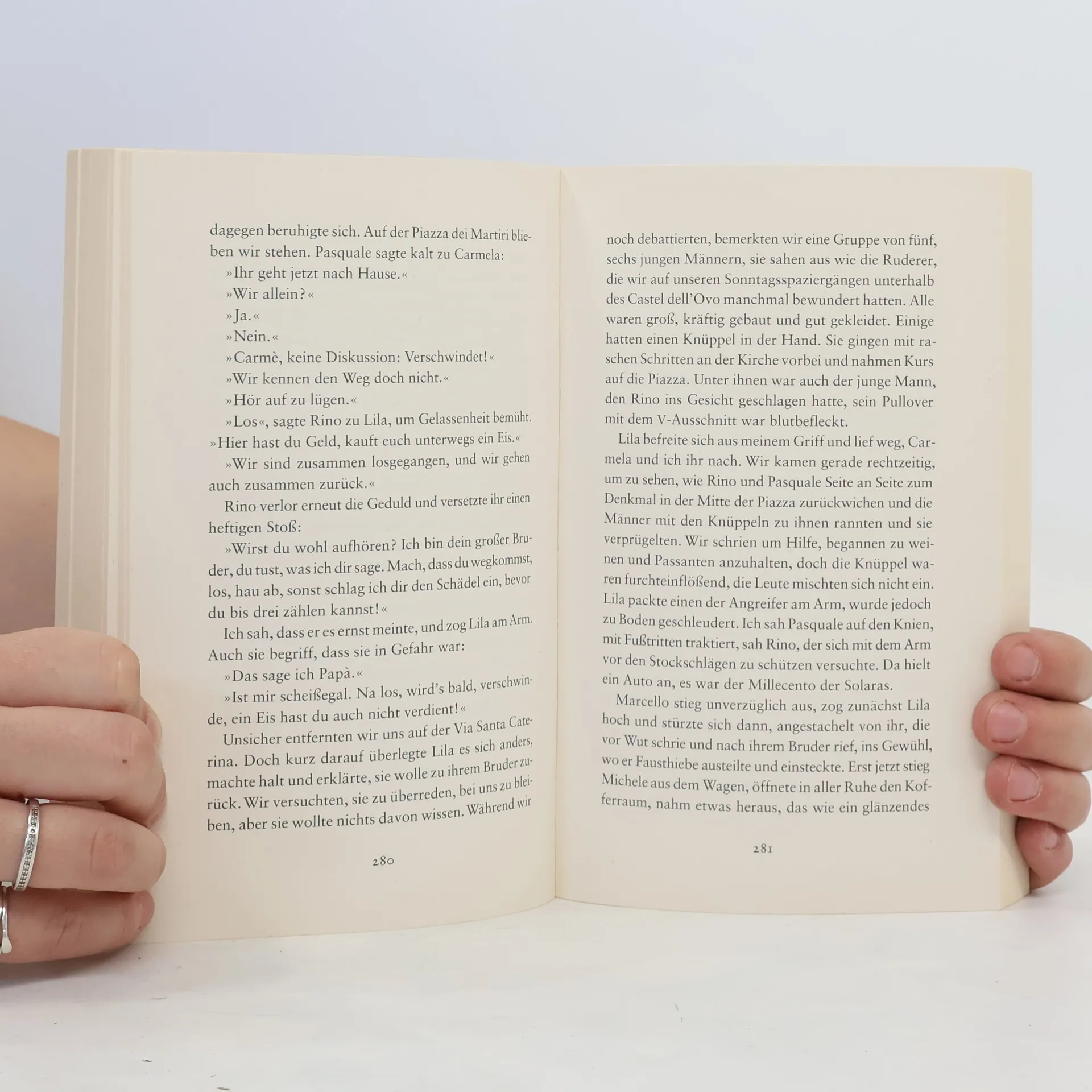 In einem volkstümlichen Viertel Neapels wachsen sie auf, derbes Fluchen auf den Straßen, Familien, die sich seit Generationen befehden, das Silvesterfeuerwerk artet in eine Schießerei aus. Hier gehen sie gemeinsam in die Schule, die unangepasste, draufgängerische Lila und die schüchterne, beflissene Elena, beide darum wetteifernd, besser zu sein als die andere. Bis Lilas Vater sein brillantes Kind zwingt, in der Schusterei mitzuarbeiten, und Elena mit dem bohrenden Verdacht zurückbleibt, das Leben zu leben, das eigentlich ihrer besten, ihrer so unberechenbaren Freundin zugestanden hätte.