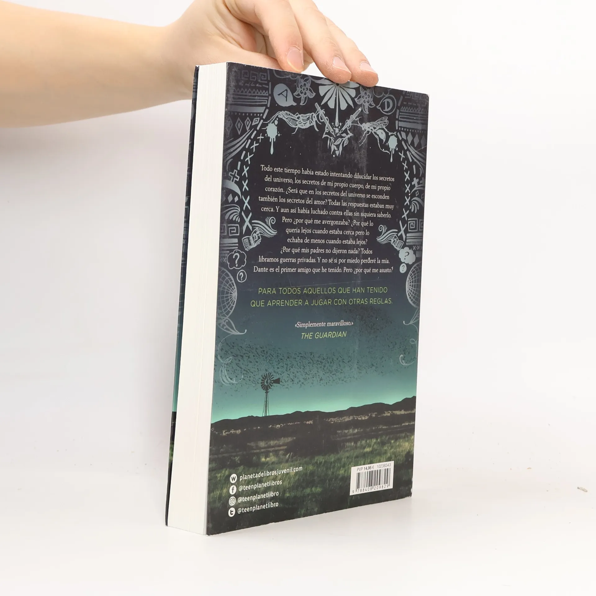 Dante sabe nadar. Aristóteles, no. Dante es hablador y seguro de sí mismo. Ari duda todo el tiempo y le cuesta entablar una conversación con alguien. Dante no para de pensar en poesía y arte. Ari vuelve constantemente al recuerdo de su hermano que está en prisión. Dante es un sabelotodo que tiene una manera especial de entender el mundo. Ari es introvertido. Dante es más bien blanco. Ari es moreno. Y aunque a simple vista no tienen nada en común, se encuentran, y empiezan a pasar tiempo juntos. Así construyen una amistad entrañable que les permitirá aprender a creer en ellos mismos, a ser más grandes y descubrir los secretos del universo.