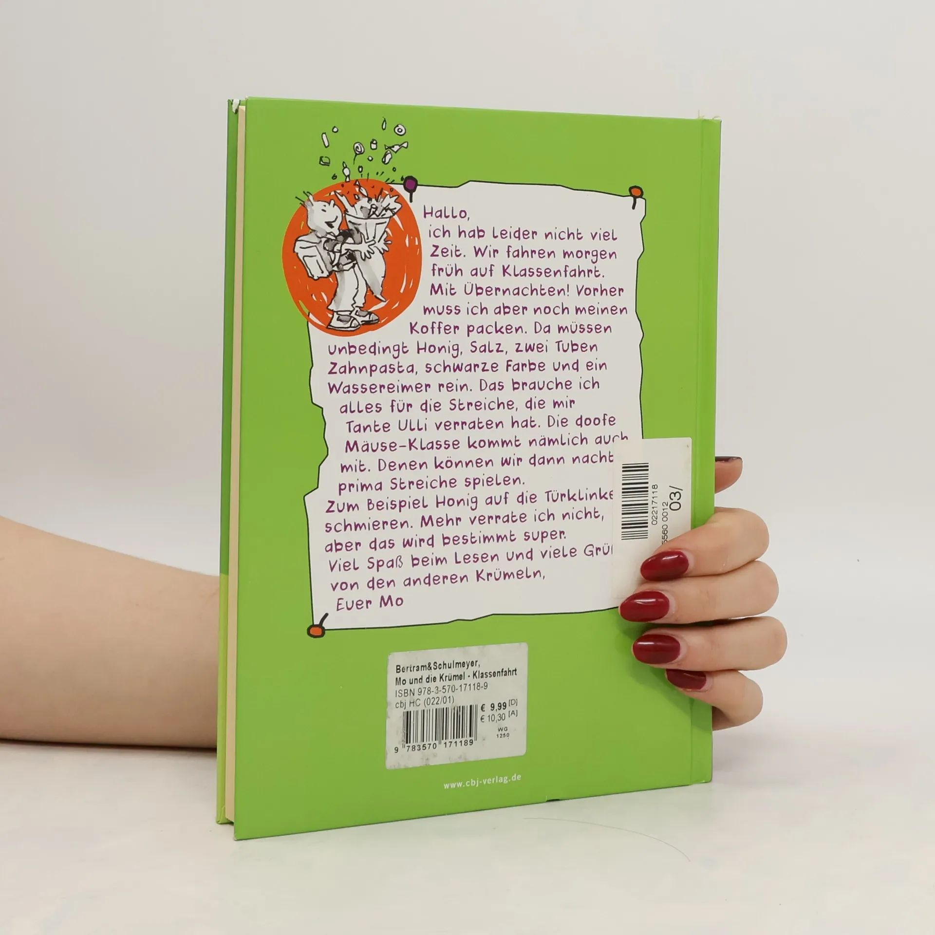 Langeweile war gestern jetzt kommen Mo und die Krümel§§Nirgends ist es so lustig wie in der Schule. Es sei denn, eine Klassenfahrt steht an. Für Mo und die Krümel bedeutet das: Drei Tage Jugendherberge ohne Eltern, dafür mit der netten Frau Grimm. Blöd nur, dass die Mäuse-Klasse auch mit von der Partie ist. Doch Mo, Esra, Erik, Anton und Kim haben schon einen Plan, wie sie die wieder loswerden vertauschte Koffer, Chaos bei der Zimmerverteilung, eine Nachtwanderung mit unvorhersehbarem Ausgang Doch dann merken die Krümel, dass der Referendar ein Auge auf ihre Lehrerin geworfen hat. Klar, dass sie Schlimmeres verhindern müssen.§§