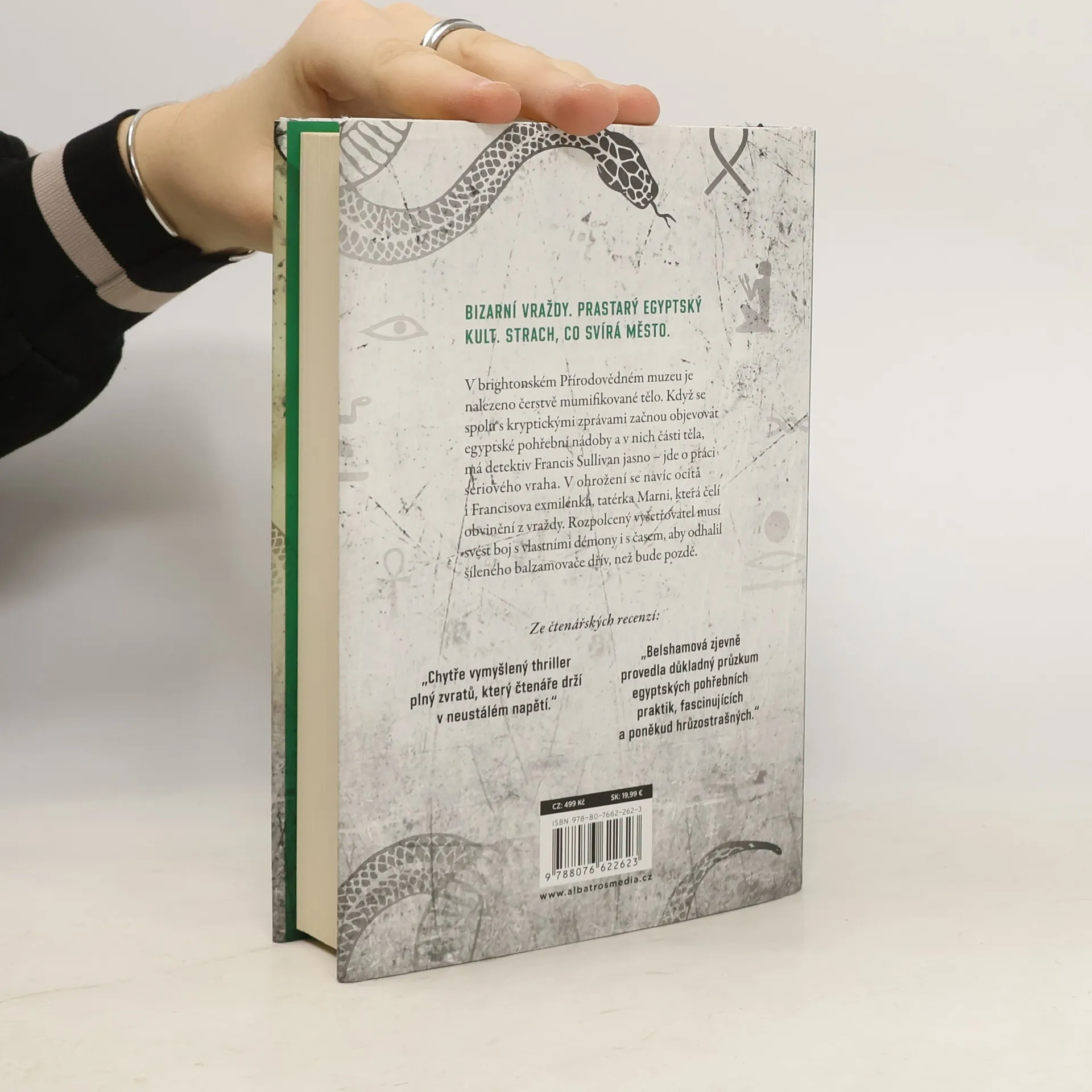 Bizarní vraždy. Prastarý kult. Strach, co svírá město. Knihám označeným zlatou pečetí Edice TOP věnujte zvýšenou pozornost! Předchází je pověst největších světových bestsellerů, které se dočkaly vřelého přijetí kritiky i čtenářů nebo získaly významná literární ocenění. TŘETÍ NAPÍNAVÝ PŘÍPAD INSPEKTORA FRANCISE SULLIVANA OD AUTORKY BESTSELLERU TATÉRKA. V brightonském Přírodovědném muzeu je nalezeno čerstvě mumifikované tělo. Když se spolu s kryptickými zprávami začnou objevovat egyptské pohřební nádoby a v nich části těla, má detektiv Francis Sullivan jasno – jde o práci sériového vraha. V ohrožení se navíc ocitá i Francisova exmilenka, tatérka Marni, která čelí obvinění z vraždy. Rozpolcený vyšetřovatel musí svést boj s vlastními démony i s časem, aby odhalil šíleného balzamovače dřív, než bude pozdě.