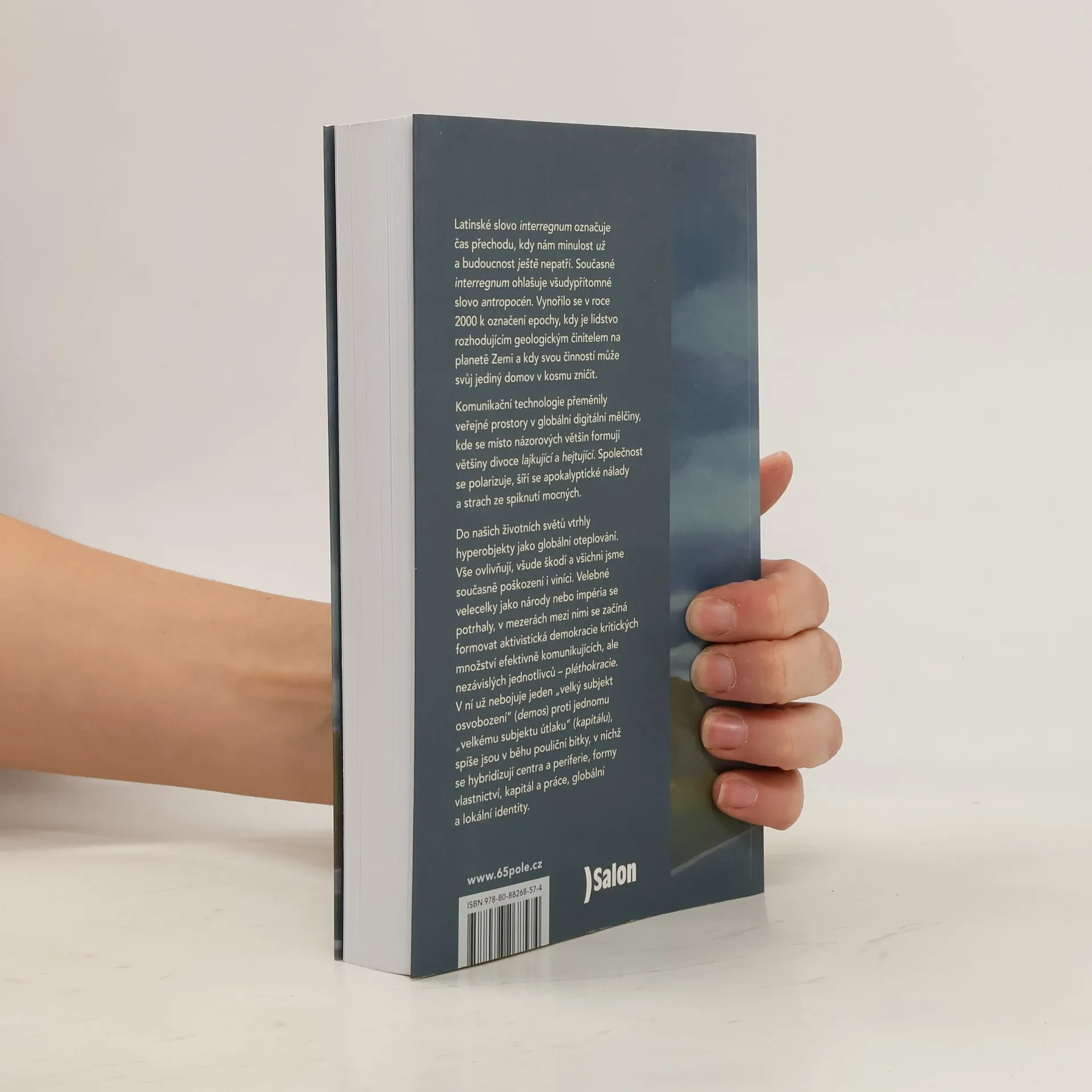 Latinské slovo interregnum označuje čas přechodu, kdy nám minulost už a budoucnost ještě nepatří. Současné interregnum ohlašuje všudypřítomné slovo antropocén. Vynořilo se v roce 2000 k označení epochy, kdy je lidstvo rozhodujícím geologickým činitelem na planetě Zemi a kdy svou činností může svůj jediný domov v kosmu zničit. Komunikační technologie přeměnily veřejné prostory v globální digitální mělčiny, kde se místo názorových většin formují většiny divoce lajkující a hejtující. Společnost se polarizuje, šíří se apokalyptické nálady a strach ze spiknutí mocných. Do našich životních světů vtrhly hyperobjekty jako globální oteplování. Vše ovlivňují, všude škodí a všichni jsme současně poškození i viníci. Velebné velecelky jako národy nebo impéria se potrhaly, v mezerách mezi nimi se začíná formovat aktivistická demokracie kritických množství efektivně komunikujících, ale nezávislých jednotlivců – pléthokracie. V ní už nebojuje jeden „velký subjekt osvobození“ (demos) proti jednomu „velkému subjektu útlaku“ (kapitálu), spíše jsou v běhu pouliční bitky, v nichž se hybridizují centra a periferie, formy vlastnictví, kapitál a práce, globální a lokální identity.