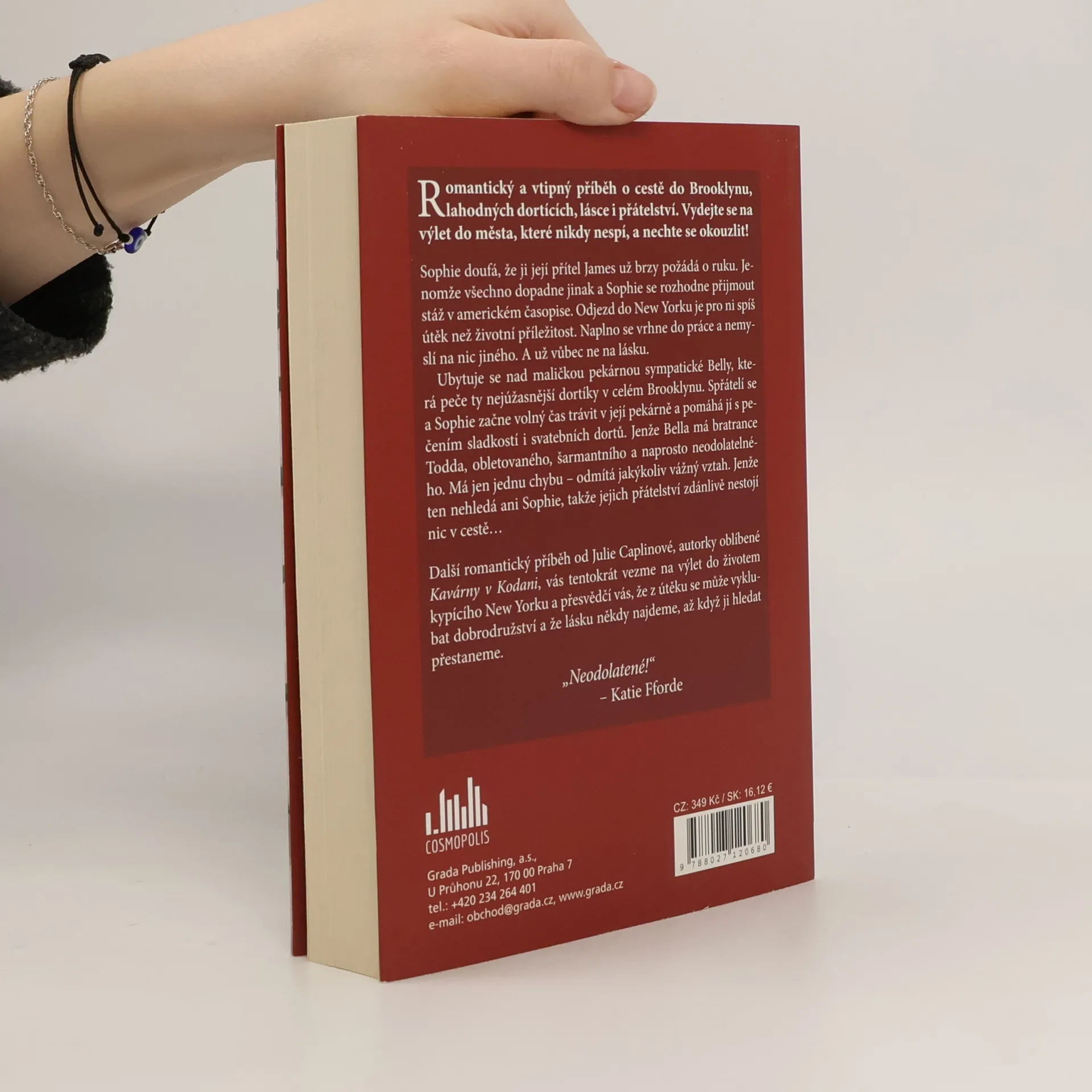 Romantický a vtipný příběh o cestě do Brooklynu, lahodných dortících, lásce i přátelství. Vydejte se na výlet do města, které nikdy nespí, a nechte se okouzlit! Sophie doufá, že ji její přítel James už brzy požádá o ruku. Jenomže všechno dopadne jinak a Sophie se rozhodne přijmout stáž v americkém časopise. Odjezd do New Yorku je pro ni spíš útěk než životní příležitost. Naplno se vrhne do práce a nemyslí na nic jiného. A už vůbec ne na lásku. Ubytuje se nad maličkou pekárnou sympatické Belly, která peče ty nejúžasnější dortíky v celém Brooklynu. Spřátelí se a Sophie začne volný čas trávit v její pekárně a pomáhá jí s pečením sladkostí i svatebních dortů. Jenže Bella má bratrance Todda, obletovaného, šarmantního a naprosto neodolatelného. Má jen jednu chybu – odmítá jakýkoliv vážný vztah. Jenže ten nehledá ani Sophie, takže jejich přátelství zdánlivě nestojí nic v cestě… Další romantický příběh od Julie Caplinové, autorky oblíbené Kavárny v Kodani, vás tentokrát vezme na výlet do životem kypícího New Yorku a přesvědčí vás, že z útěku se může vyklubat dobrodružství a že lásku někdy najdeme, až když ji hledat přestaneme.