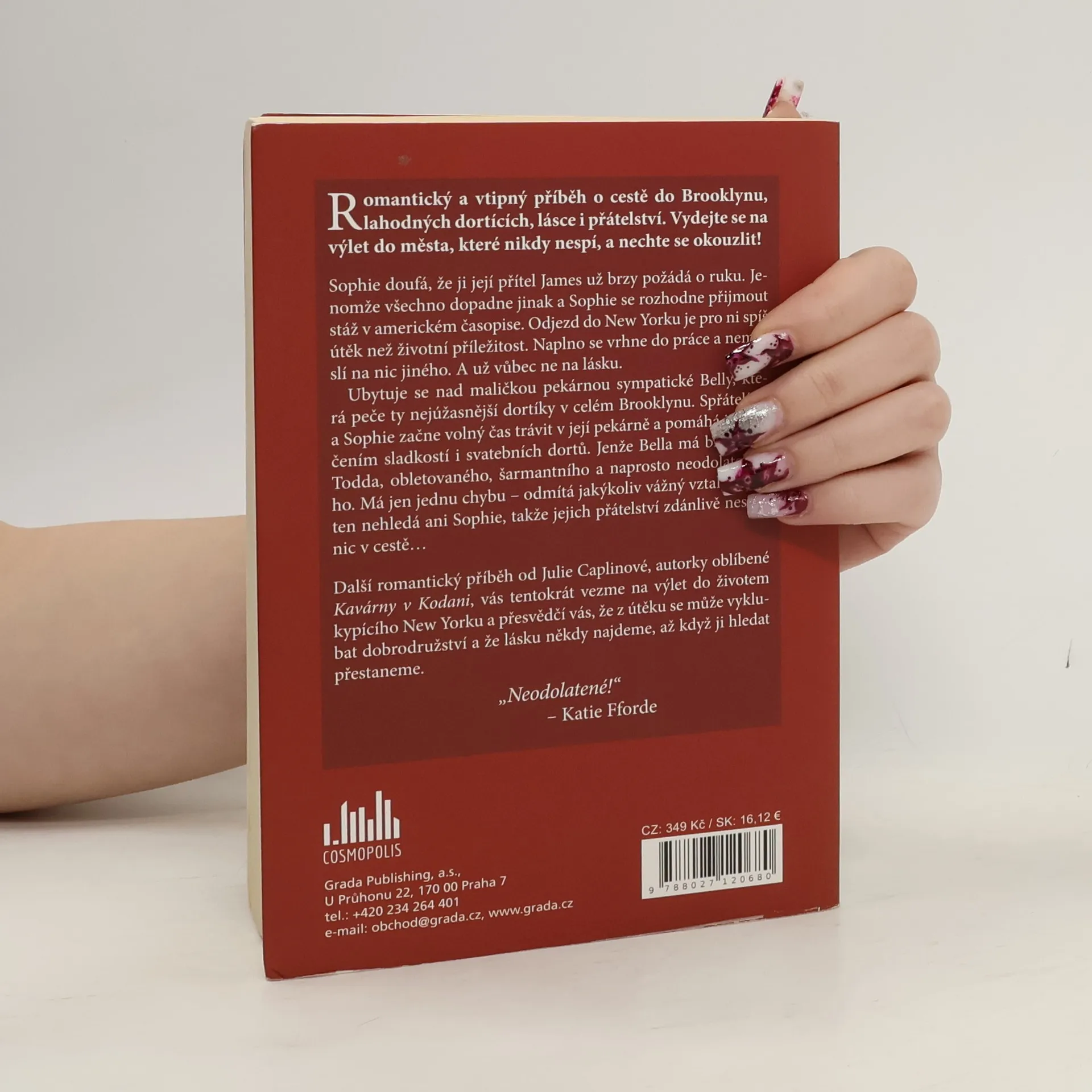 Romantický a vtipný příběh o cestě do Brooklynu, lahodných dortících, lásce i přátelství. Vydejte se na výlet do města, které nikdy nespí, a nechte se okouzlit! Sophie doufá, že ji její přítel James už brzy požádá o ruku. Jenomže všechno dopadne jinak a Sophie se rozhodne přijmout stáž v americkém časopise. Odjezd do New Yorku je pro ni spíš útěk než životní příležitost. Naplno se vrhne do práce a nemyslí na nic jiného. A už vůbec ne na lásku. Ubytuje se nad maličkou pekárnou sympatické Belly, která peče ty nejúžasnější dortíky v celém Brooklynu. Spřátelí se a Sophie začne volný čas trávit v její pekárně a pomáhá jí s pečením sladkostí i svatebních dortů. Jenže Bella má bratrance Todda, obletovaného, šarmantního a naprosto neodolatelného. Má jen jednu chybu – odmítá jakýkoliv vážný vztah. Jenže ten nehledá ani Sophie, takže jejich přátelství zdánlivě nestojí nic v cestě… Další romantický příběh od Julie Caplinové, autorky oblíbené Kavárny v Kodani, vás tentokrát vezme na výlet do životem kypícího New Yorku a přesvědčí vás, že z útěku se může vyklubat dobrodružství a že lásku někdy najdeme, až když ji hledat přestaneme.