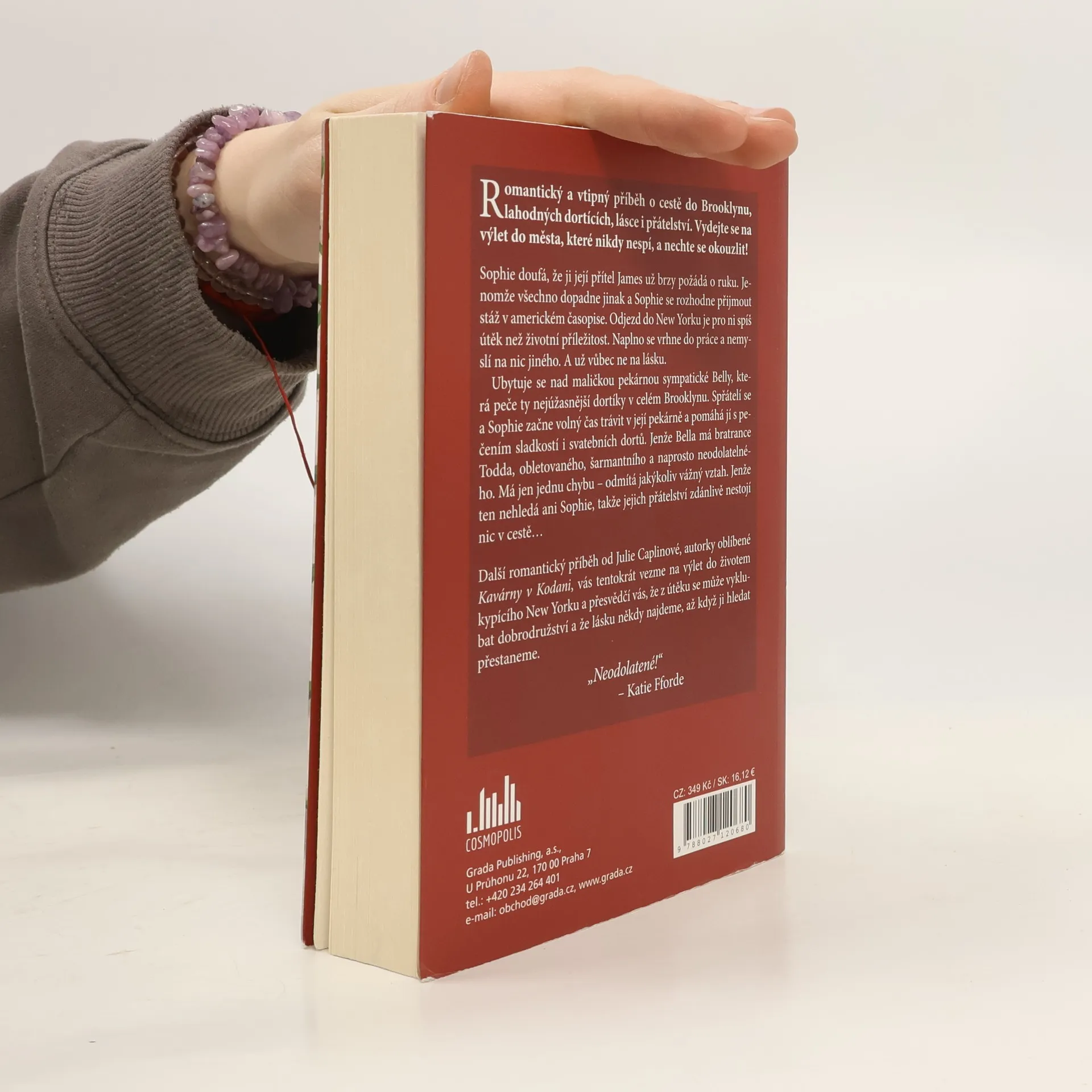 Romantický a vtipný příběh o cestě do Brooklynu, lahodných dortících, lásce i přátelství. Vydejte se na výlet do města, které nikdy nespí, a nechte se okouzlit! Sophie doufá, že ji její přítel James už brzy požádá o ruku. Jenomže všechno dopadne jinak a Sophie se rozhodne přijmout stáž v americkém časopise. Odjezd do New Yorku je pro ni spíš útěk než životní příležitost. Naplno se vrhne do práce a nemyslí na nic jiného. A už vůbec ne na lásku. Ubytuje se nad maličkou pekárnou sympatické Belly, která peče ty nejúžasnější dortíky v celém Brooklynu. Spřátelí se a Sophie začne volný čas trávit v její pekárně a pomáhá jí s pečením sladkostí i svatebních dortů. Jenže Bella má bratrance Todda, obletovaného, šarmantního a naprosto neodolatelného. Má jen jednu chybu – odmítá jakýkoliv vážný vztah. Jenže ten nehledá ani Sophie, takže jejich přátelství zdánlivě nestojí nic v cestě… Další romantický příběh od Julie Caplinové, autorky oblíbené Kavárny v Kodani, vás tentokrát vezme na výlet do životem kypícího New Yorku a přesvědčí vás, že z útěku se může vyklubat dobrodružství a že lásku někdy najdeme, až když ji hledat přestaneme.