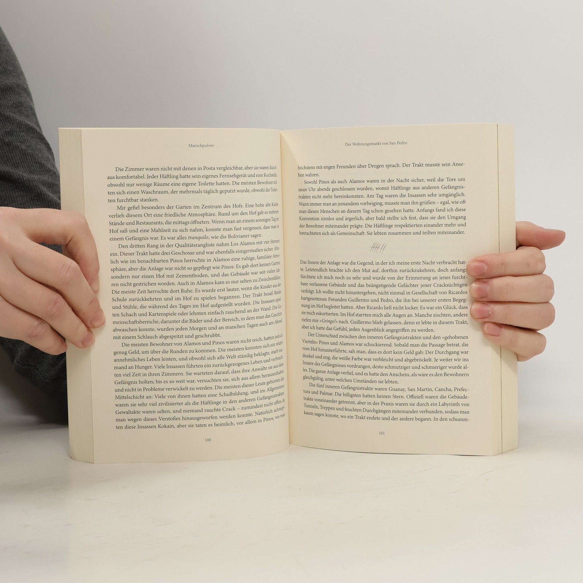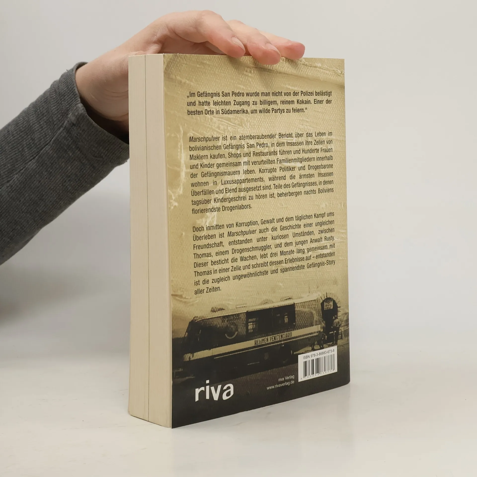 „Im Gefängnis San Pedro wurde man nicht von der Polizei belästigt und hatte leichten Zugang zu billigem, reinem Kokain. Einer der besten Orte in Südamerika, um wilde Partys zu feiern.“ Marschpulver ist ein atemberaubender Bericht über das Leben im bolivianischen Gefängnis San Pedro, in dem Insassen ihre Zellen von Maklern kaufen, Shops und Restaurants führen und Hunderte Frauen und Kinder gemeinsam mit verurteilten Familienmitgliedern innerhalb der Gefängnismauern leben. Korrupte Politiker und Drogenbarone wohnen in Luxusappartements, während die ärmsten Insassen Überfällen und Elend ausgesetzt sind. Teile des Gefängnisses, in denen tagsüber Kindergeschrei zu hören ist, beherbergen nachts Boliviens florierendste Drogenlabors. Doch inmitten von Korruption, Gewalt und dem täglichen Kampf ums Überleben ist Marschpulver auch die Geschichte einer ungleichen Freundschaft, entstanden unter kuriosen Umständen, zwischen Thomas, einem Drogenschmuggler, und dem jungen Anwalt Rusty. Dieser besticht die Wachen, lebt drei Monate lang gemeinsam mit Thomas in einer Zelle und schreibt dessen Erlebnisse auf – entstanden ist die zugleich ungewöhnlichste und spannendste Gefängnis-Story aller Zeiten.