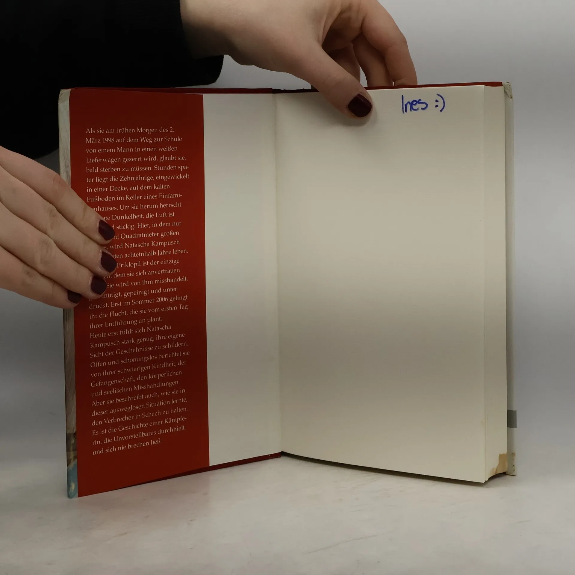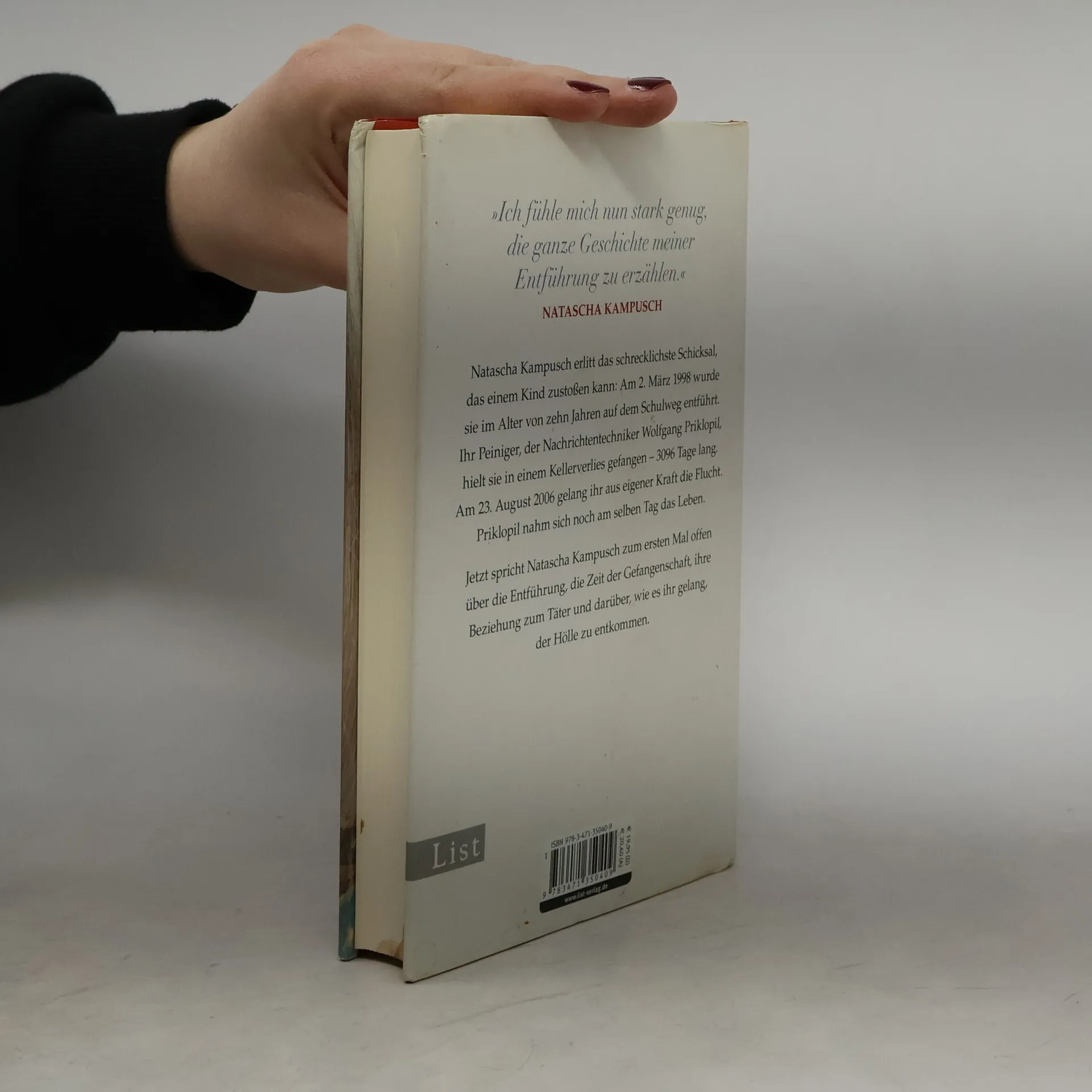 Natascha Kampusch erlitt das schrecklichste Schicksal, das einem Kind zustoßen kann: Am 2. März 1998 wurde sie im Alter von zehn Jahren auf dem Schulweg entführt. Ihr Peiniger, der Nachrichtentechniker Wolfgang Priklopil, hielt sie in einem Kellerverlies gefangen - 3096 Tage lang. Am 23. August 2006 gelang ihr aus eigener Kraft die Flucht. Priklopil nahm sich noch am selben Tag das Leben. Jetzt spricht Natascha Kampusch zum ersten Mal offen über die Entführung, die Zeit der Gefangenschaft, ihre Beziehung zum Täter und darüber, wie es ihr gelang, der Hölle zu entkommen.