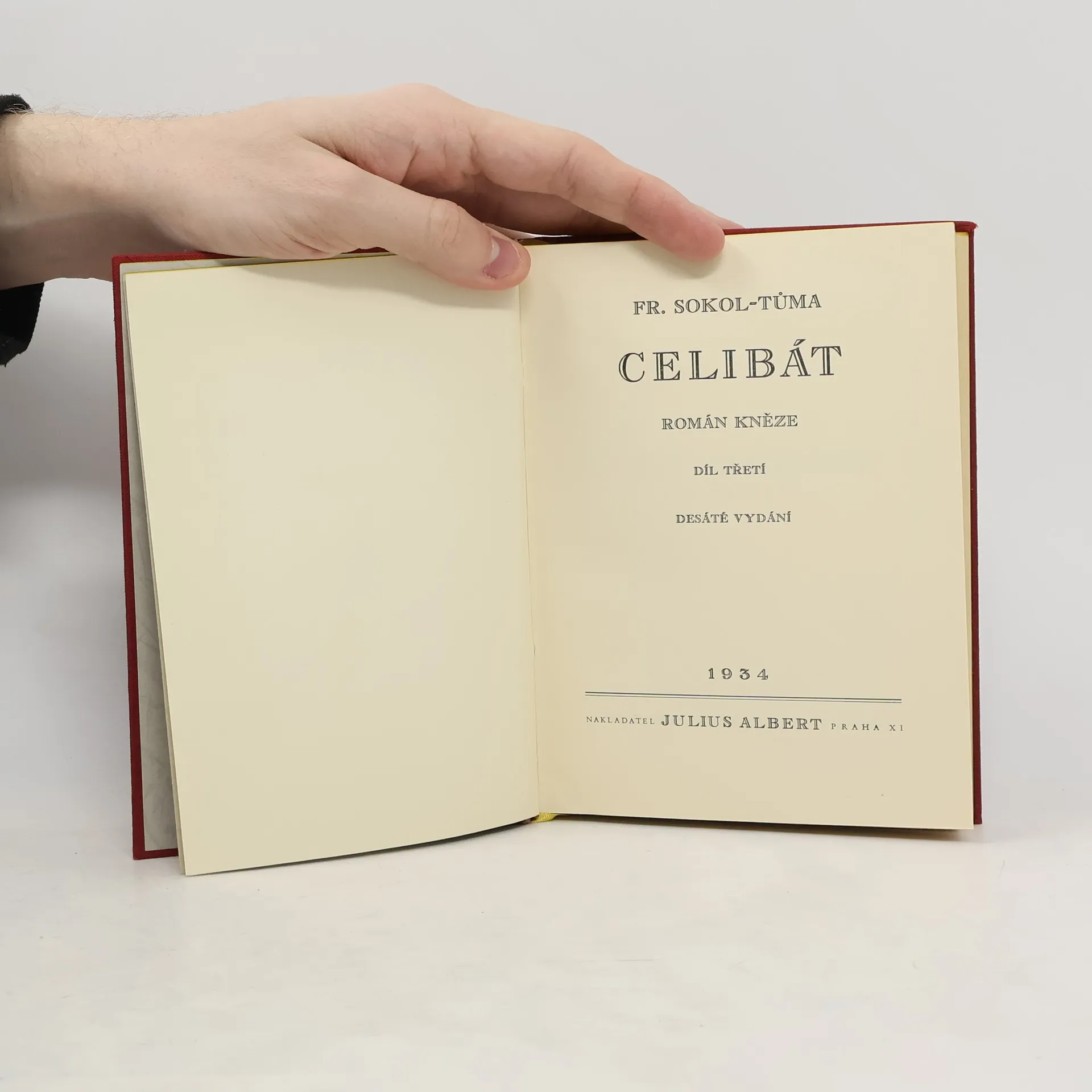 Román kněze o třech dílech. Trojdílný ,,Celibát" je skvostnou knihou konfliktu nadřízené moci duchovní a světské se služebníkem božím, který přes své poslání dovedl si uchovati vrozený pud po pokroku. Jako takový nemůže bez diskuse nechati otázku nuceného celibátu. Hnusí se mu lež apřetvářka a povýšení na svůj pidestál lásku a pravdu je štván od těch kdož si hoví raději v přítmí pohodlných služeb církve a brodí se kalem pokrytectví a pomluv. Kněz Sokola- Tůmy je příliš čistý pro církev, jež ráda na svých farách připouští nelegitimní svazky duší, než dovolenou pravdu před světem. Všichni ti, kteří znají případy jež jsou obdobou tohoto Celibátu, budou uchváceny křišťálovými charaktery: Tohoto osvíceného kněze a ženy, jež se před světem vyznala z této dojemné lásky.