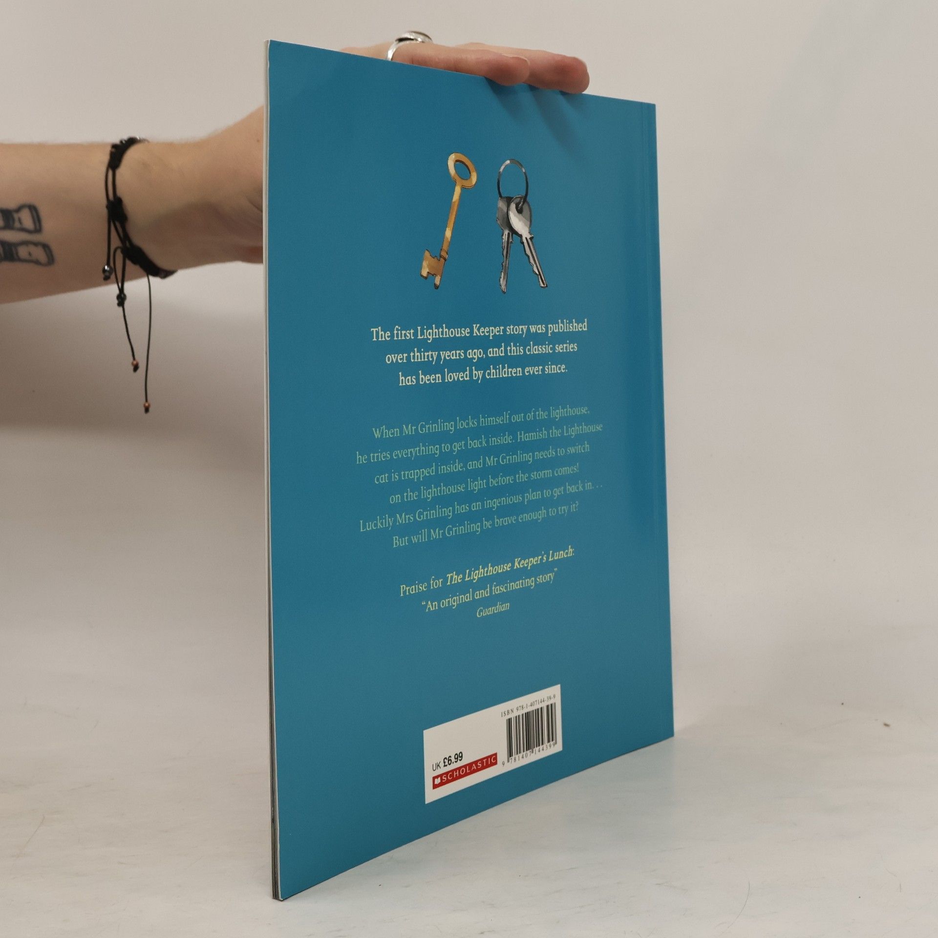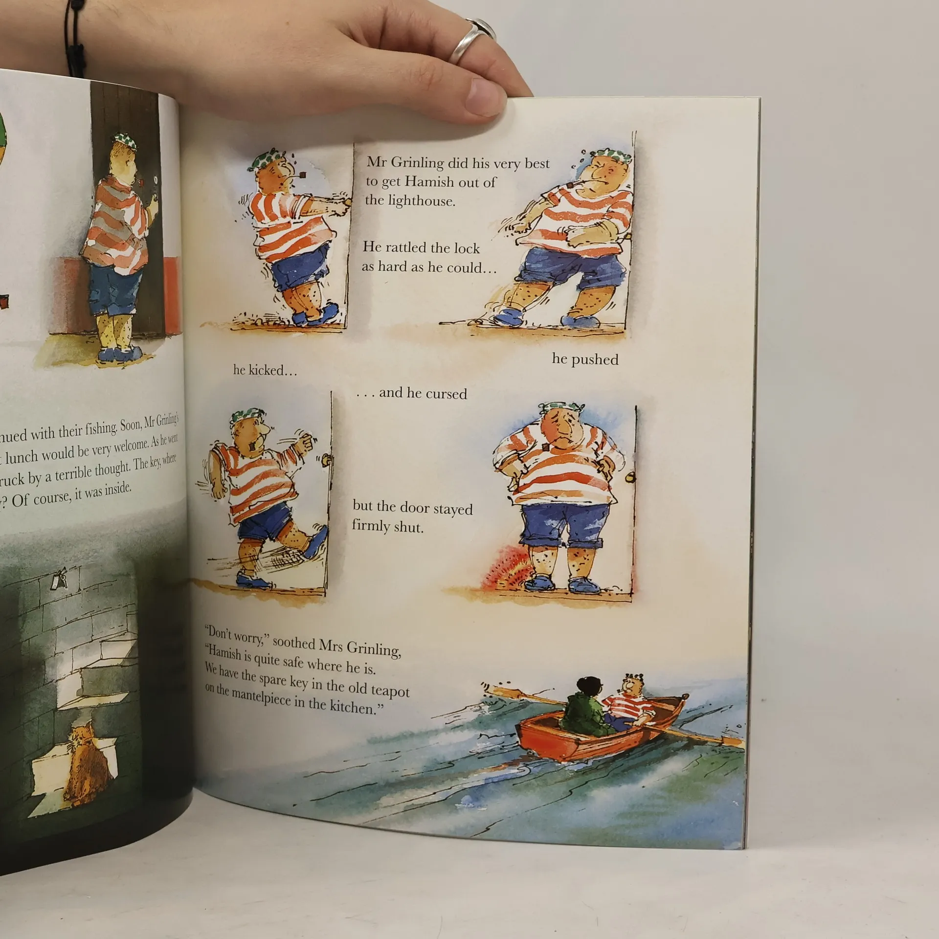 Once there was a lighthouse keeper called Mr. Grinling. At night time he lived in a small white cottage perched high on the cliffs, and in the daytime he rowed out to his lighthouse to clean and polish the light. When Mr Grinling locks himself out of the lighthouse, he tries everything to get back inside!