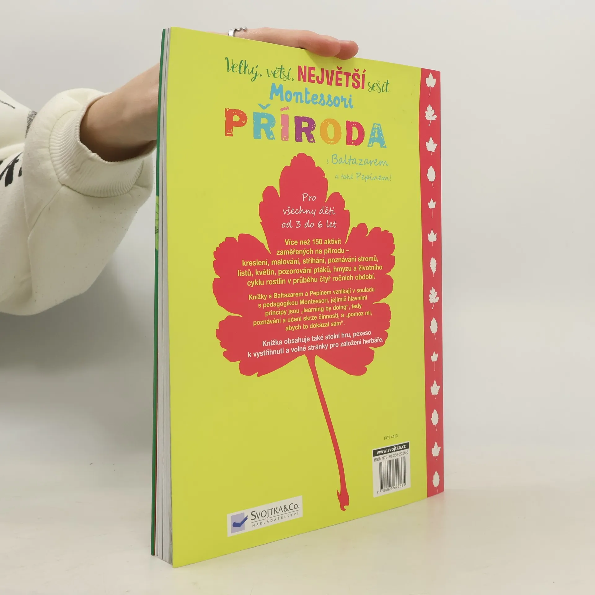 V tomto opravdu velkém sešitu na vás čeká více než 150 aktivit zaměřených na přírodu. Najdete zde kreslení, malování, stříhání, poznávání stromů, listů, květin, pozorování ptáků, hmyzu a životního cyklu rostlin v průběhu čtyř ročních období. Knížkou provázejí sympatické postavičky Baltazara a Pepína. Aktivity jsou vytvořené v souladu s pedagogikou Montessori, jejímiž hlavními principy jsou "learning by doing", tedy poznávání a učení skrze činnosti, a "pomoz mi, abych to dokázal sám" – citlivé vedení dětí k samostatnosti. Sešit obsahuje také stolní hru, pexeso k vystřihnutí a volné stránky pro založení herbáře. Pro všechny děti od tří do šesti let.