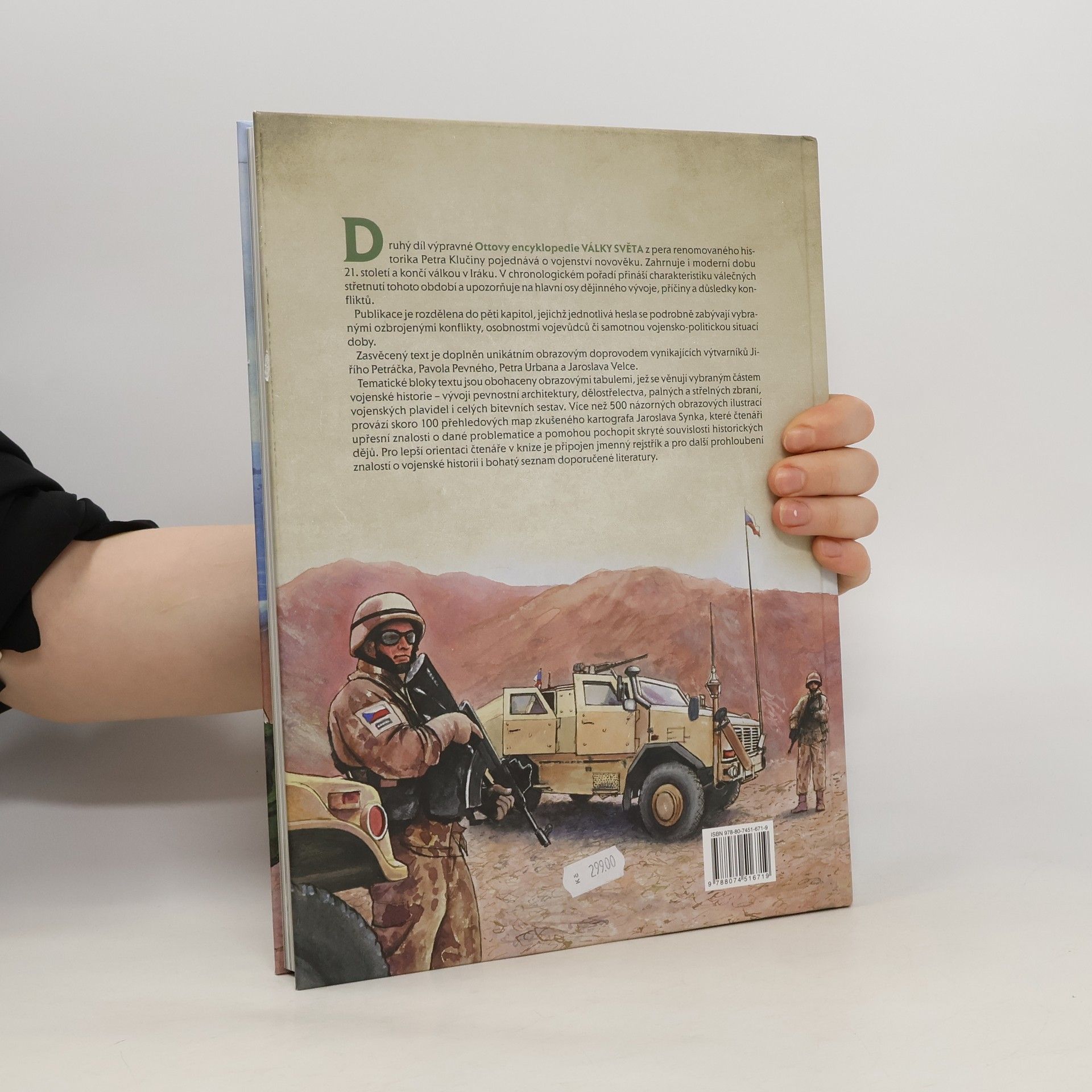Druhý díl výpravné Ottovy encyklopedie Války světa renomovaného historika Petra Klučiny pojednává o vojenství novověku. Zahrnuje i moderní dobu 21.století a končí válkou v Iráku. Publikace je rozdělena do pěti kapitol, jejichž jednotlivá hesla se zabývají vybranými ozbrojenými konflikty, osobnostmi vojevůdců či vojensko-politickým vývojem. Více než 500 ilustrací známých výtvarníků Jiřího Petráčka, Pavola Pevného, Petra Urbana a Jaroslava Velce provází skoro 100 map kartografa Jaroslava Synka. Encyklopedie je tak svou formou vhodná nejen pro zájemce o vojenskou tematiku, ale i pro mládež.