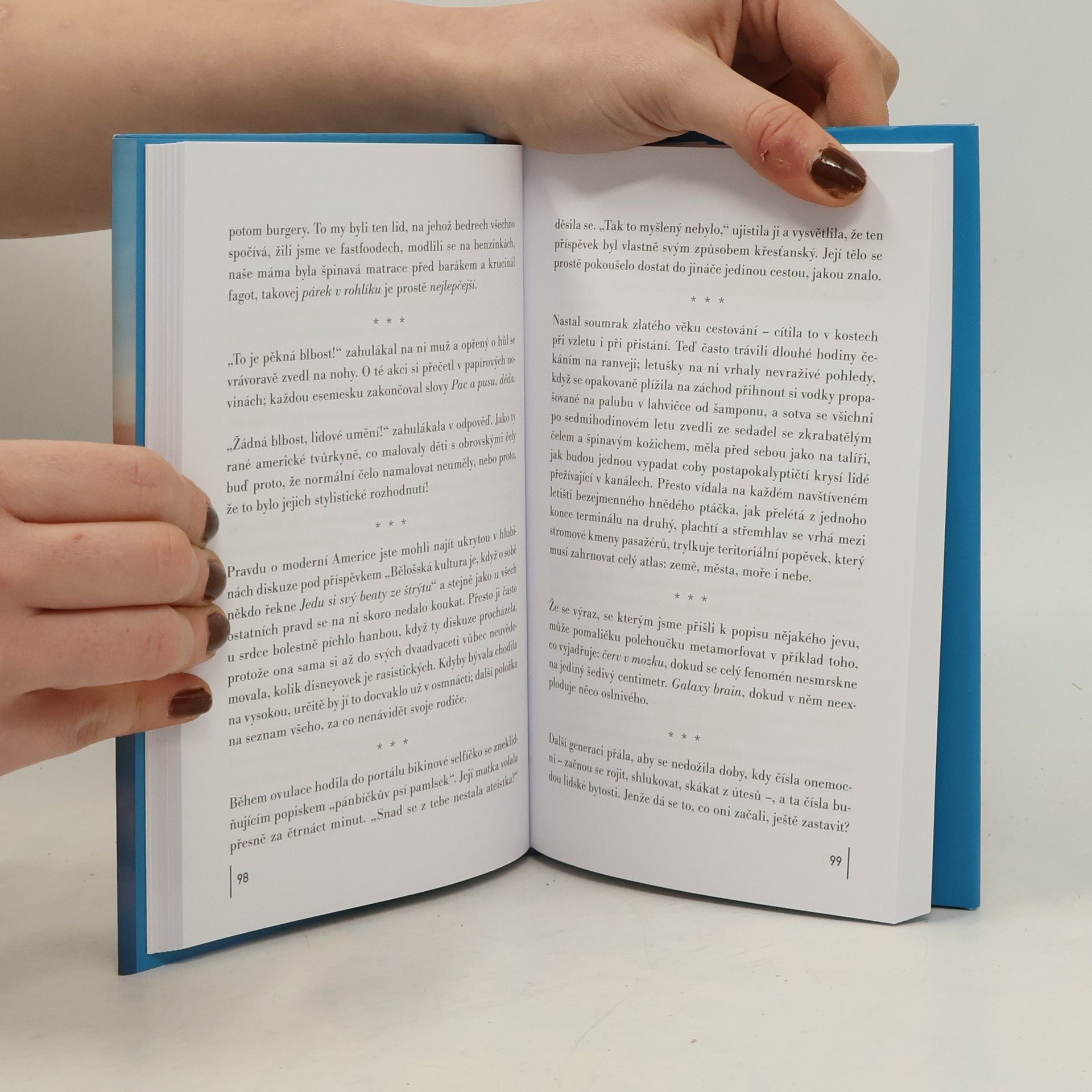 Prozaická prvotina americké básnířky je silnou výpovědí o naší současnosti, kterou pohání a formuje náladový svět sociálních médií – ona hyperrealita, zakusující se do vlastního ocasu, jež svou demokratizací hlasů ve veřejném prostoru, relativizací a vyprázdněností pojmů ovlivňuje události ve skutečném světě. Kniha je rozdělená na dvě části, které jsou svým zaměřením diametrálně odlišné, kladou proti sobě svět reálný a virtuální. Ve skutečnosti představují jin a jang, spojené nádoby, dvě strany jedné mince. Ta první líčí život a myšlenky hlavní hrdinky, kterou bychom nejspíš označili nálepkou influencerka. Jsou to střípky skutečných událostí, jejich reflexe v nových médiích a úvahy, jimiž hrdinka komentuje dění kolem sebe. Ve druhé části se perspektiva mění: sestra hrdinky čeká dítě postižené Proteovým syndromem, které nemá šanci na dlouhodobé přežití. Vše se smrskne na nemocniční pokoj, na hluboké prožívání přítomnosti, snahu zachytit, vnímat a do paměti vtisknout každou vteřinu. To vše nám zprostředkovávají citlivé niterné postřehy, tolik kontrastující s přepjatou bombastičností hrdinčina virtuálního světa.