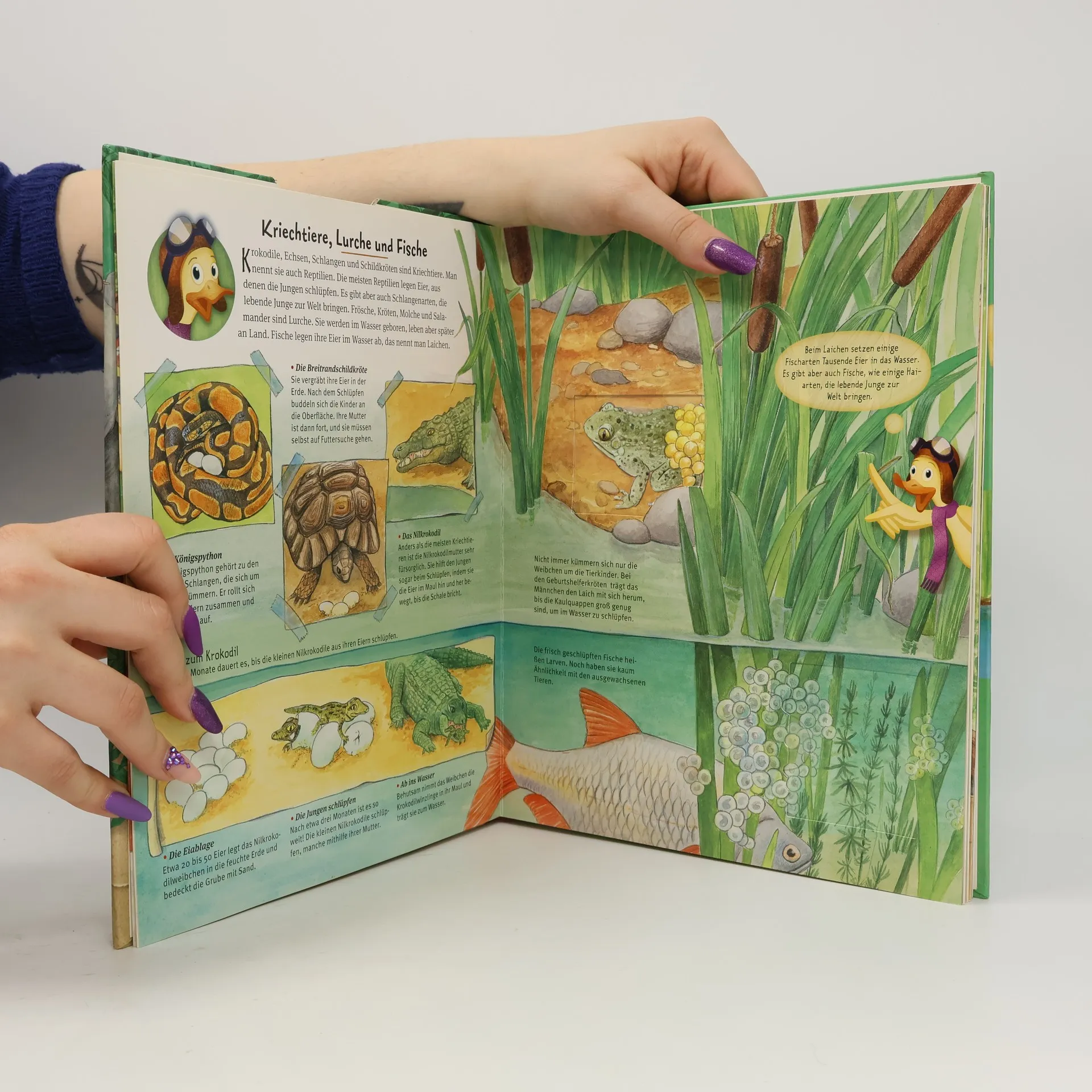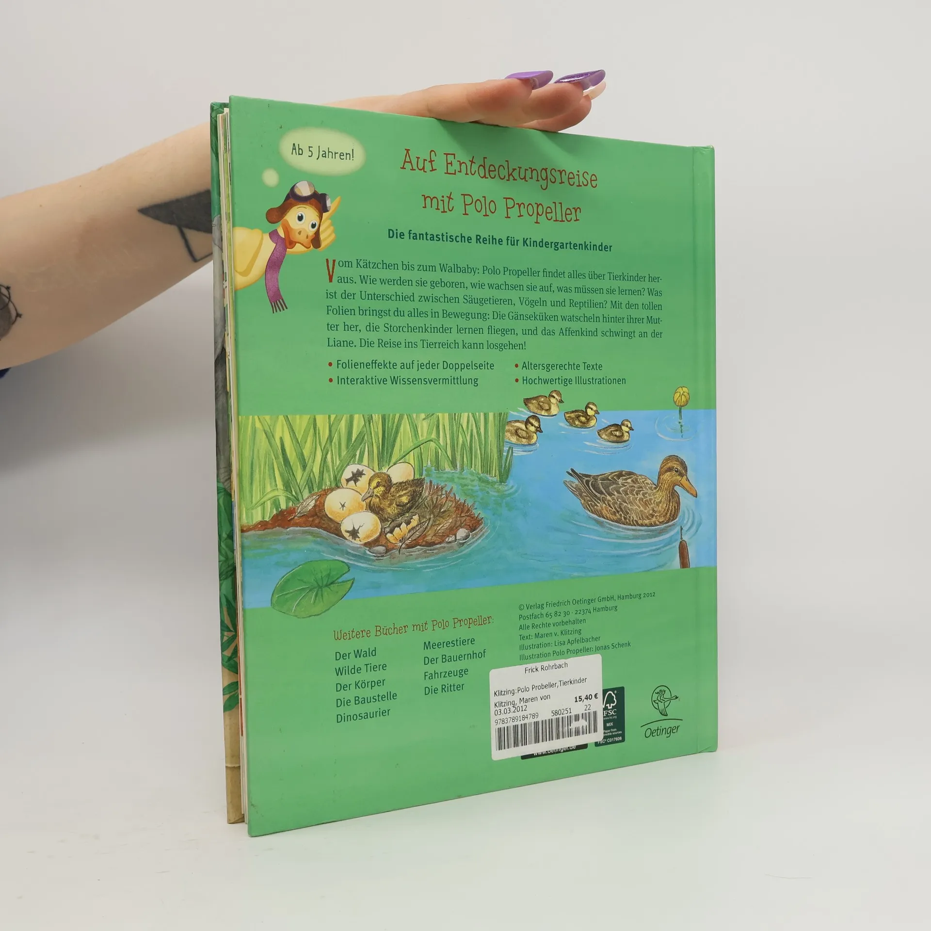 Jeder war mal klein! Mit Polo Propeller in die Kinderstuben der Tiere. Vom Kätzchen bis zum Walbaby, gemeinsam mit Polo Propeller besuchen die Kinder junge Tiere in Haus und Garten, in Wüste und Savanne, auf dem Land, auf dem Meer und in der Luft. Wie werden sie geboren, wie wachsen sie auf? Mithilfe der Ziehfolien bringen die Kinder Bewegung in den Alltag der kleinen Tiere. Die Gänseküken watscheln hinter ihrer Mama her, die Storchenkinder lernen fliegen und das Affenkind schwingt an der Liane. Dieses umfangreiche, großformatige Mitmach-Sachbuch für Kindergartenkinder zeigt Tierkinder zum Liebhaben und bietet Ziehfolien auf jeder Doppelseite, eine Drehscheibe sowie Lackierung und Prägung auf dem Cover. Mit Polo Propeller die Welt entdecken!