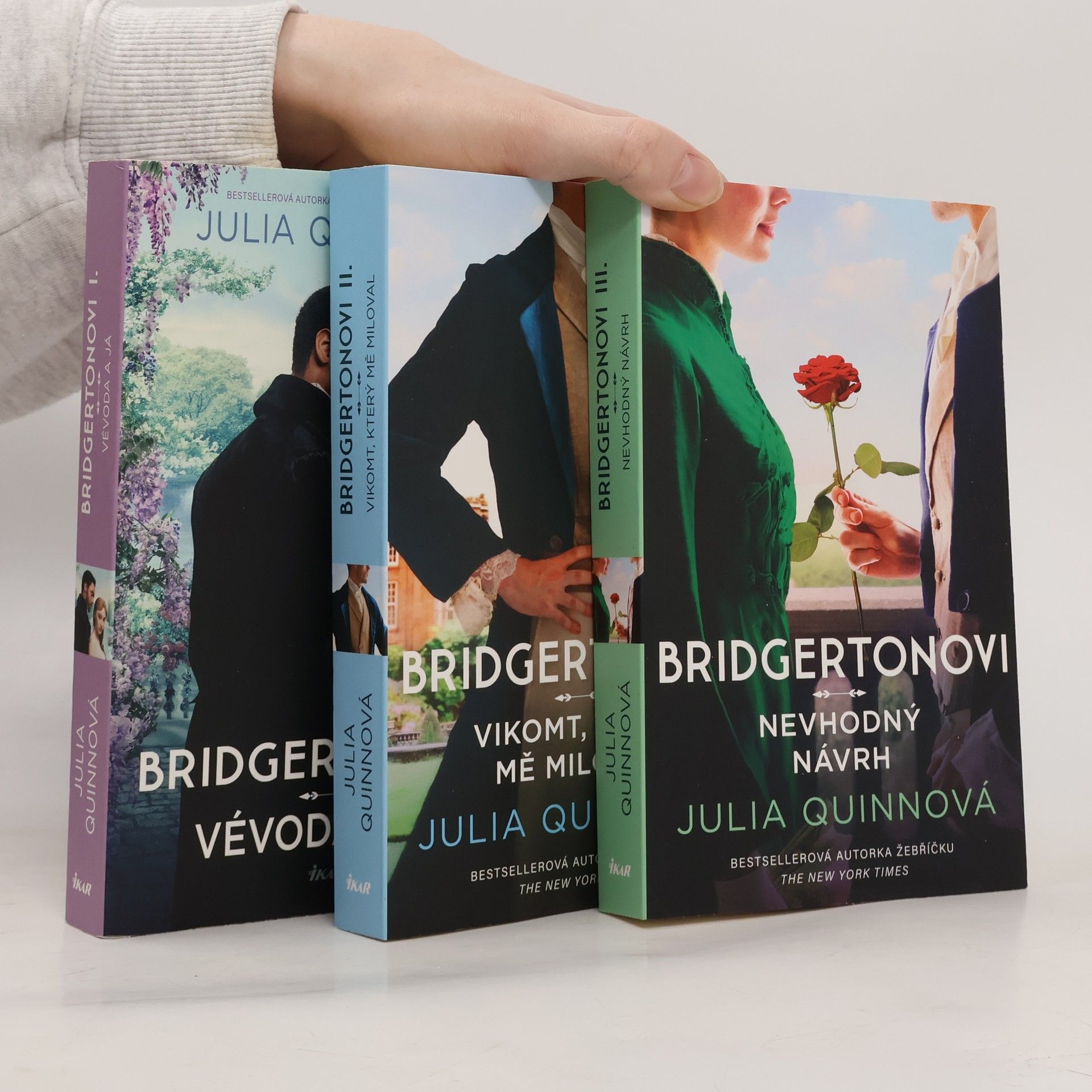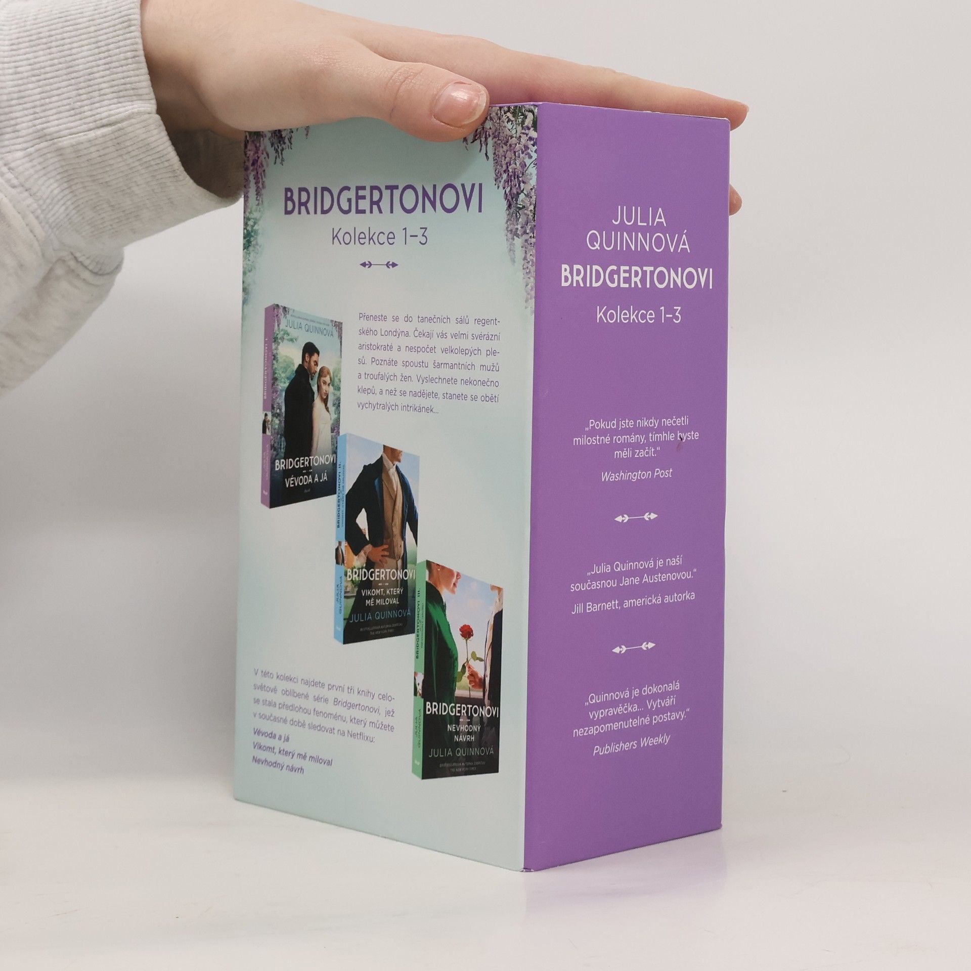 Přeneste se s tímto nápaditým boxem do tanečních sálů regentského Londýna. Čekají vás velmi svérázní aristokraté a nespočet zářivých plesů. Potkáte spoustu šarmantních mužů a troufalých žen, vyslechnete nekonečno klepů, a než se nadějete, stanete se obětí vychytralých intrikánek… V této sbírce na vás čekají první tři knihy – Vévoda a já; Vikomt, který mě miloval; Nevhodný návrh – celosvětově oblíbené série Bridgertonovi, jež se stala předlohou fenoménu, který můžete v současné době sledovat na Netflixu.