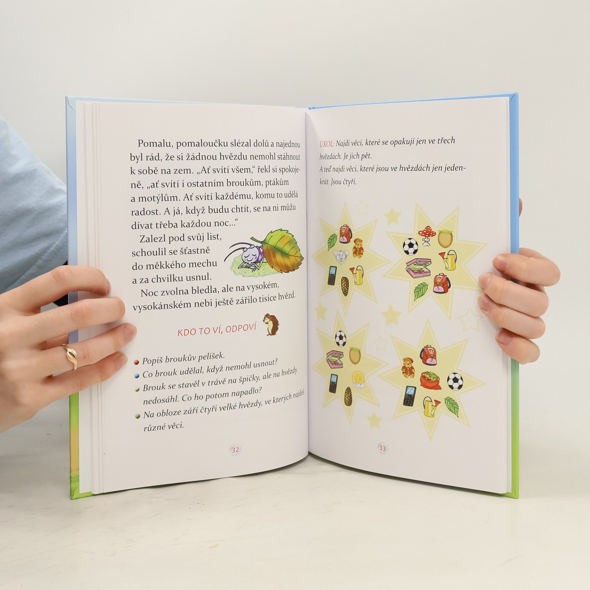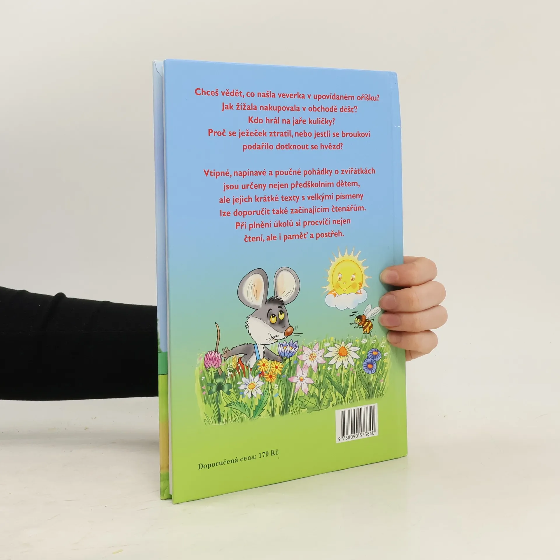 Chceš vědět, co našla veverka v upovídaném oříšku? Jak žížala nakupovala v obchodě déšť? Kdo hrál na jaře kuličky? Proč se ježeček ztratil, nebo jestli se broukovi podařilo dotknout se hvězd? Vtipné, napínavé a poučné pohádky o zvířátkách jsou určeny nejen předškolním dětem, ale jejich krátké texty s velkými písmeny lze doporučit také začínajícím čtenářům. Při plnění úkolů si procvičí nejen čtení, ale i paměť a postřeh.