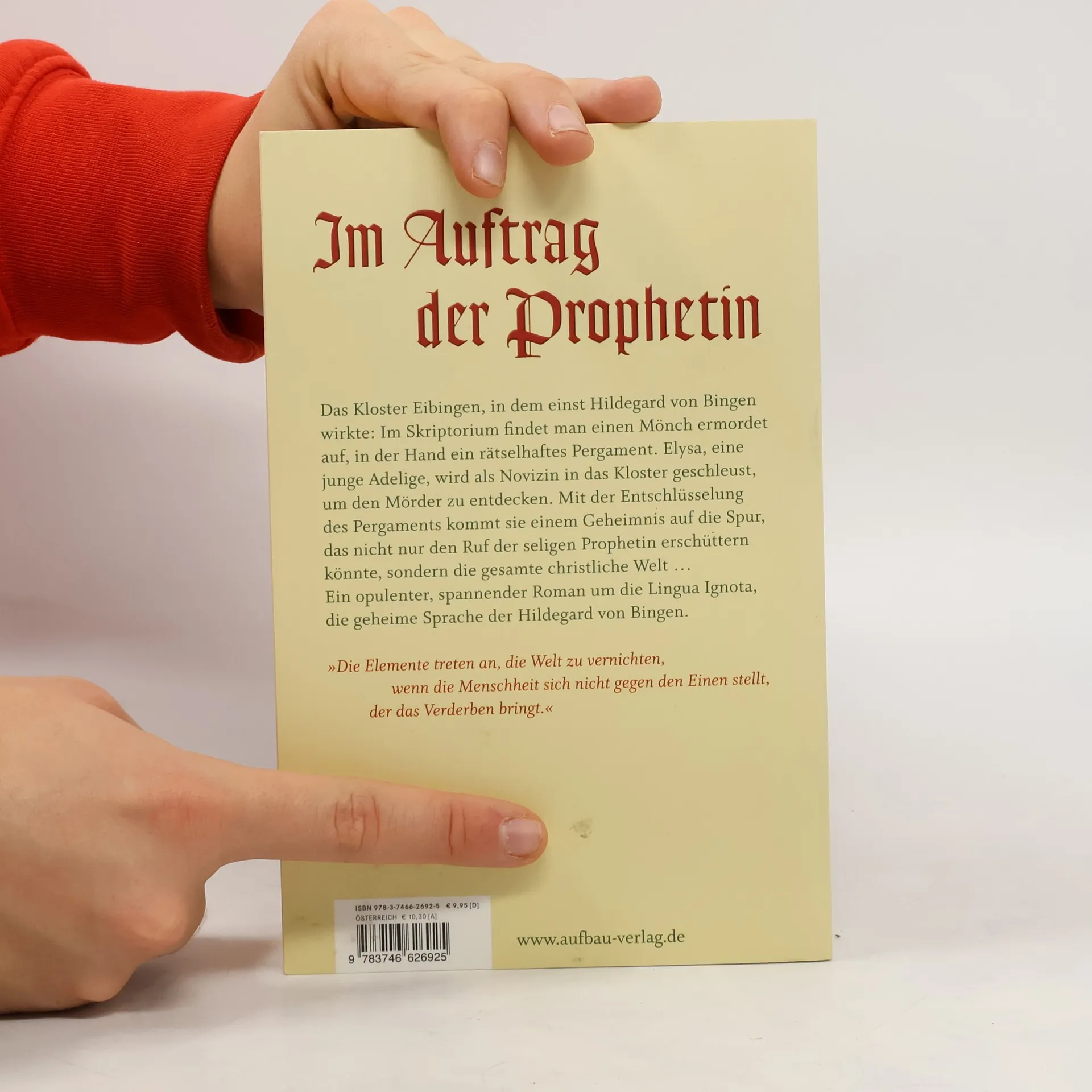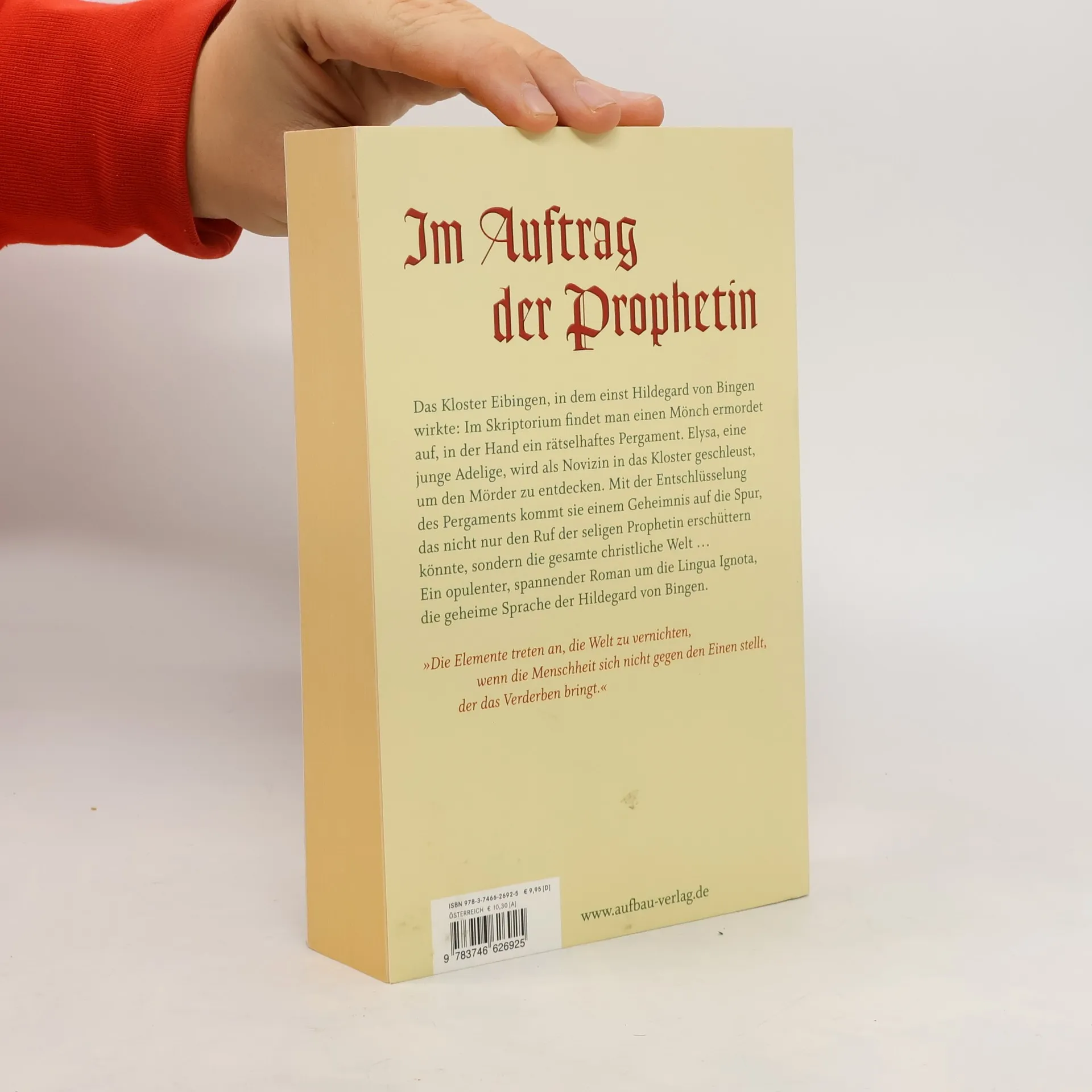 Im Auftrag der Prophetin§§Das Kloster Eibingen, in dem einst Hildegard von Bingen wirkte: Im Skriptorium findet man einen Mönch ermordet auf, in der Hand ein rätselhaftes Pergament. Elysa, eine junge Adelige, wird als Novizin in das Kloster geschleust, um den Mörder zu entdecken. Mit der Entschlüsselung des Pergaments kommt sie einem Geheimnis auf die Spur, das nicht nur den Ruf der seligen Prophetin erschüttern könnte, sondern die gesamte christliche Welt ...§§Ein opulenter, spannender Roman um die Lingua Ignota, die geheime Sprache der Hildegard von Bingen.§§'Die Elemente treten an, die Welt zu vernichten, wenn die Menschheit sich nicht gegen den Einen stellt, der das Verderben bringt.'