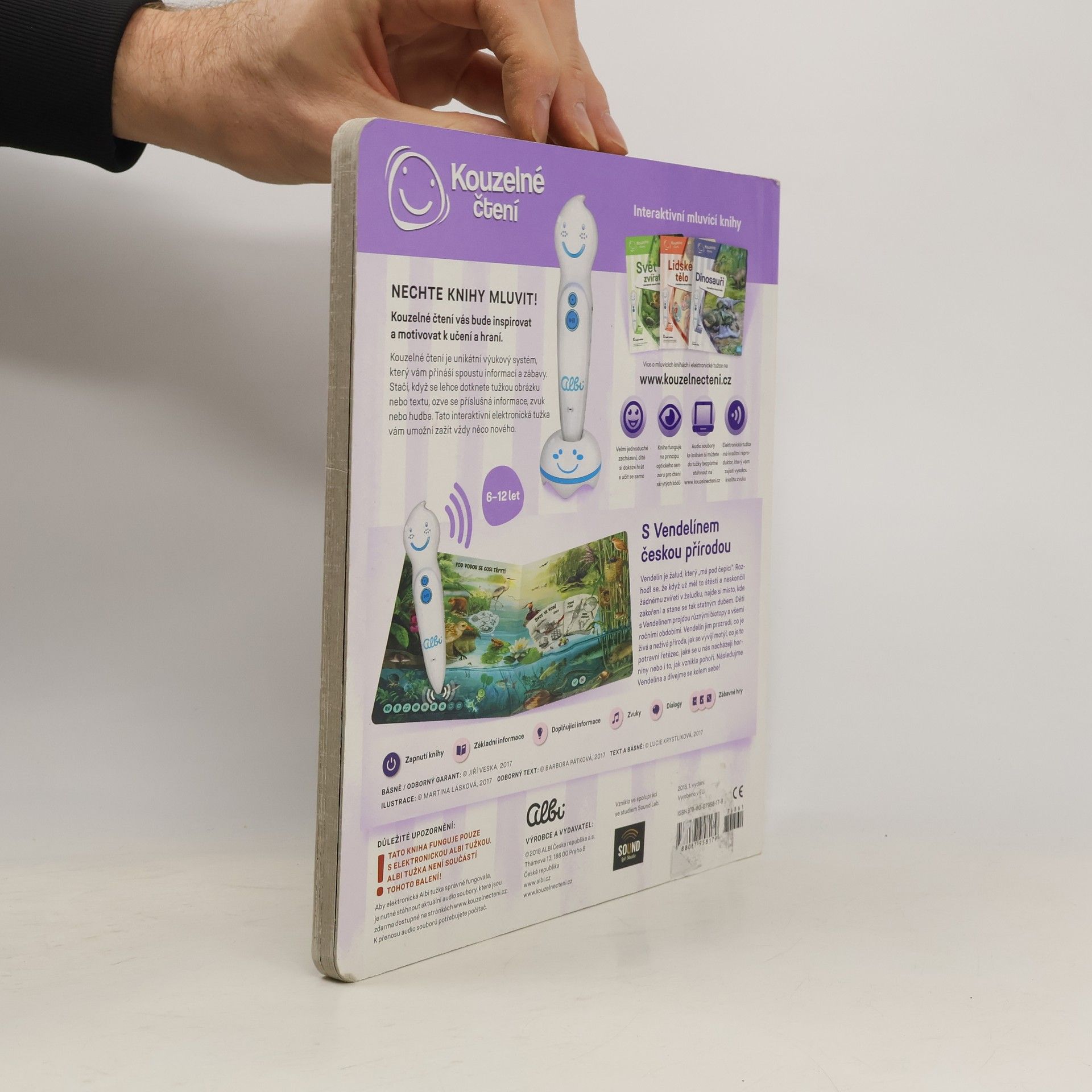 Interaktivní mluvící dětská kniha Hravá přírodověda z edice Kouzelné čtení seznámí děti od 6 let se základy přírodovědy. Knihou je provede žalud Vendelín, který se rozhodl, že když už měl to štěstí a neskončil žádnému zvířeti v žaludku, najde si místo, kde zakoření a stane se statným dubem. Děti si v knize s Vendelínem projdou různými biotopy a jejich základními složkami. Vendelín jim prozradí co je živá a neživá příroda, jak se vyvíjí motýl, co je to potravní řetězec, jaké se u nás nacházejí horniny, co se dozvíme z letokruhů stromů a spoustu dalšího. V knize Hravá přírodověda nechybí kvízy ve 3 obtížnostech. Děti si tak můžou vybrat obtížnost a ověřit si, co si z knihy zapamatovaly. Těšit se můžete také na dialogy a básničky, které děti uslyší nejen od vypravěčů, ale i od samotného Vendelína. Namluvili: Veronika Khek Kubařová, Václav Neužil a Jaroslav Plesl Ilustrace: Martina Lásková Text: Barbora Pátková, Lucie Krystlíková Odborná garance a básničky: Jiří Veska