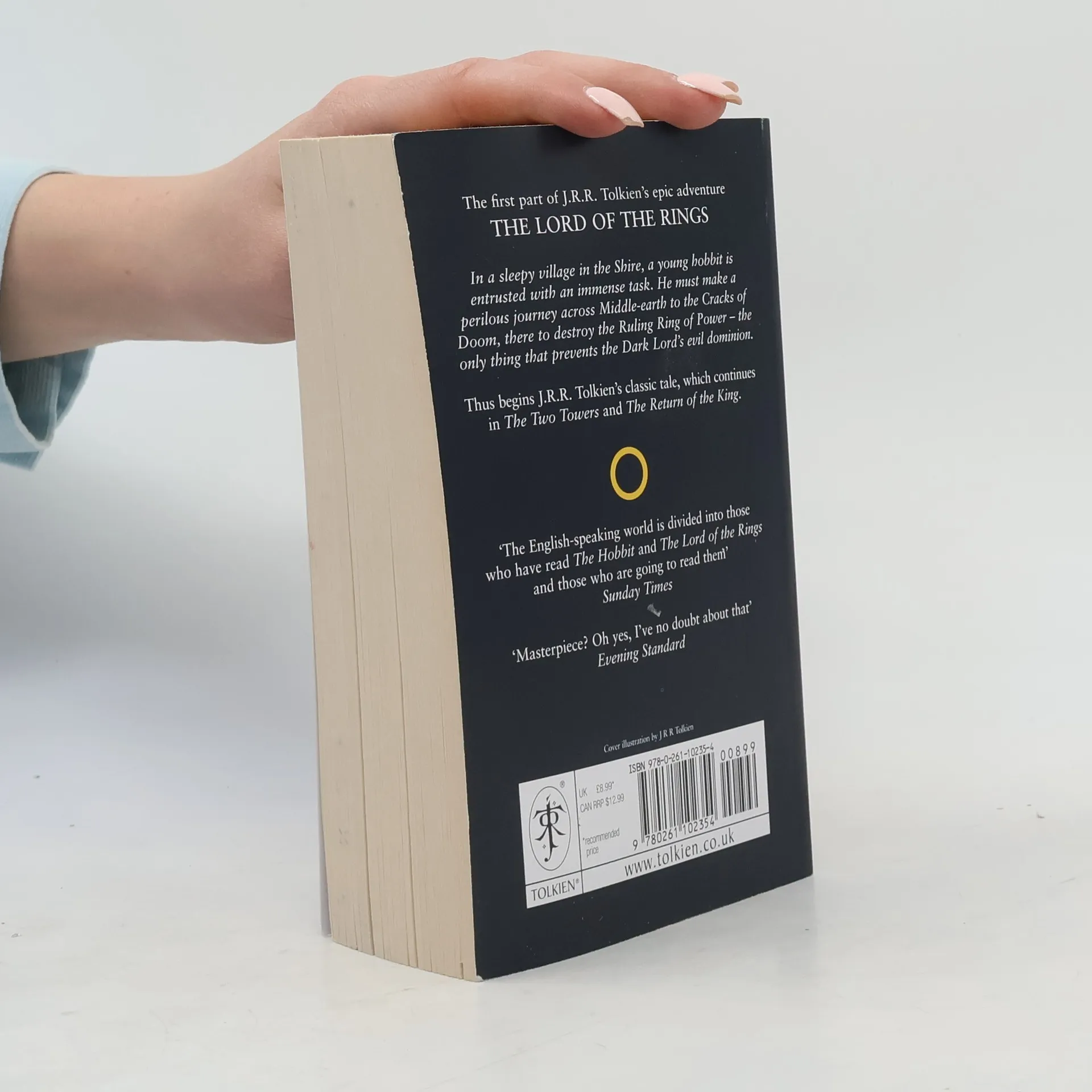 Continuing the story begun in The Hobbit, this is the first part of Tolkien s epic masterpiece, The Lord of the Rings, featuring a striking black cover based on Tolkien s own design, the definitive text, and a detailed map of Middle-earth. Sauron, the Dark Lord, has gathered to him all the Rings of Power the means by which he intends to rule Middle-earth. All he lacks in his plans for dominion is the One Ring the ring that rules them all which has fallen into the hands of the hobbit, Bilbo Baggins. In a sleepy village in the Shire, young Frodo Baggins finds himself faced with an immense task, as his elderly cousin Bilbo entrusts the Ring to his care. Frodo must leave his home and make a perilous journey across Middle-earth to the Cracks of Doom, there to destroy the Ring and foil the Dark Lord in his evil purpose. Part of a set of three paperbacks, this popular edition is once again available in its classic black livery designed by Tolkien himself."
