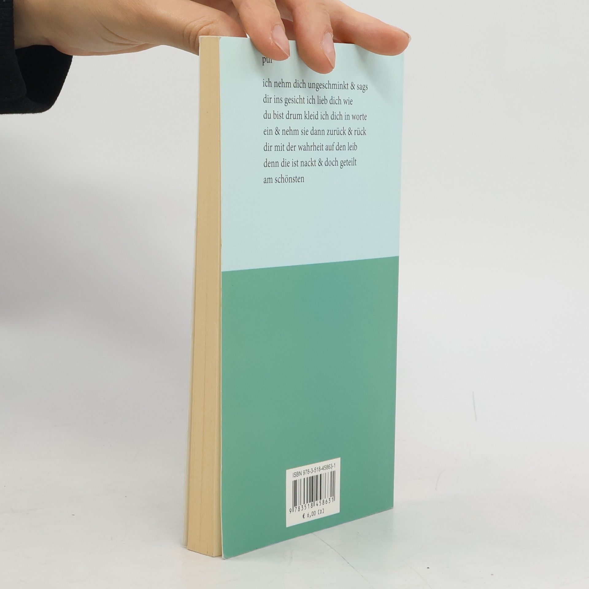 abtropfen wenn unsre lippen augen haben hör besser auf mich anzusehen & schmink dir diese blicke ab die an mir kleben bleiben werd ich nie was soll die augenwischerei uns bindet nur die haut & die hat sich genug erregt lass mich dich trösten kann ich nicht zum weinen hab ich nur spucke übrig