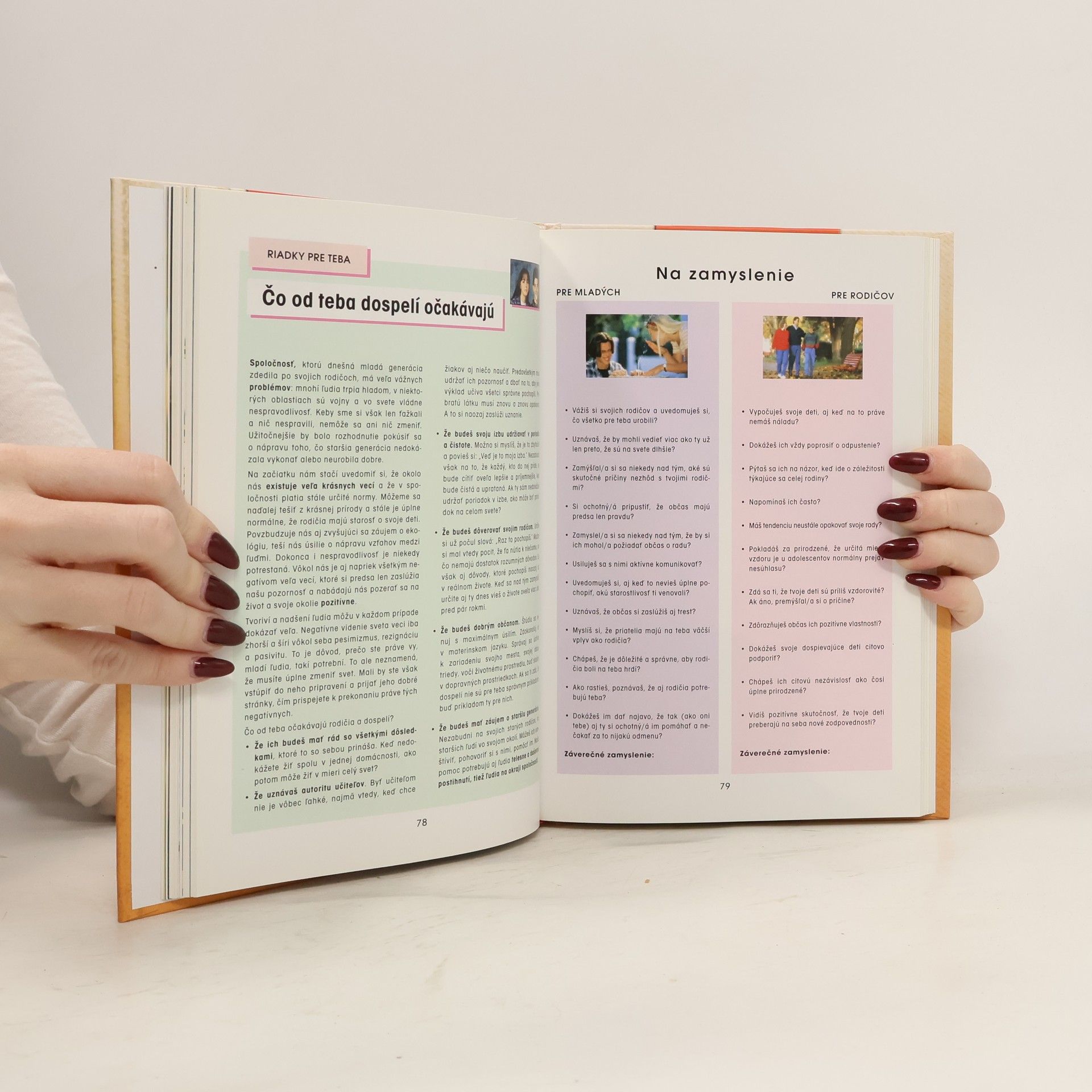 Kapitoly na témy: Dospievanie-mimoriadna životná kapitola, Štúdium a budúcnosť, V rodine, Medzi kamarátmi, Láska, city, osobnosť, O drogách, Kapitola (nielen) o sexe, Kadiaľ a kam - alebo o životných hodnotách.
