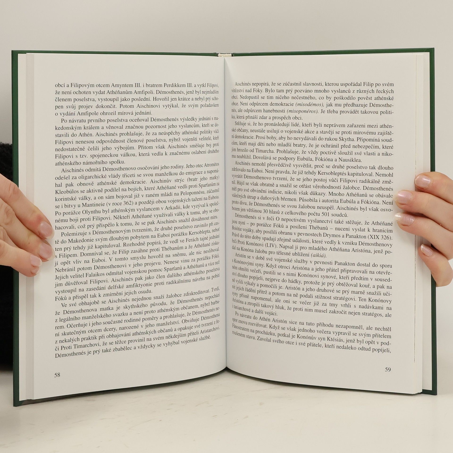 Démosthenés (384–322 př. Kr.) je považován za největšího řečníka starověku, a to nejen pro svůj řečnický styl. Svůj život a dílo spjal s politickými dějinami Athén a Řecka. Jako přívrženec demokracie vystupoval proti rostoucímu vlivu makedonského panovníka Filippa II. a proti makedonské expanzi, neboť jako první rozeznal nebezpečí ohrožující řeckou samostatnost. Podnítil vytvoření koalice řeckých států k boji proti Filippovi a postavil se do jejího čela. Jeho proslulé řeči, jimiž proti mocnému protivníkovi bojoval, byly proto pžíznačně nazvány filipikami. Po porážce koalice byl odsouzen k smrti a unikl jí vlastní rukou. Pod jeho jménem se dochoval impozantní soubor 60 řečí a dalších textů. Osobitým stylem, formální dokonalostí a myšlenkovým obsahem ovlivnil vývoj řečnictví jako žánru a své obdivovate/ale a následovníky měl od antiky, počínaje největším římským řečníkem Ciceronem, až do novověku. Jeho řeči byly překládány a studovány jako vzor, stejně tak byl hojně popisován a hodnocen jeho život a politická k