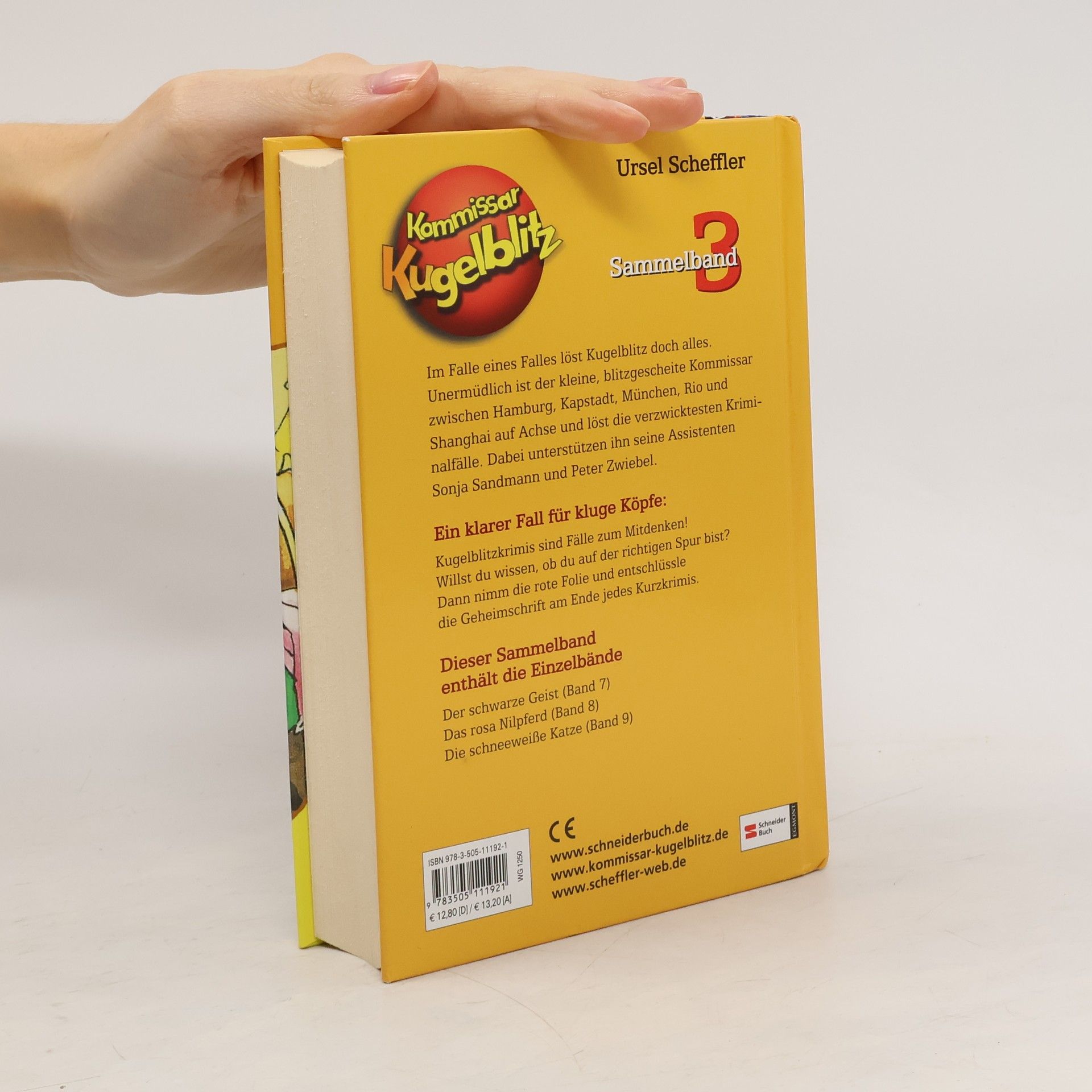Im Falle eines Falles löst Kugelblitz doch alles. Unermüdlich ist der kleine, blitzgescheite Kommissar zwischen Hamburg, Kapstadt, München, Rom und Taipeh auf Achse und löst die verzwicktesten Kriminalfälle. Ein klarer Fall für kluge Köpfe: Kugelblitzkrimis sind Fälle zum Mitdenken! Willst du wissen, ob du auf der richtigen Spur bist? Dann nimm die rote Folie und entschlüssle die Geheimschrift am Ende jedes Kurzkrimis. Dieser Sammelband enthält die Einzelbände: Der schwarze Geist (Band 7), Das rosa Nilpferd (Band 8), Die schneeweiße Katze (Band 9)