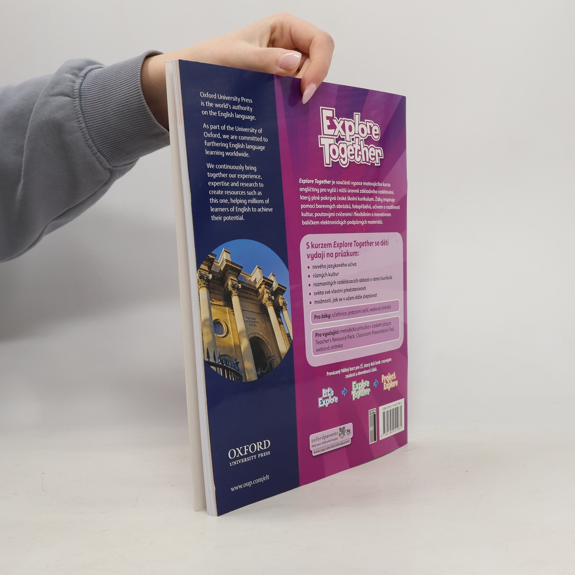 Série Let’s Explore a Explore Together podporují schopnost žáků chápat dnešní globalizovaný svět a pracují na rozvoji jejich hodnot a postojů. • žákům pomáhají lekce Numbers, festivalové lekce a stránky Explore more! • jazyk je vyučován zábavnou formou s pomocí různých postav a příběhů • Classroom Presentation Tool – obsahuje animované verze příběhů, videa ke kultuře a poslechové aktivity • pracovní listy ke kultuře, sebehodnoticí materiály a karty se slovní zásobou ke stažení Explore Together 1 je doplněn o Starter Booklet pro ty, kteří s angličtinou teprve začínají. Explore série je kompletní řada učebnic (1. – 9. ročník), která postupuje v souladu s vývojem žáků, a poskytuje tak odpovídající úroveň obtížnosti a podpory pro každou etapu základního vzdělávání. Vydejte se na cestu od Let’s Explore přes Explore Together až po Project Explore.