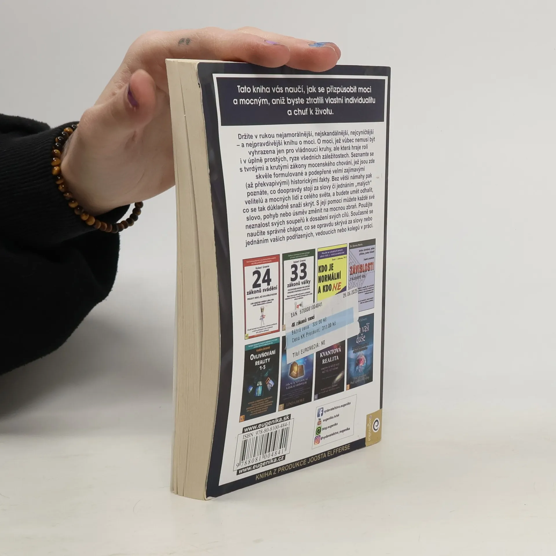 Kniha Roberta Greena z roku 1998 tematicky navazuje na Vladaře Niccola Machiavelliho a prezentuje zákony moci prostřednictvím reálných historických příběhů (např. Ludvík XIV., Talleyrand, Otto von Bismarck, Kateřina Veliká, Mao Ce-tung, Haile Selassie). Greene nechává čtenáře posoudit etiku používání těchto pravidel. Někteří ji považují za nástroj pro dosažení moci a úspěchu, jiní za praktickou příručku. Již dvě desetiletí je bestsellerem o moci a zůstává jednou z nejčtenějších knih na toto téma. Pokud se považujete za ambiciózní, kniha vás naučí rozpoznávat a ovládat myšlenky a přání druhých, což usnadní váš kariérní postup. Autor, expert na lidskou psychologii, poskytuje desítky příkladů správného jednání v konkrétních situacích a ukazuje, jak i z prohrané pozice lze směřovat k vítězství. Čtenář se seznámí s nestandardními metodami vyjednávání a řízení, přičemž každé tvrzení je podloženo konkrétními příklady. Kniha přehledně formuluje základní pravidla chování, která mají vědecký základ a doporučené postupy. S pomocí jejích rad můžete proměnit svá slova, pohyby či úsměvy na mocné nástroje. Naučíte se také správně chápat skryté úmysly za slovy a jednáním vašich kolegů či nadřízených.