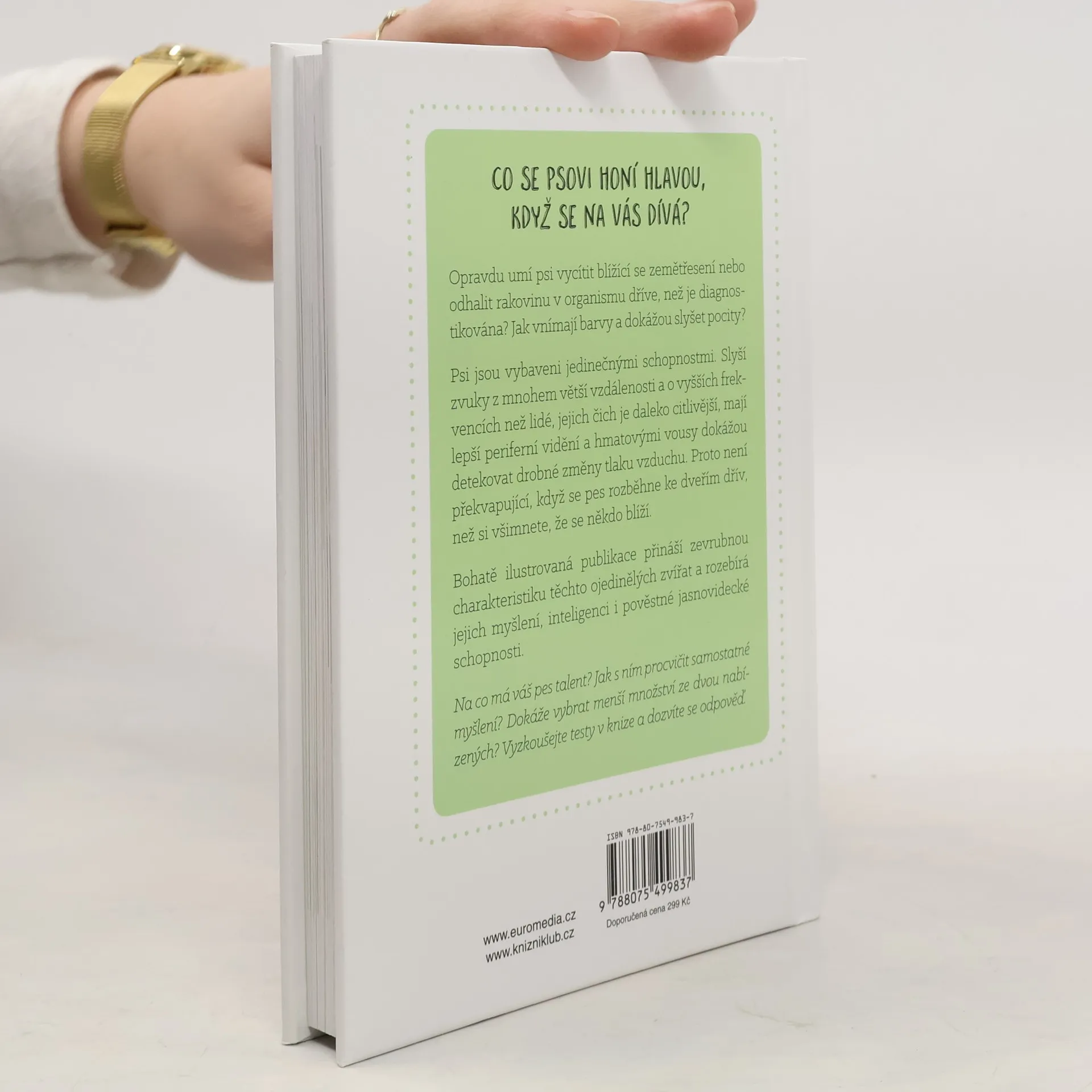 Pokud patříte k obvyklým majitelům psů, máte ke svému čtyřnohému příteli zhruba stejně blízký vztah jako ke kterémukoli jinému členu rodiny. Sdílíte s ním obvyklé každodenní činnosti, hrajete si i společně odpočíváte Kolik toho ale vlastně víte o tom, co se odehrává v jeho chlupaté hlavě? Předpokládáte, že jeho smysly jsou víceméně stejné jako lidské? Vědecké studie týkající se psů bývaly ještě nedávno vzácné, ale v současnosti už je naštěstí všechno jinak. Během posledních dvou dekád se dříve opomíjené výzkumné projekty na téma inteligence a vědomí psů vyšvihly na výsluní popularity. Rozličné univerzity po celém světě zakládají laboratoře pro výzkum chování psů a zabývají se nejrůznějšími aspekty psího vnímání a chování. Výsledky jejich práce přehledně shrnuje tato publikace.