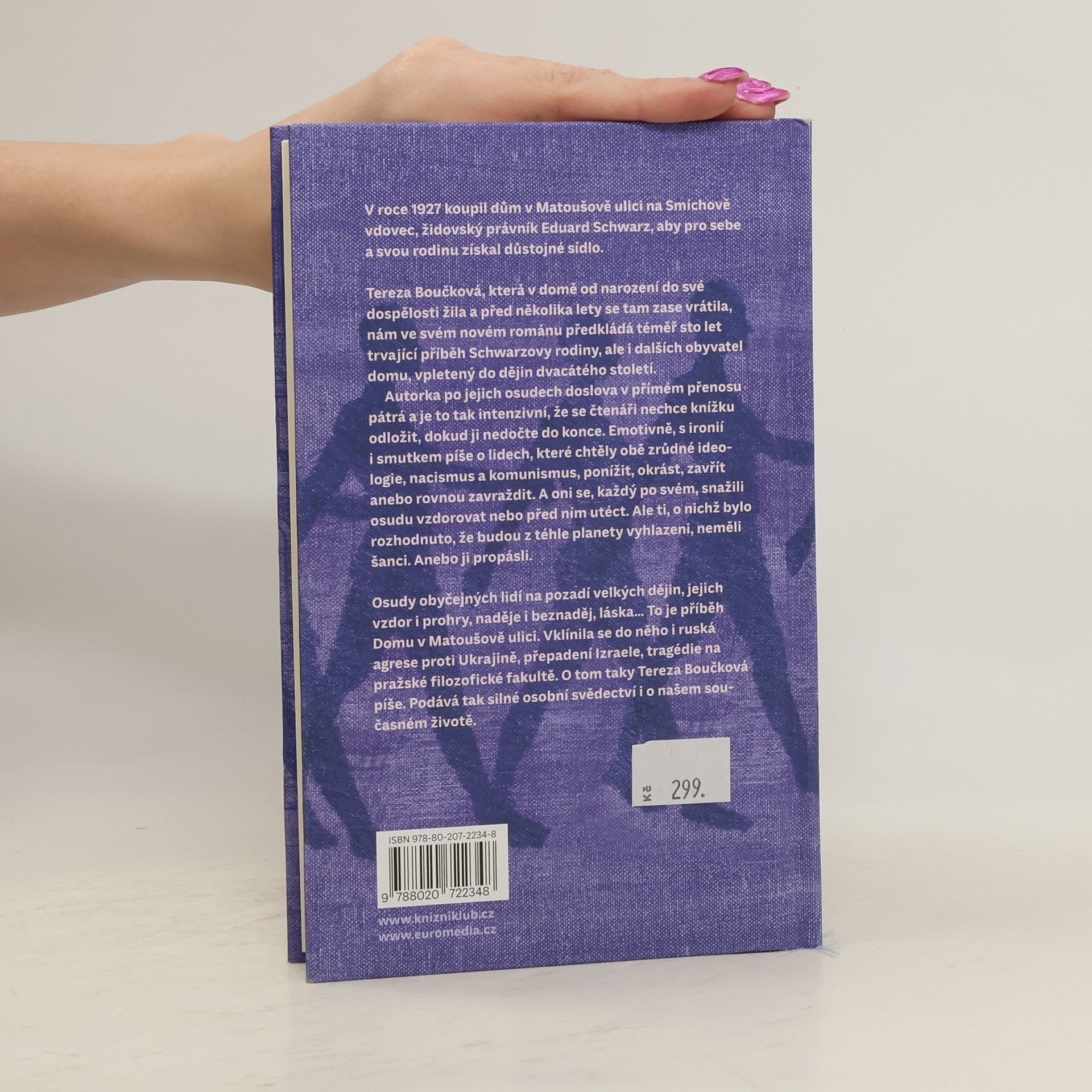 V roce 1927 koupil dům v Matoušově ulici na Smíchově vdovec, židovský právník Eduard Schwarz, aby pro sebe a svou rodinu získal důstojné sídlo. Měl štěstí, že zemřel dřív než začala druhá světová válka. Tereza Boučková, která v domě od narození do své dospělosti žila a před několika lety se tam zase vrátila, nám ve svém románu předkládá téměř sto let trvající příběh Schwarzových potomků, ale i dalších obyvatel domu, vpletený do dějin dvacátého století. Autorka po jejich osudech doslova v přímém přenosu pátrá a je to tak intenzivní, že se čtenáři nechce knížku odložit, dokud ji nedočte do konce. Emotivně, s ironií, ale i smutkem píše o lidech, které chtěly obě zrůdné ideologie, nacismus a komunismus, ponížit, okrást, zavřít anebo zavraždit.