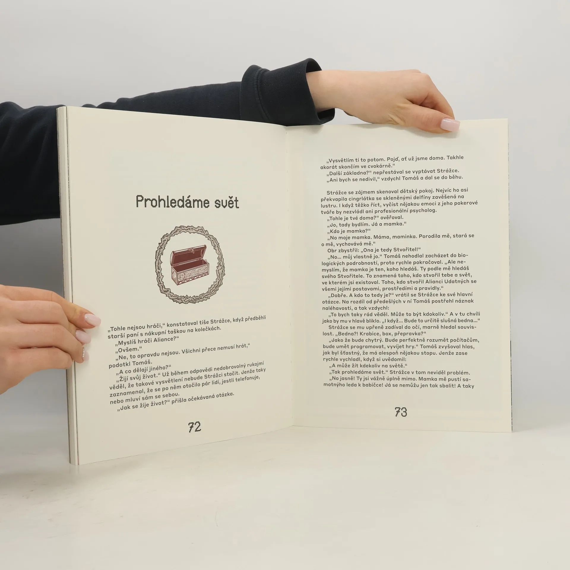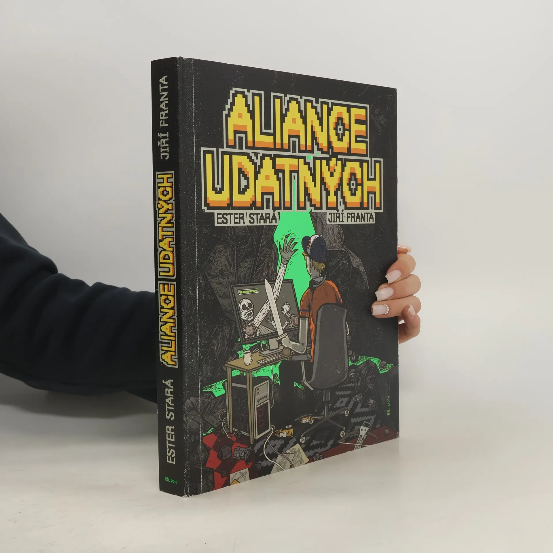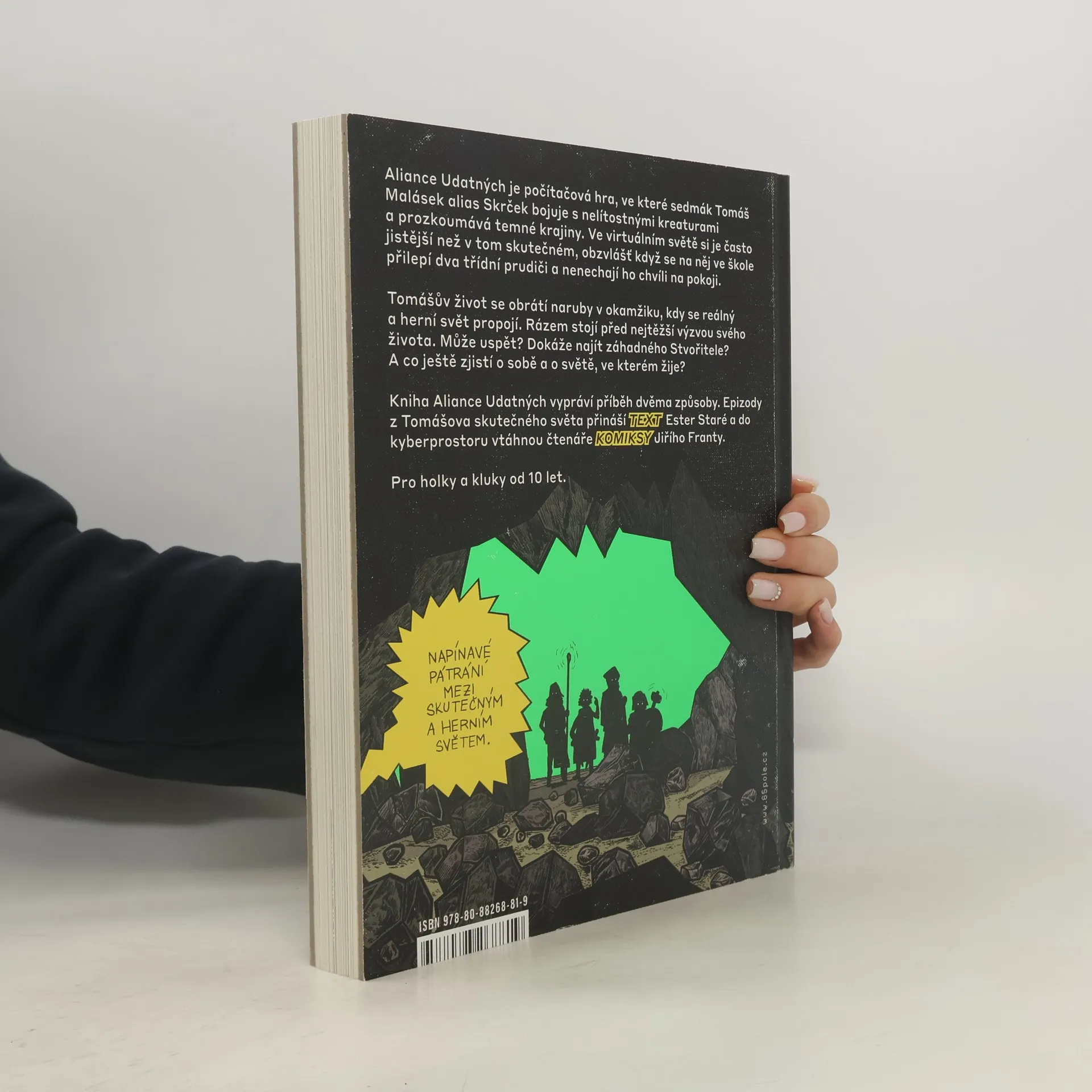 Napínavý příběh, ve kterém se prolíná svět počítačové hry Aliance udatných a skutečný svět jednoho hráče. Ve vyprávění se střídají akční komiksové epizody ze hry s prozaickým textem. Aliance udatných je počítačová hra, ve které sedmák Tomáš Malásek alias Skrček bojuje s nelítostnými kreaturami a prozkoumává temné krajiny. Ve virtuálním světě si je často jistější než v tom skutečném, obzvlášť když se na něj ve škole přilepí dva třídní prudiči a nenechají ho chvíli na pokoji. Tomášův život se obrátí naruby v okamžiku, kdy se reálný a herní svět propojí. Rázem stojí před nejtěžší výzvou svého života. Nakladatelská anotace. Kráceno.