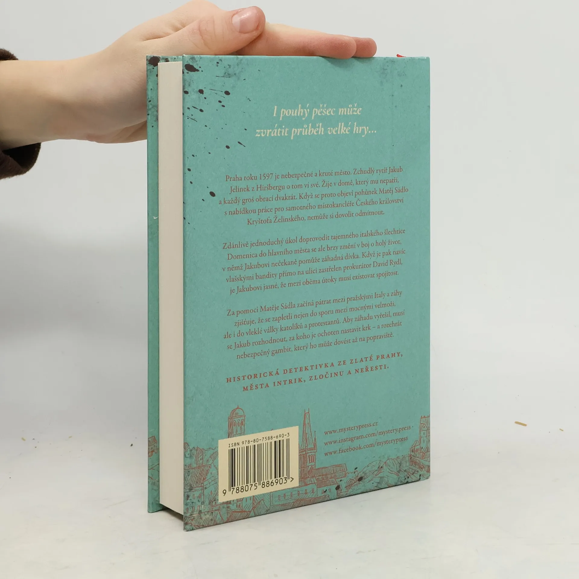 STRHUJÍCÍ HISTORICKÁ DETEKTIVKA ODEHRÁVAJÍCÍ SE V PRAZE ZA VLÁDY CÍSAŘE RUDOLFA II... Praha roku 1597 je nebezpečné a kruté město. Zchudlý rytíř Jakub Jelínek z Hiršbergu o tom ví své. Žije v domě, který mu nepatří, a každý groš obrací dvakrát. Když se proto objeví pohůnek Matěj Sádlo s nabídkou práce pro samotného místokancléře Českého království Kryštofa Želinského, nemůže si dovolit odmítnout. Zdánlivě jednoduchý úkol doprovodit tajemného italského šlechtice Domenica do hlavního města se ale brzy změní v boj o holý život, v němž Jakubovi nečekaně pomůže záhadná dívka. Když je pak navíc vlašskými bandity přímo na ulici zastřelen prokurátor David Rydl, je Jakubovi jasné, že mezi oběma útoky musí existovat spojitost. Za pomoci Matěje Sádla začíná pátrat mezi pražskými Italy a záhy zjišťuje, že se zapletli nejen do sporu mezi mocnými velmoži, ale i do vleklé války katolíků a protestantů. Aby záhadu vyřešil, musí se Jakub rozhodnout, za koho je ochoten nastavit krk – a rozehrát nebezpečný gambit, který ho může dovést až na popraviště.