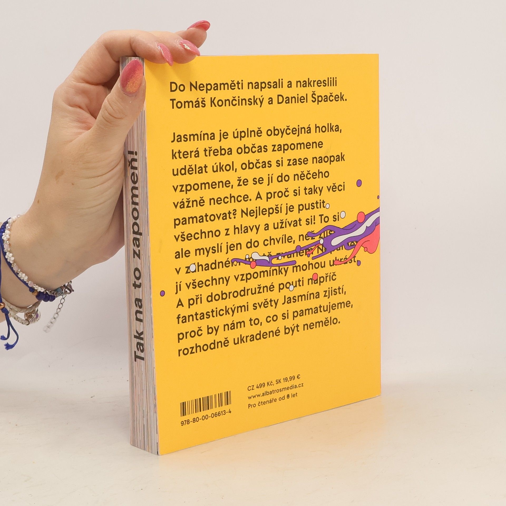 "Napínavý příběh z říše poztrácených vzpomínek od držitelů ceny Magnesia Litera." Jasmína je úplně obyčejná holka, která třeba občas zapomene udělat úkol, občas si zase naopak vzpomene, že se jí do něčeho vážně nechce. A proč si taky věci pamatovat? Nejlepší je pustit všechno z hlavy a užívat si! To si ale myslí jen do chvíle, než zjistí, že v záhadném místě zvaném Nepaměť jí všechny vzpomínky mohou ukrást. A při dobrodružné pouti napříč fantastickými světy Jasmína zjistí, proč by nám to, co si pamatujeme, rozhodně ukradené být nemělo.
