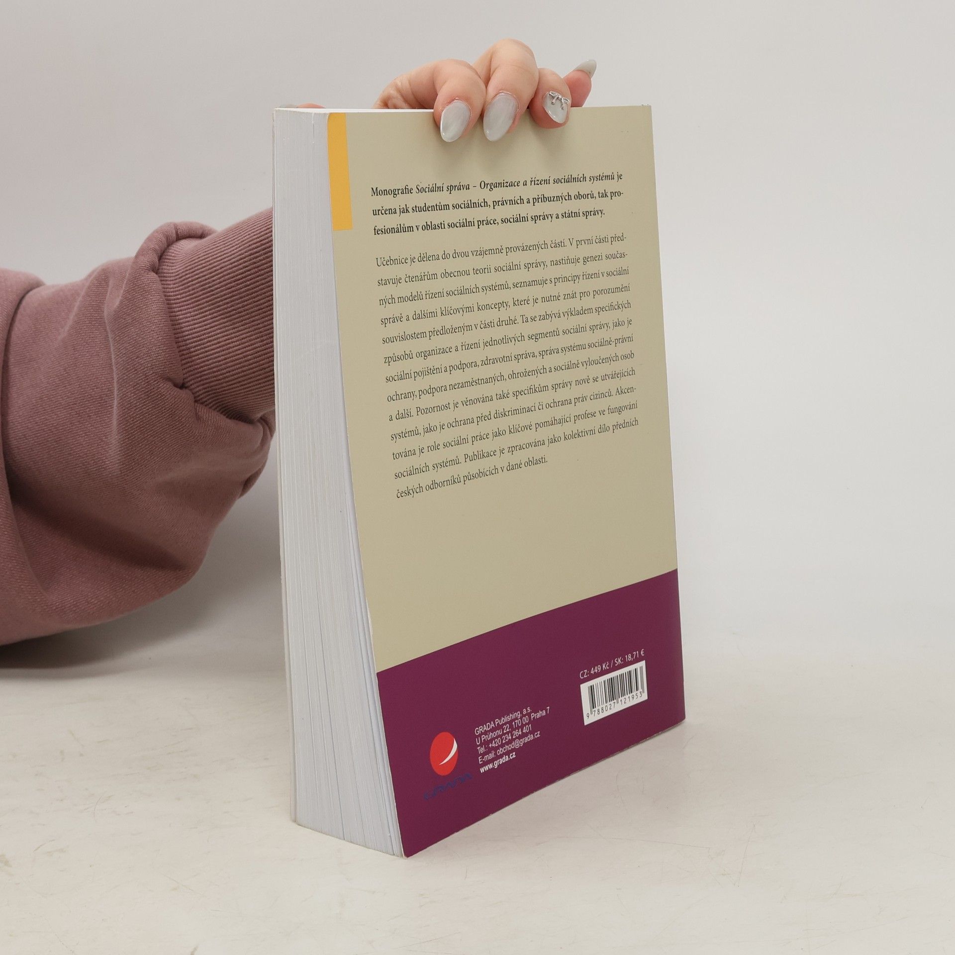 Monografie Sociální správa – Organizace a řízení sociálních systémů je určena jak studentům sociálních, právních a příbuzných oborů, tak profesionálům v oblasti sociální práce, sociální správy a státní správy. Učebnice je dělena do dvou vzájemně provázených částí. V první části představuje čtenářům obecnou teorii sociální správy, nastiňuje genezi současných modelů řízení sociálních systémů, seznamuje s principy řízení v sociální správě a dalšími klíčovými koncepty, které je nutné znát pro porozumění souvislostem předloženým v části druhé. Ta se zabývá výkladem specifických způsobů organizace a řízení jednotlivých segmentů sociální správy, jako je sociální pojištění a podpora, zdravotní správa, správa systému sociálně-právní ochrany, podpora nezaměstnaných, ohrožených a sociálně vyloučených osob a další. Pozornost je věnována také specifikům správy nově se utvářejících systémů, jako je ochrana před diskriminací či ochrana práv cizinců. Akcentována je role sociální práce jako klíčové pomáhající profese ve fungování sociálních systémů. Publikace je zpracována jako kolektivní dílo předních českých odborníků působících v dané oblasti.