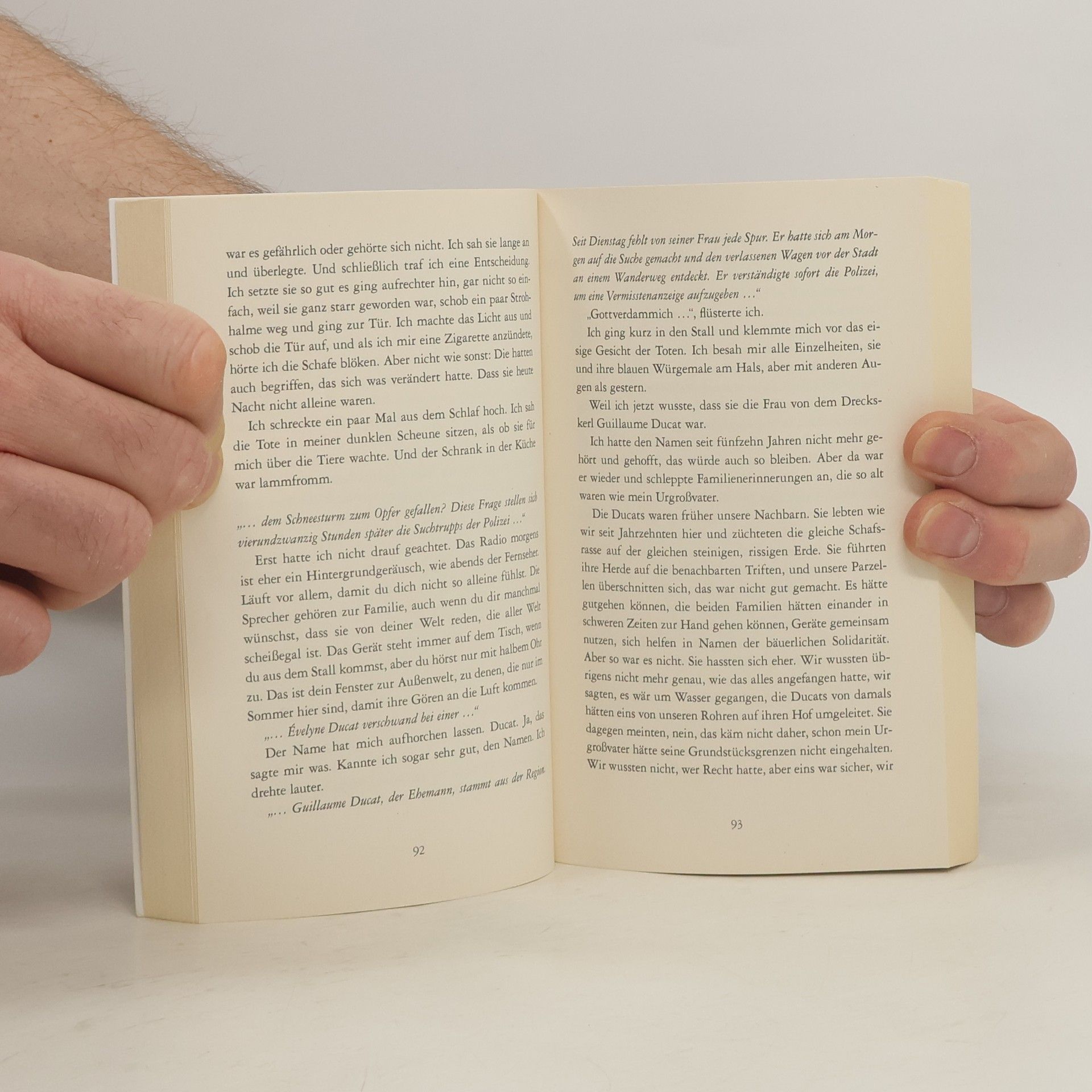 DEUTSCHER KRIMIPREIS 2021. Évelyne Ducat verschwindet eines Tages spurlos, und das Städtchen im französischen Zentralmassiv rätselt. Es kursieren Gerüchte und Beobachtungen. Doch nicht alles wird der Polizei preisgegeben, denn hier in der abgeschiedenen Bergwelt hüten die Menschen ihre Geheimnisse. Die Sozialarbeiterin Alice hat ein Geheimnis mit ihrem Klienten Joseph, dem einsamen Schafzüchter. Und der verhält sich nach dem Verschwinden der Frau merkwürdig. Und in welcher Beziehung stand die Verschwundene zu der jungen Maribé, die eines Tages im Städtchen auftauchte und alle Blicke auf sich zog? Mit jedem Kapitel erhält eine andere Person das Wort, und ein neues Geheimnis, ein neuer Verdacht taucht auf, bis sich das Puzzle um Évelyne Ducats Verschwinden zusammenfügt. Colin Niels preisgekrönter Roman noir ist mehr als ein raffiniert konstruierter Krimi: Er gibt ebenso fesselnd Einblick in prekäre soziale Milieus und erzählt von der verzweifelten Suche nach Liebe. Der Roman wurde von Dominik Moll fürs Kino verfilmt ("Die Verschwundene").