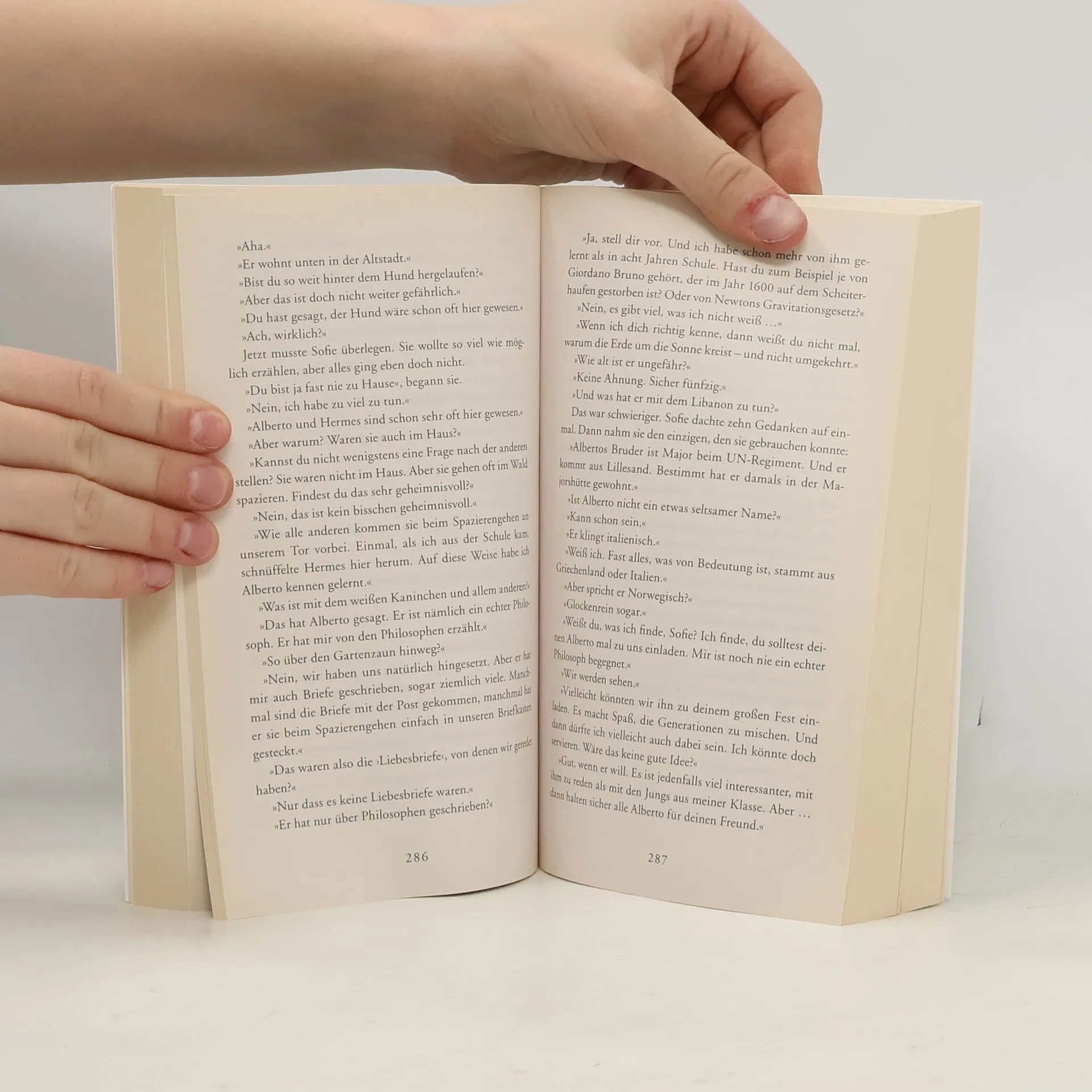 »Ein dickes Buch, mit spitzen Fingern angefaßt und mit Begeisterung zugeklappt: ein großer Wurf im wörtlichen wie übertragenen Sinn.« Die Zeit Mysteriöse Briefe landen im Briefkasten der 15jährigen Sofie Amundsen in Oslo. Was sollen diese Fragen: »Wer bist du?«, »Was ist ein Mensch?« und »Woher kommt die Welt?«. Sofie ist irritiert. Die Briefe werden ausführlicher und entführen sie in die abenteuerliche und geheimnisvolle Gedankenwelt der großen Philosophen. Ihr unbekannter Briefeschreiber erzählt Sofie die Geschichte Europas, der Antike, des Mittelalters und der Renaissance und dann nimmt die Geschichte eine unglaubliche Wendung.