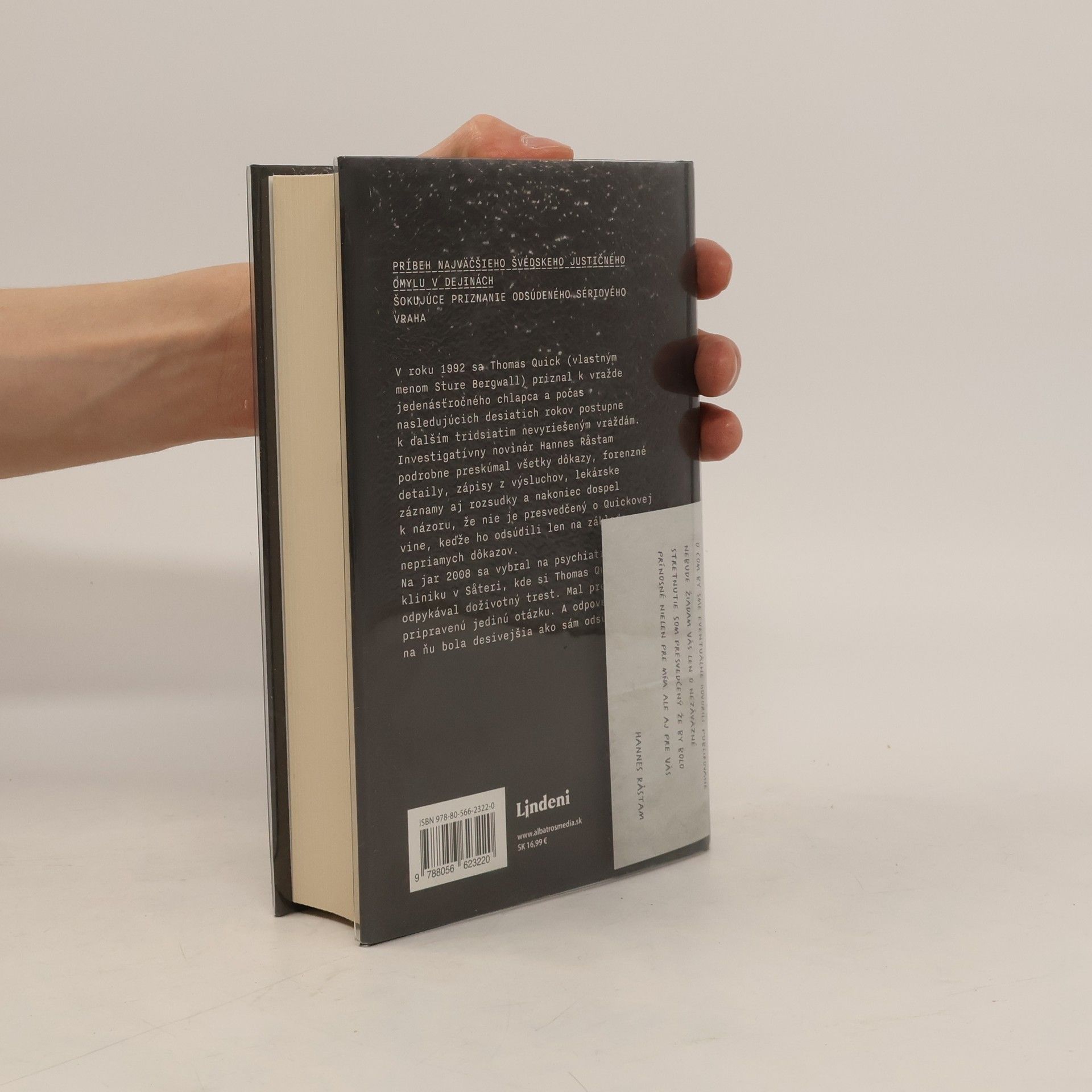 Príbeh najväčšieho švédskeho justičného omylu v dejinách. Šokujúce priznanie odsúdeného sériového vraha. V roku 1992 sa Thomas Quick (vlastným menom Sture Bergwall) priznal k vražde jedenásťročného chlapca a počas nasledujúcich desiatich rokov postupne k ďalším tridsiatim nevyriešeným vraždám. Investigatívny novinár Hannes Råstam podrobne preskúmal všetky dôkazy, forenzné detaily, zápisy z výsluchov, lekárske záznamy aj rozsudky a nakoniec dospel k názoru, že nie je presvedčený o Quickovej vine, keďže ho odsúdili len na základe nepriamych dôkazov. Na jar 2008 sa vybral na psychiatrickú kliniku v Säteri, kde si Thomas Quick odpykával doživotný trest. Mal preňho pripravenú jedinú otázku. A odpoveď na ňu bola desivejšia ako sám odsúdený...