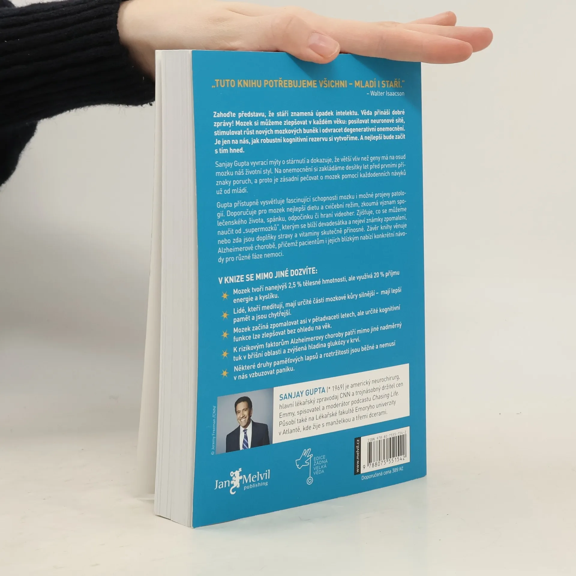 Zahoďte představu, že stáří znamená úpadek intelektu. Věda přináší dobré zprávy: mozek si můžeme zlepšovat v každém věku, posilovat neuronové sítě a odvracet degenerativní onemocnění. Klíčové je, jak robustní kognitivní rezervu si vytvoříme, a je nejlepší začít hned. Sanjay Gupta vyvrací mýty o stárnutí a ukazuje, že náš životní styl má větší vliv na osud mozku než geny. Onemocnění si zakládáme desítky let před prvními příznaky, proto je důležité pečovat o mozek už od mládí. Gupta přístupně vysvětluje fascinující schopnosti mozku a doporučuje nejlepší dietu a cvičební režim. Zkoumá význam společenského života, spánku a hraní videoher. Zjistí, co se můžeme naučit od „supermozků“ blížících se devadesátce, a zkoumá přínos doplňků stravy a vitaminů. Závěr knihy se věnuje Alzheimerově chorobě a nabízí konkrétní návody pro pacienty a jejich blízké. V knize se dozvíte, že mozek tvoří 2,5 % tělesné hmotnosti, ale využívá 20 % energie a kyslíku. Lidé, kteří meditují, mají silnější části mozkové kůry a lepší paměť. Mozek začíná zpomalovat kolem pětadvaceti let, ale kognitivní funkce lze zlepšovat bez ohledu na věk. Rizikovými faktory Alzheimerovy choroby jsou nadměrný břišní tuk a zvýšená hladina glukózy. Některé paměťové lapsy jsou běžné a nemusí vyvolávat paniku.
