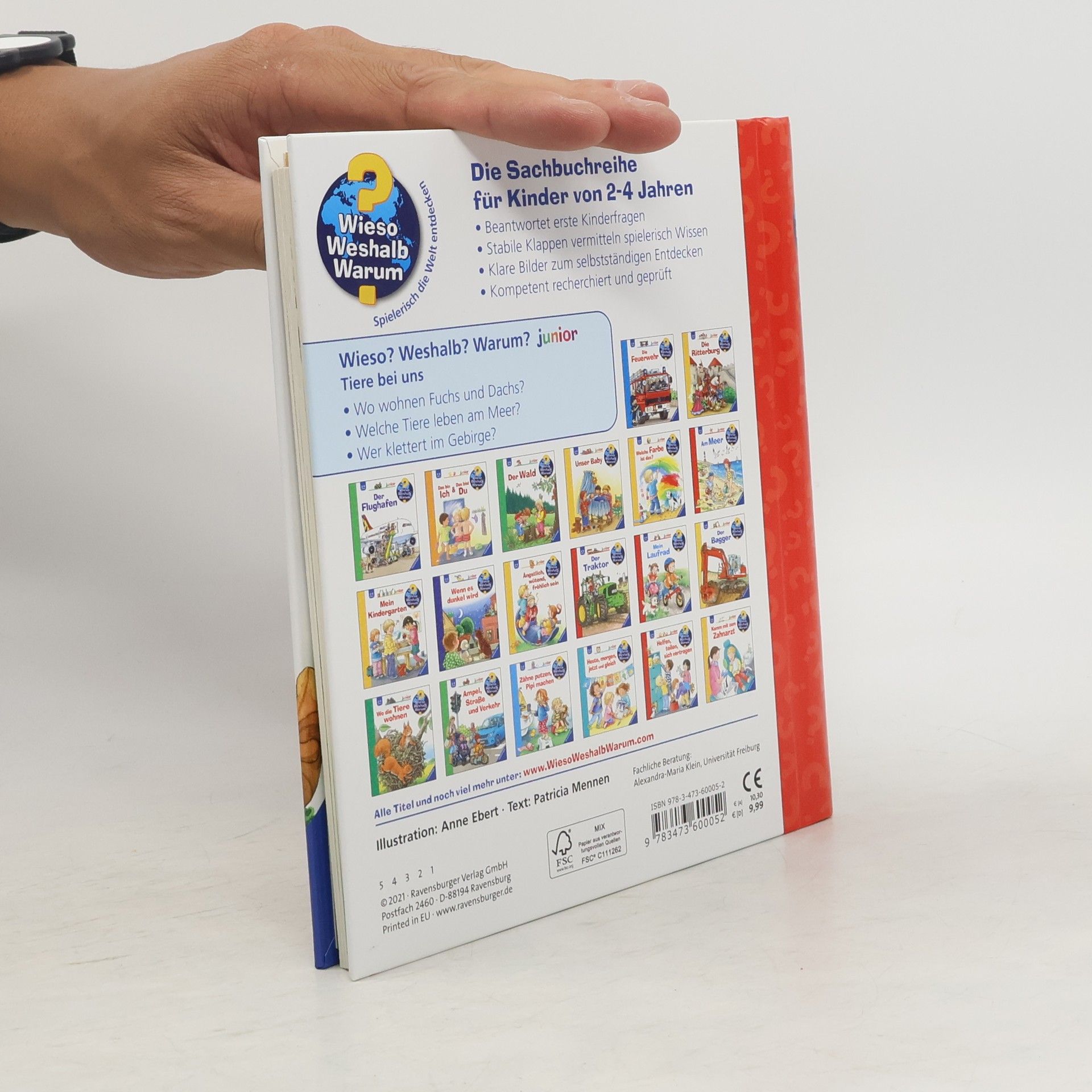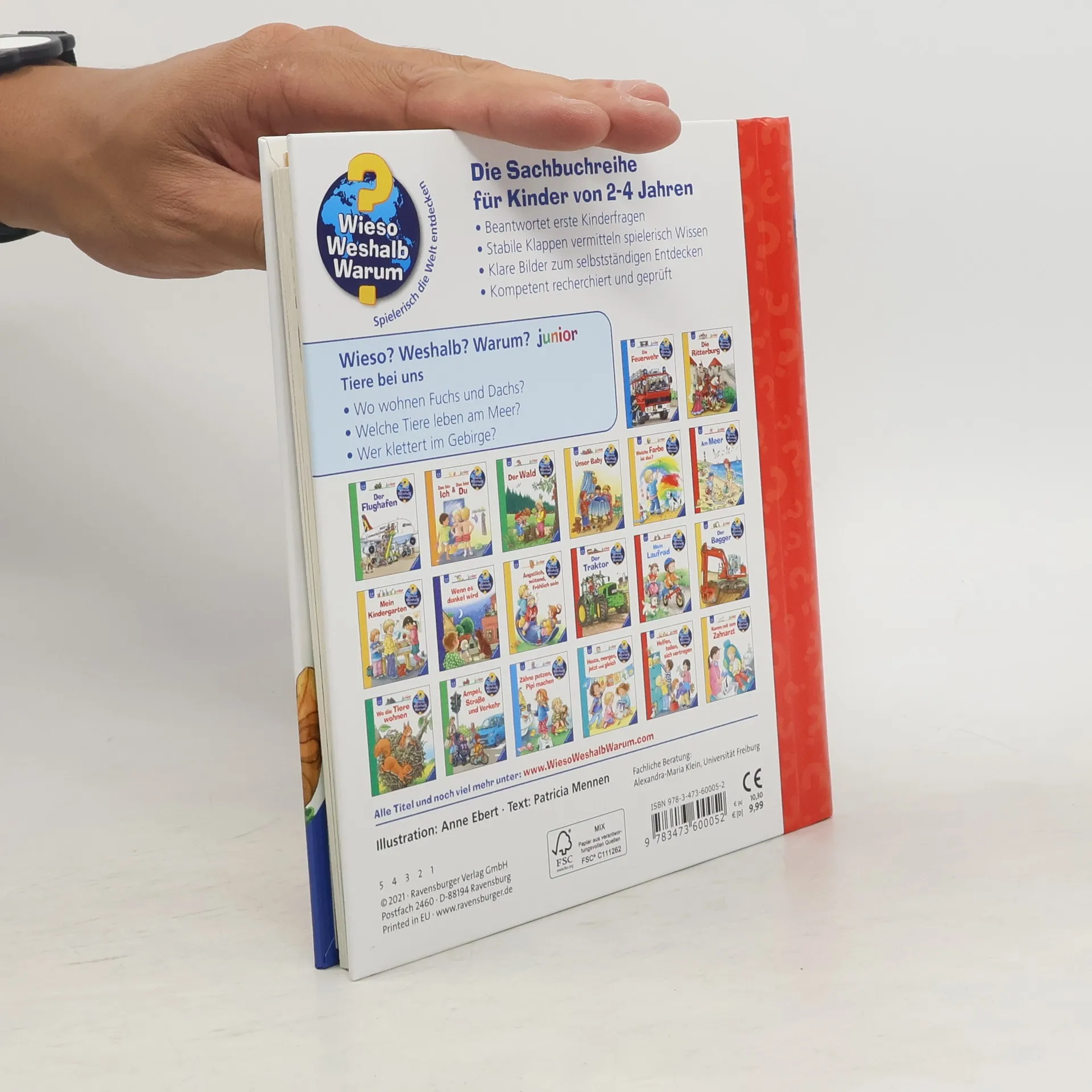 Wer flattert im Garten herum? Welche Tiere wohnen im Wald? Und wie leben die Tiere am Fluss? Dieses Buch steckt voller Antworten auf Kinderfragen rund um heimische Tiere. Detailreiche Bilder und viele überraschende Klappen zeigen die Vielfalt der heimischen Tiere im Wald, im Gebirge und an der Küste. Ob Entenküken im Park, Füchse auf der Lichtung oder Schmetterlinge auf der Wiese – hier ist für alle Tierfans ab 2 Jahren etwas dabei! Wieso? Weshalb? Warum? junior Die Sachbuchreihe für Kinder von 2-4 Jahren Jeden Tag entdecken Kinder etwas Neues – und haben viele Fragen. Wann kommt die Feuerwehr? Was machen die Tiere im Winter? Warum muss ich Zähne putzen? Die beliebte Sachbuchreihe Wieso? Weshalb? Warum? junior beantwortet die Fragen der Kinder auf Augenhöhe. Sie beleuchtet unterschiedlichste Themen aus ihrer Alltags- und Interessenswelt altersgerecht und mit viel Liebe zum Detail. Die Reihe ist speziell auf kleine Hände und die Bedürfnisse der Kleinsten angepasst. Klare und liebevolle Bilder, kurze Sachtexte sowie handliche Klappen, die Bewegungen veranschaulichen und überraschende und lustige Einblicke gewähren, ermöglichen Kindern, sich ihre Themen selbst zu erschließen. Der Spaß am eigenhändigen Entdecken, die liebevolle Umsetzung und die hochwertige Ausstattung garantieren langanhaltende Freude an jedem Buch.
